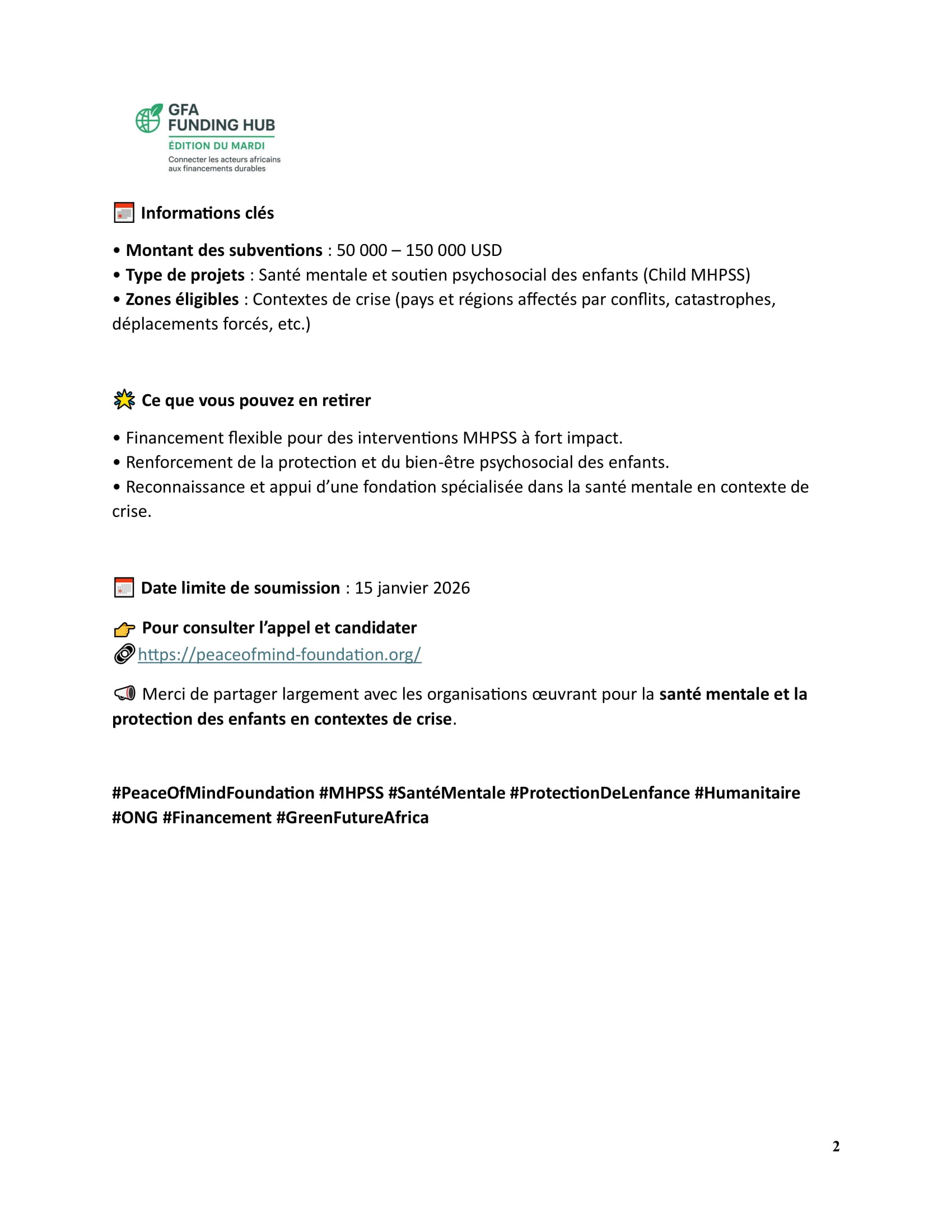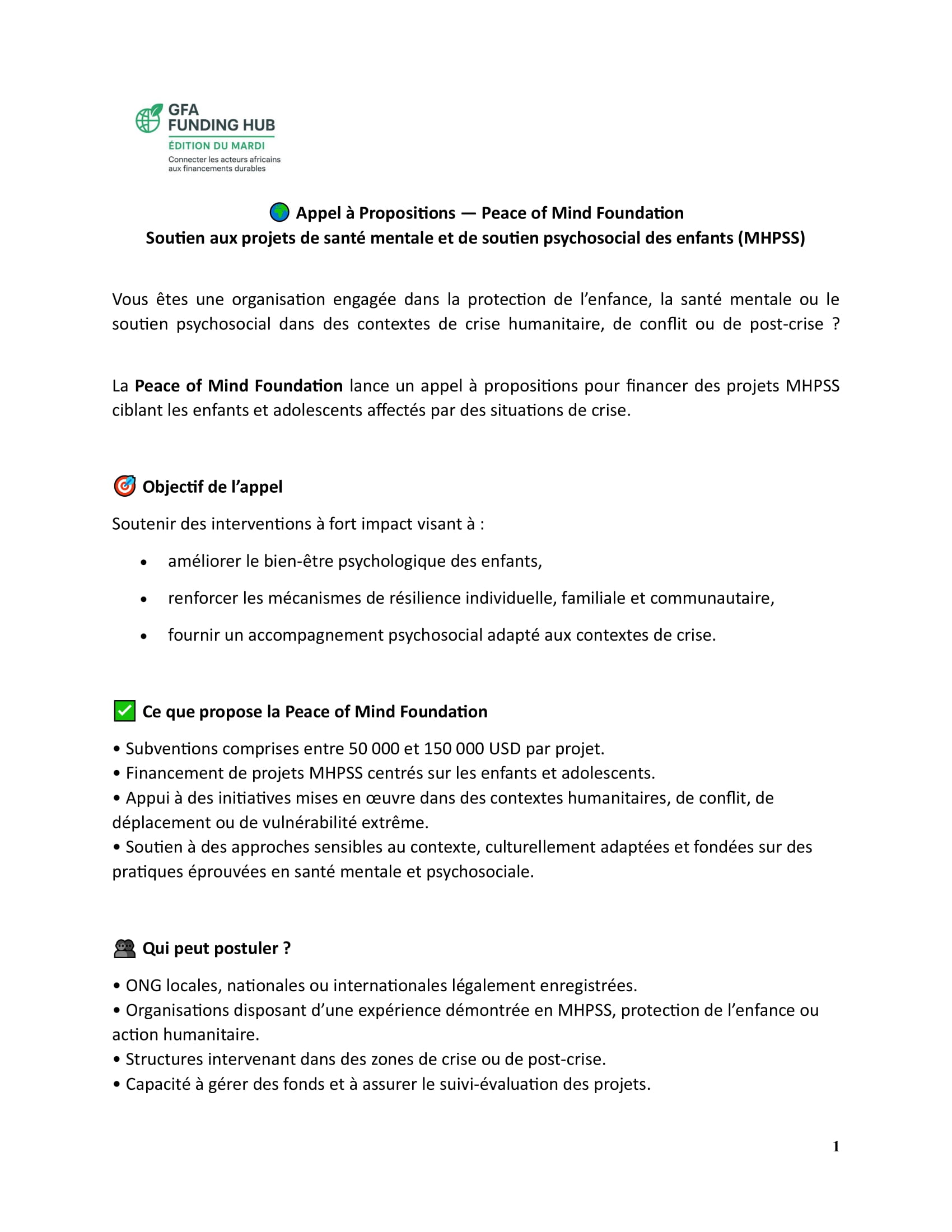 Accueil » Opportunités » Afrique » Avis d’appel à candidatures pour le Soutien aux projets de santé mentale et de soutien psychosocial des enfants (MHPSS) de GFA FUNDING HUB, une opportunité à saisir