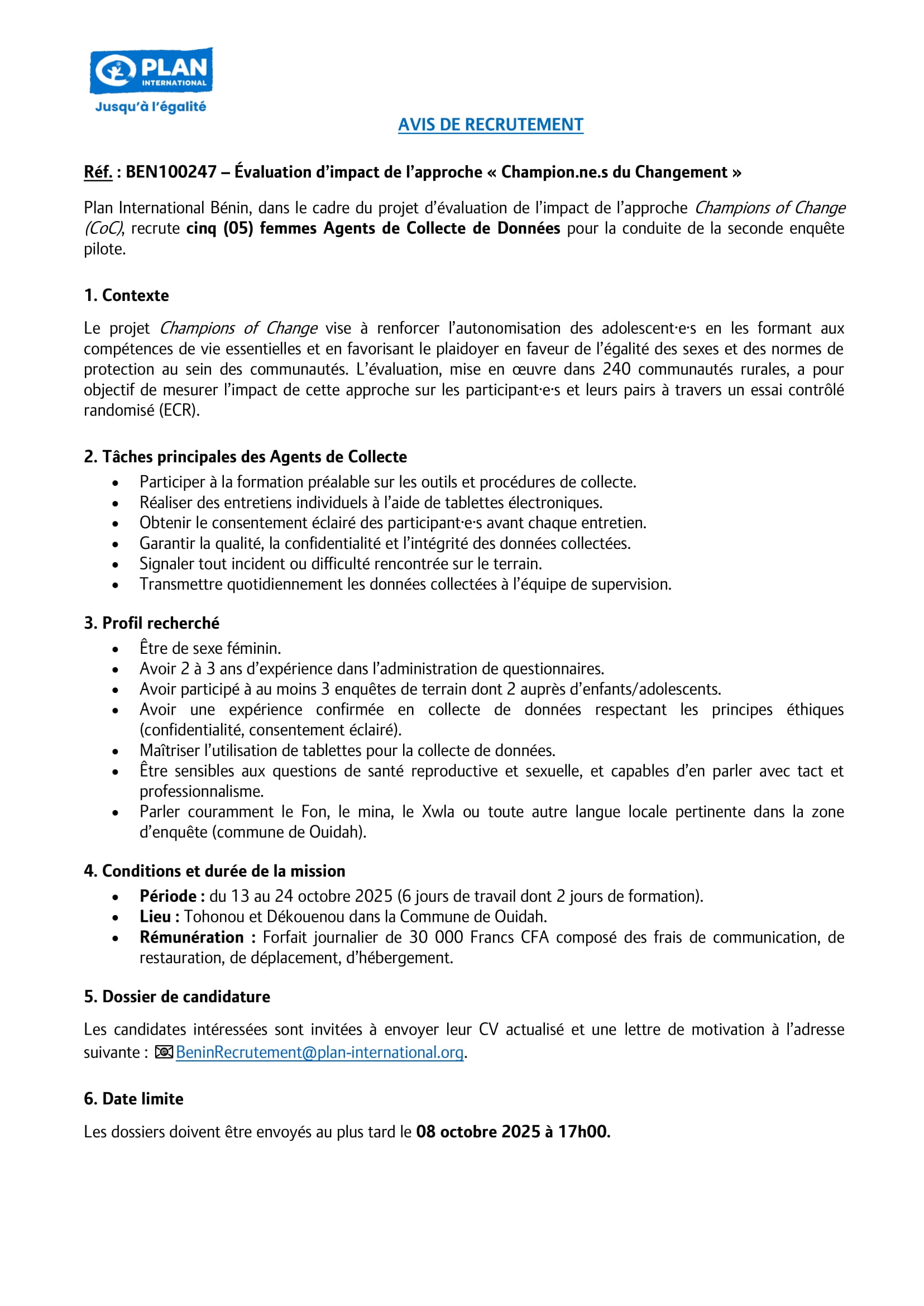 Plan International recrute Cinq (05) femmes Agents de Collecte de Données (30 000 FCFA/Jour), Bénin
