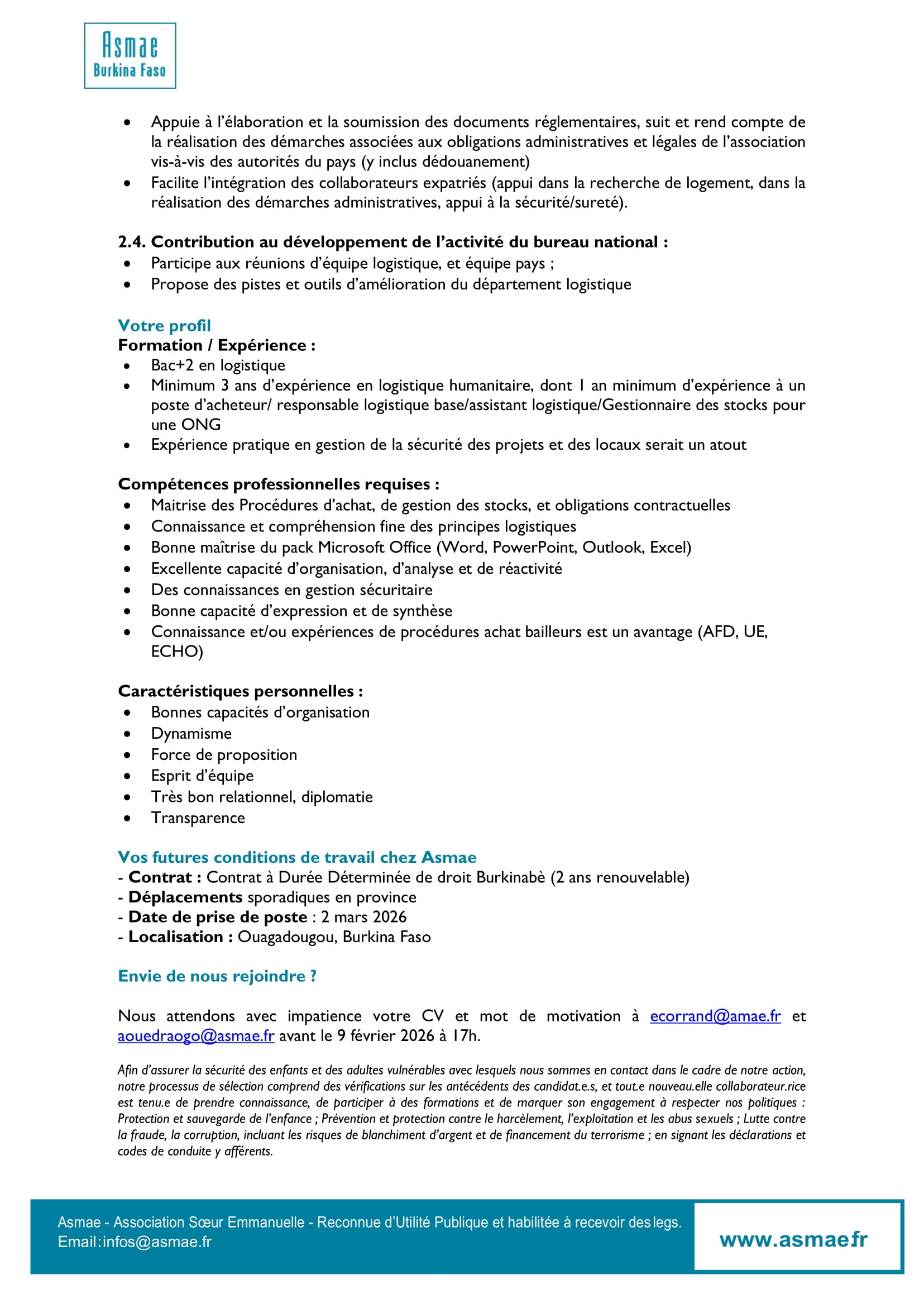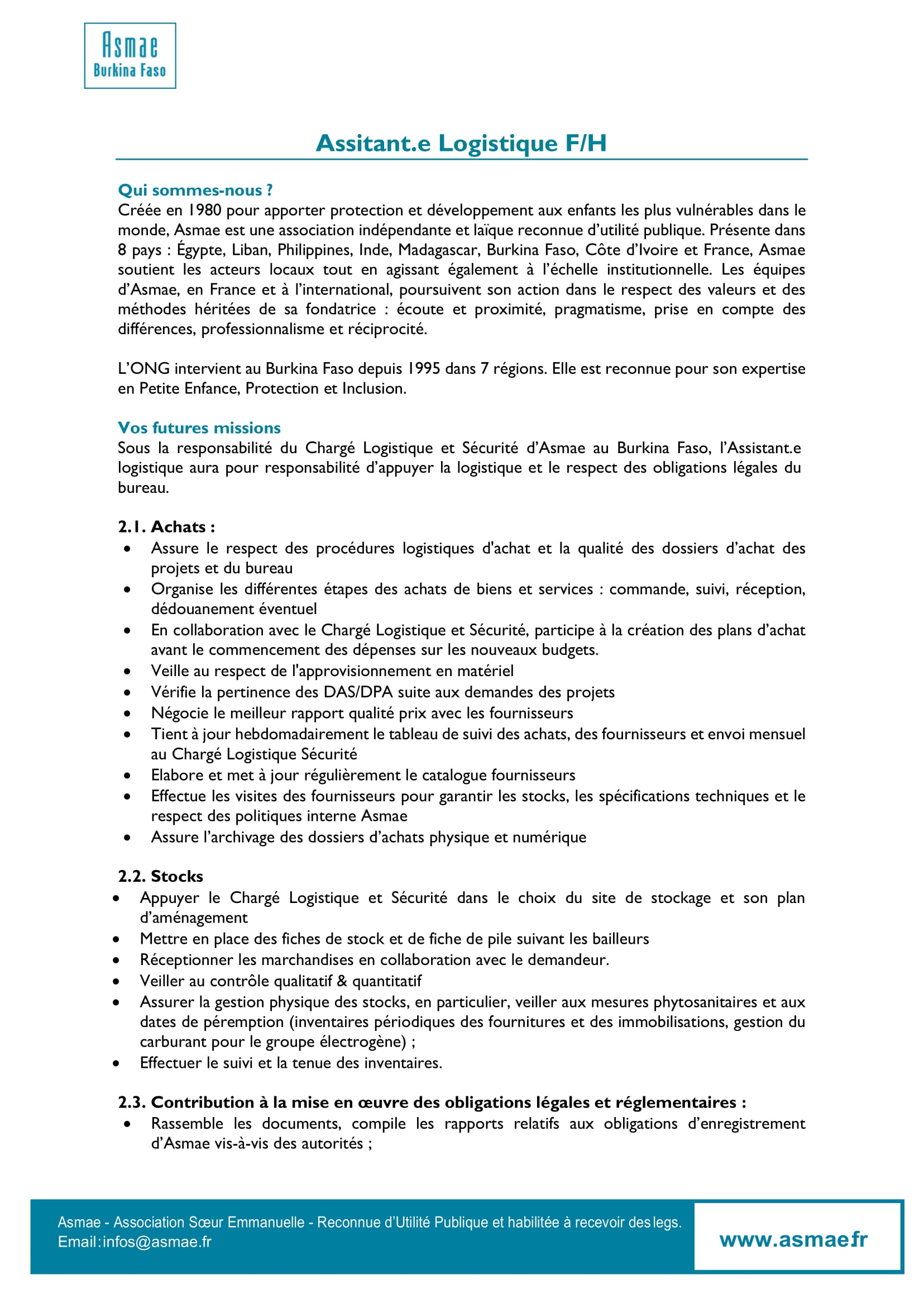 ASMAE recrute un(e) Assistant(e) Logistique , Burkina Faso