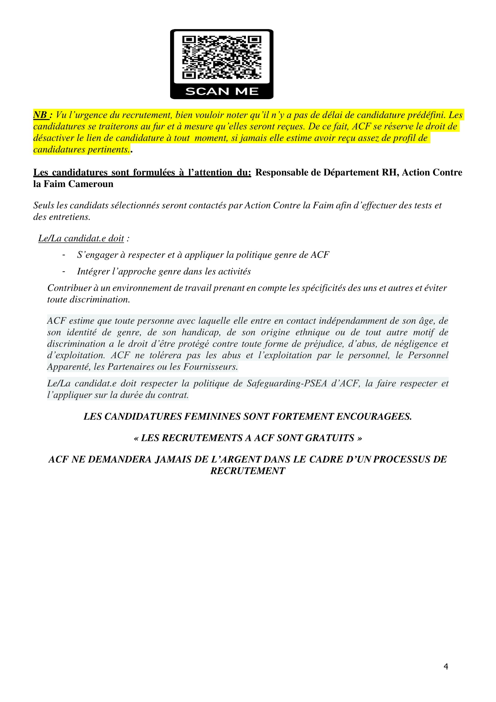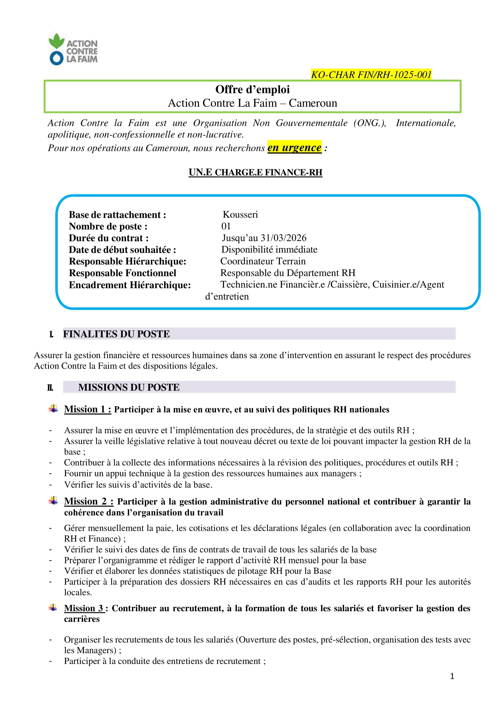 Accueil » Opportunités » Afrique » Cameroun » Action Contre la Faim recrute en urgence un(e) Chargé(e) Finance/RH à Kousseri, Cameroun