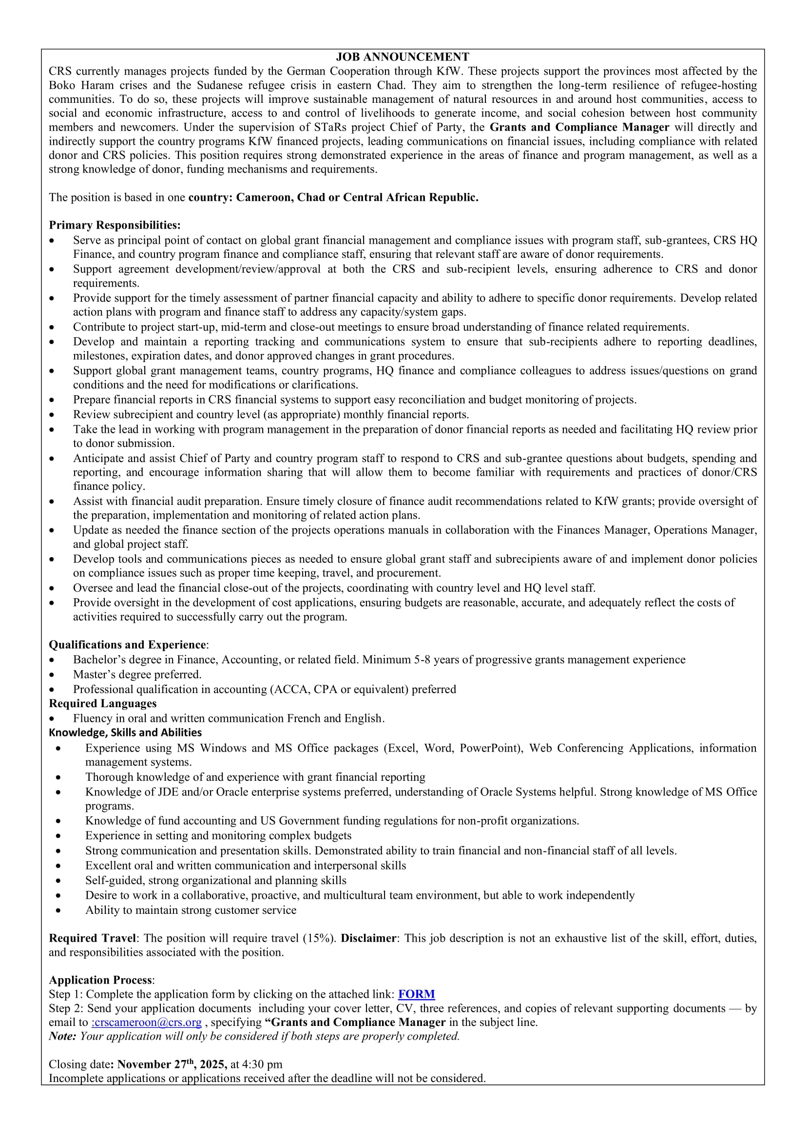 Accueil » Opportunités » Afrique » Tchad » Catholic Relief Services is recruiting a Grants and Compliance Manager, Chad/Cameroon/CAR