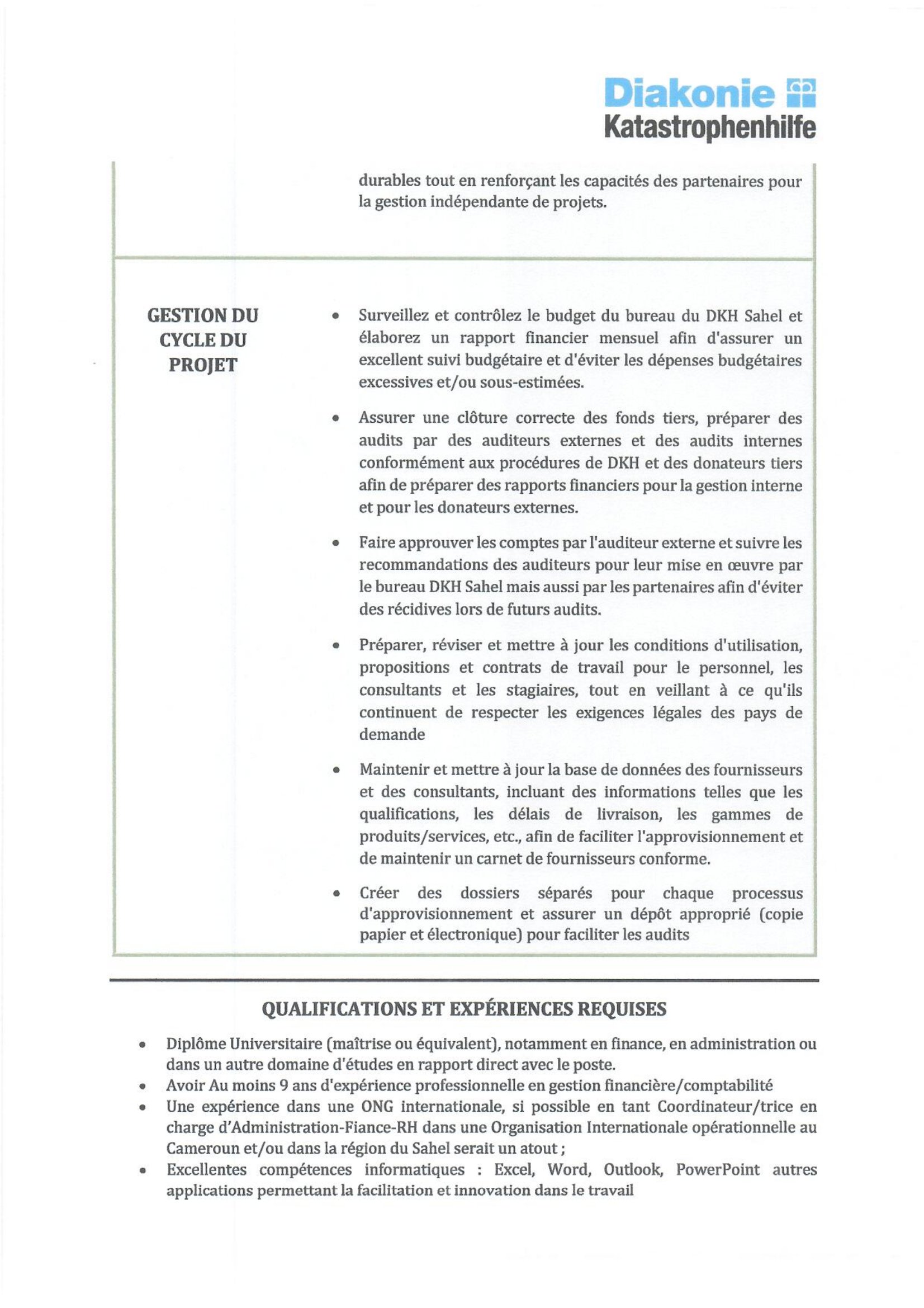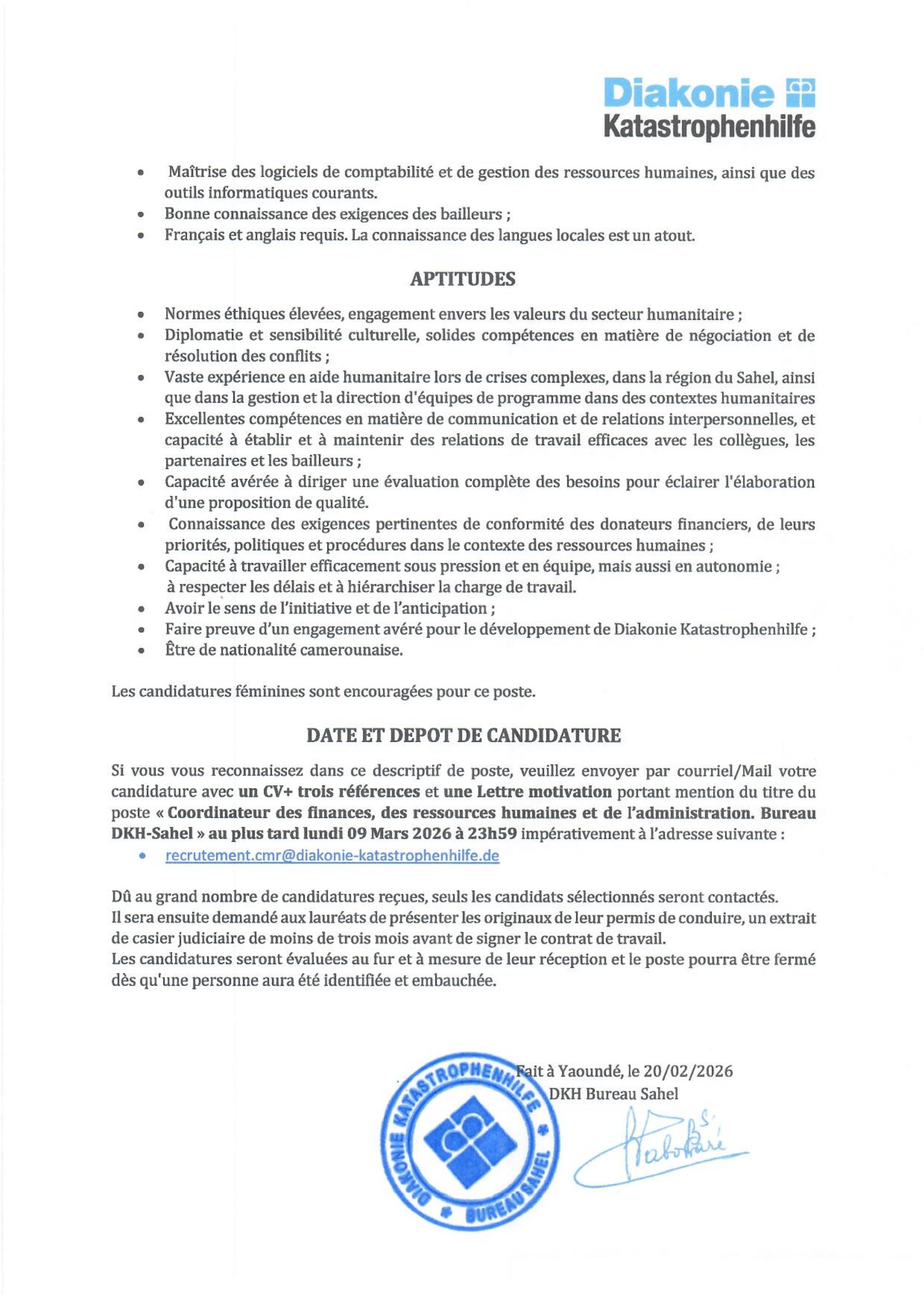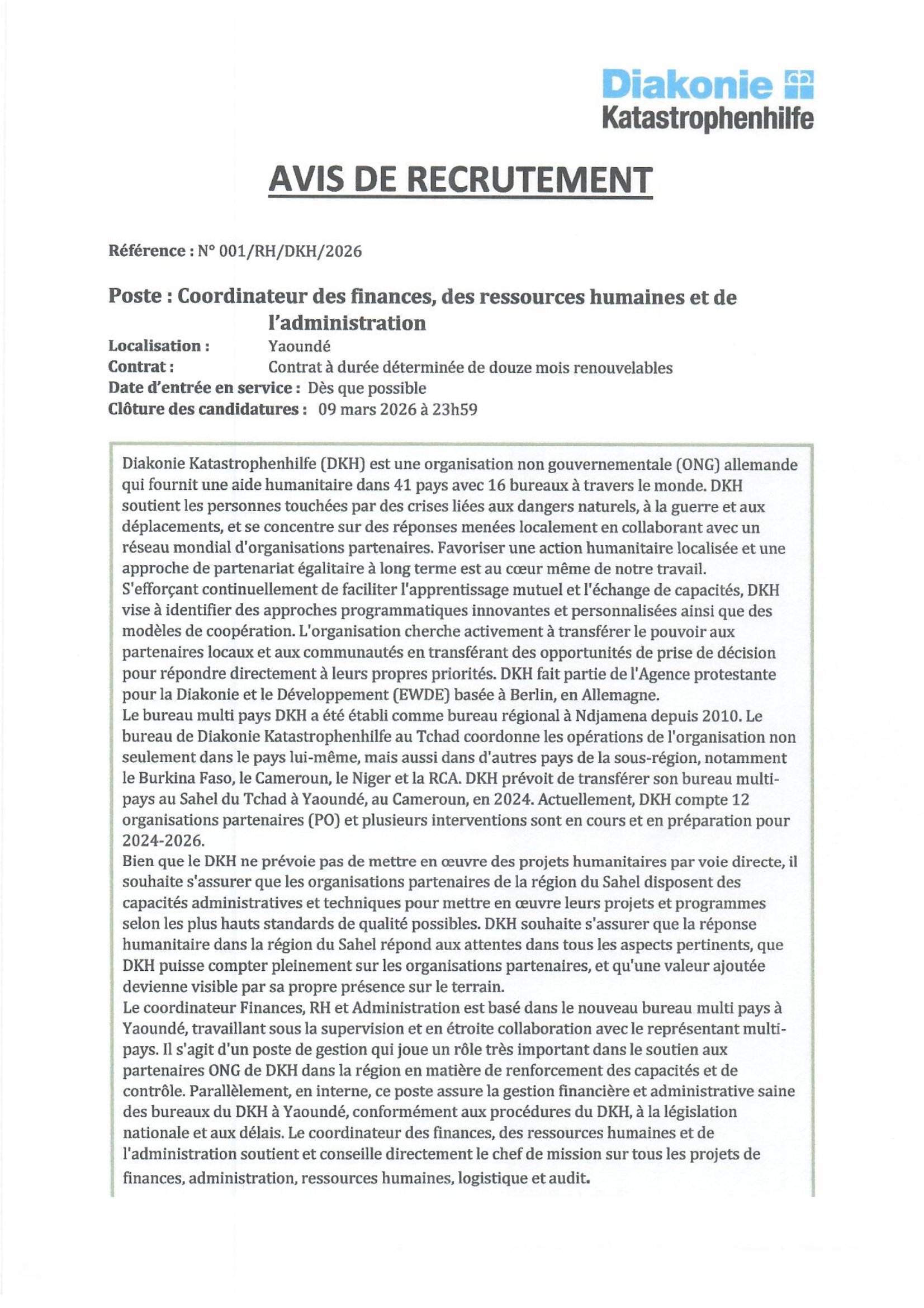 Accueil » Opportunités » Afrique » Cameroun » Diakonie au Cameroun recherche un(e) Coordinateur(rice) des Finances, des Ressources Humaines et de l’Administration
