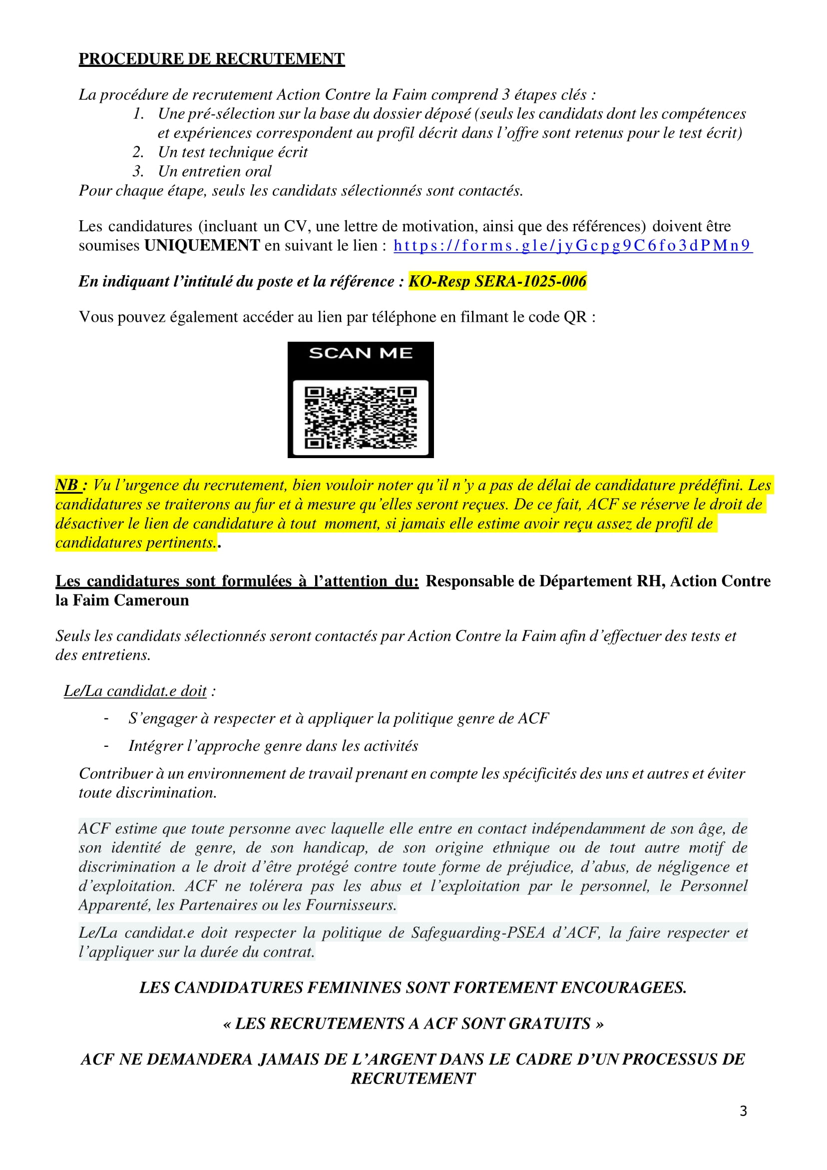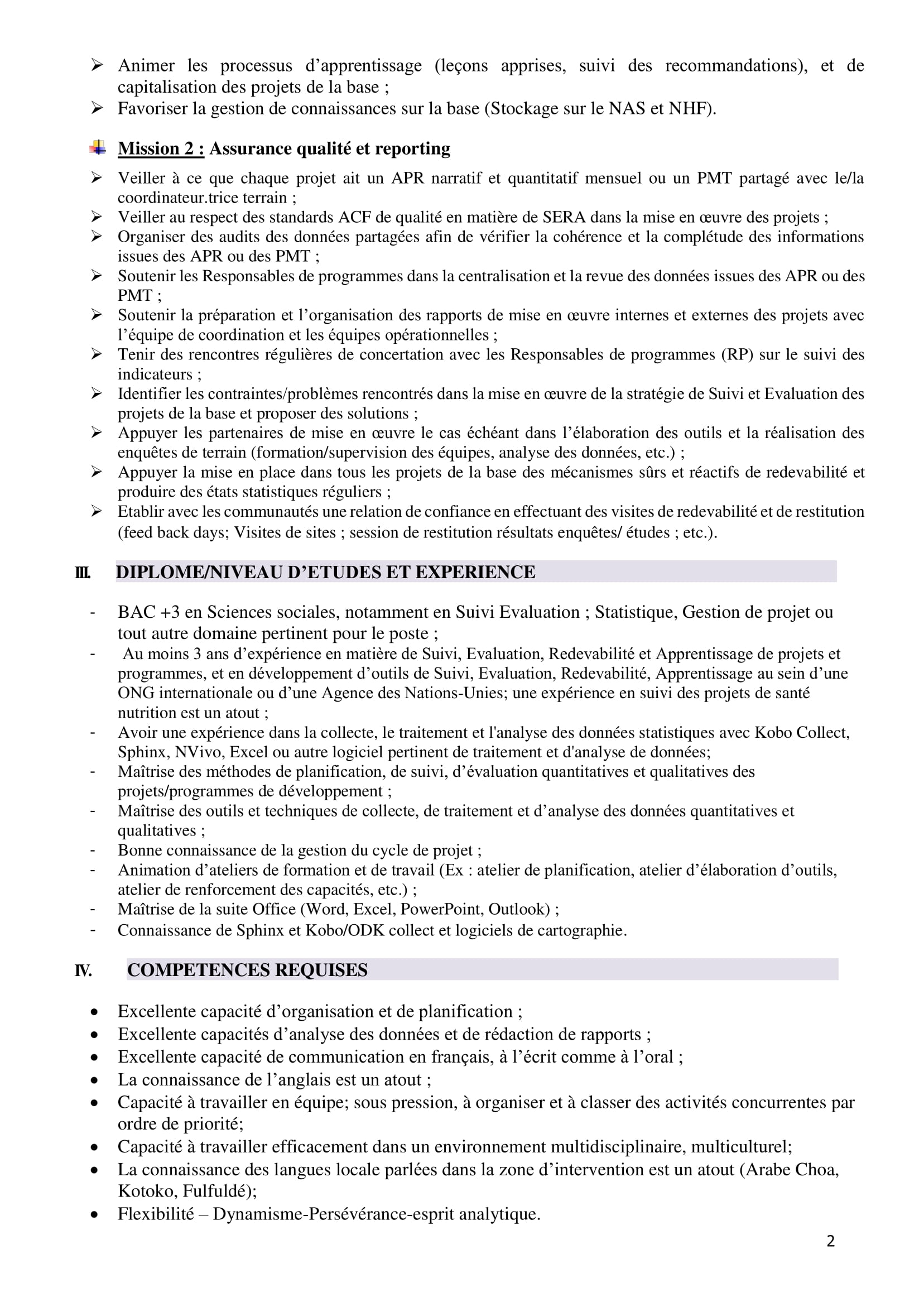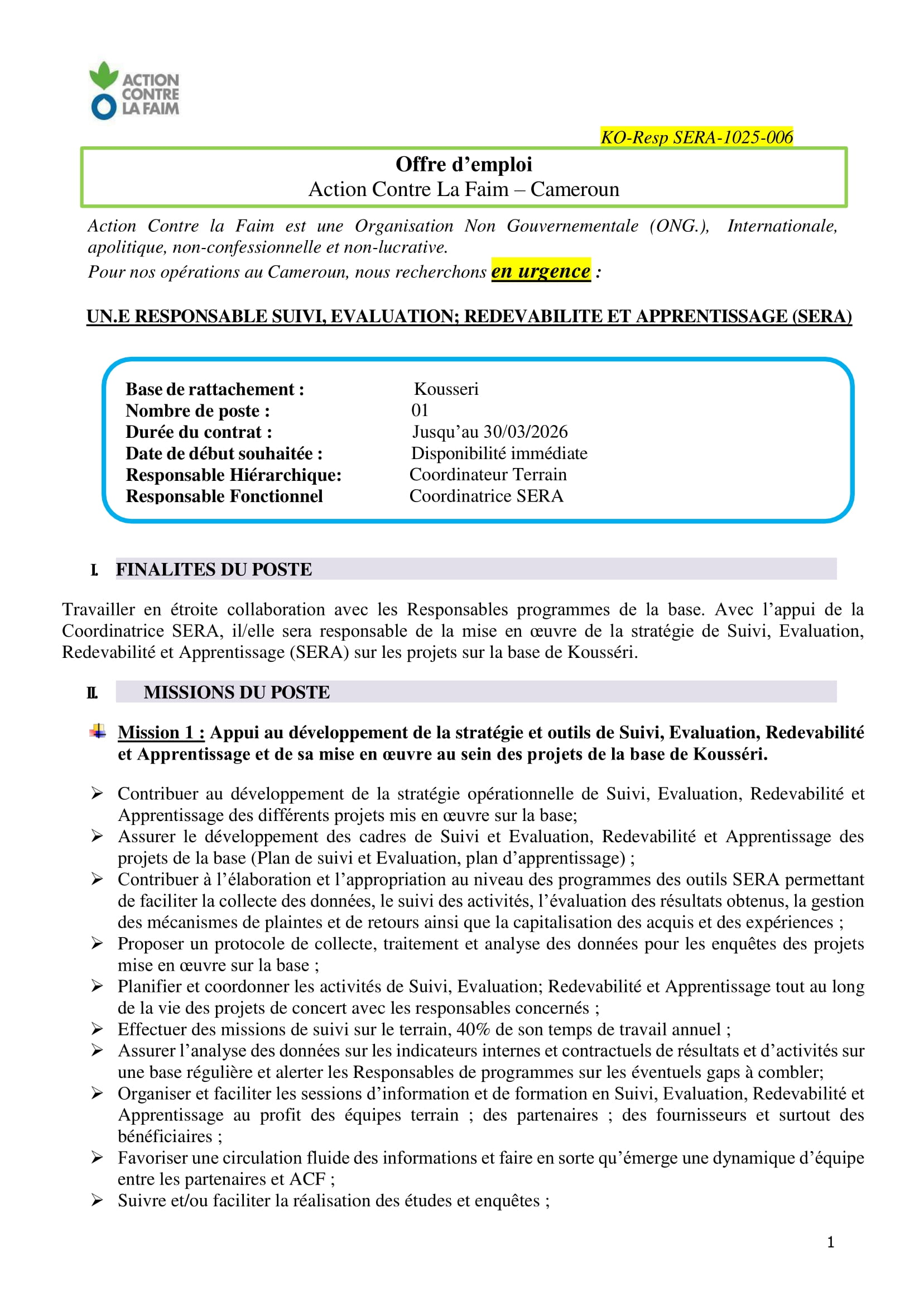 Accueil » Opportunités » Afrique » Cameroun » Action Contre la Faim recrute en urgence un(e) Responsable Suivi, Evaluation, Redevabilité et Apprentissage (SERA) à Kousseri, Cameroun