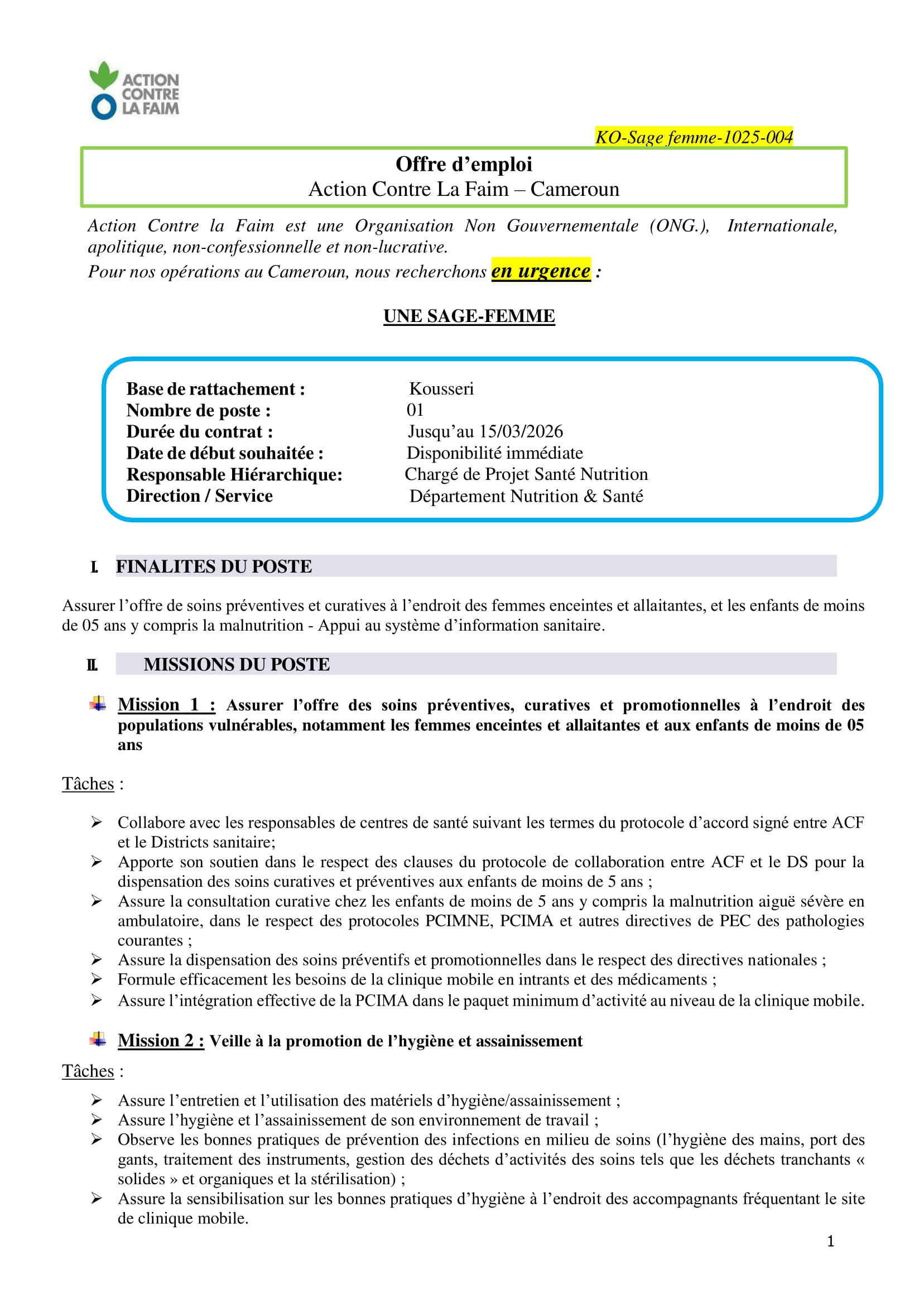 Urgent ! Action Contre la Faim recrute une Sage-Femme à Kousseri, Cameroun