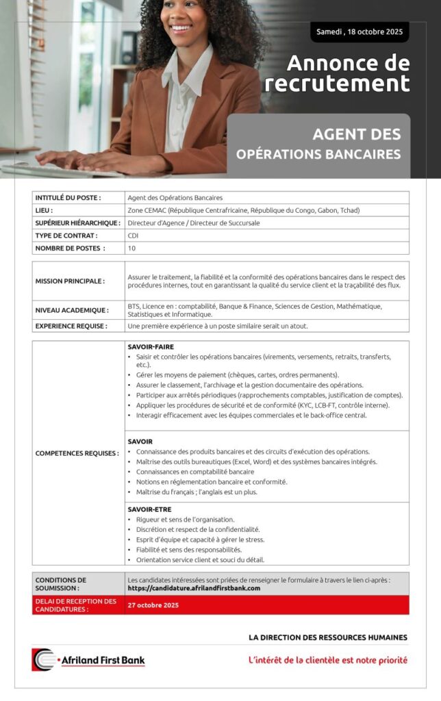 Accueil » Opportunités » Afrique » Tchad » Afriland First Bank recrute pour un CDI 10 Agents des Opérations Bancaires repartis au Tchad, au Gabon, en RCA et en République du Congo