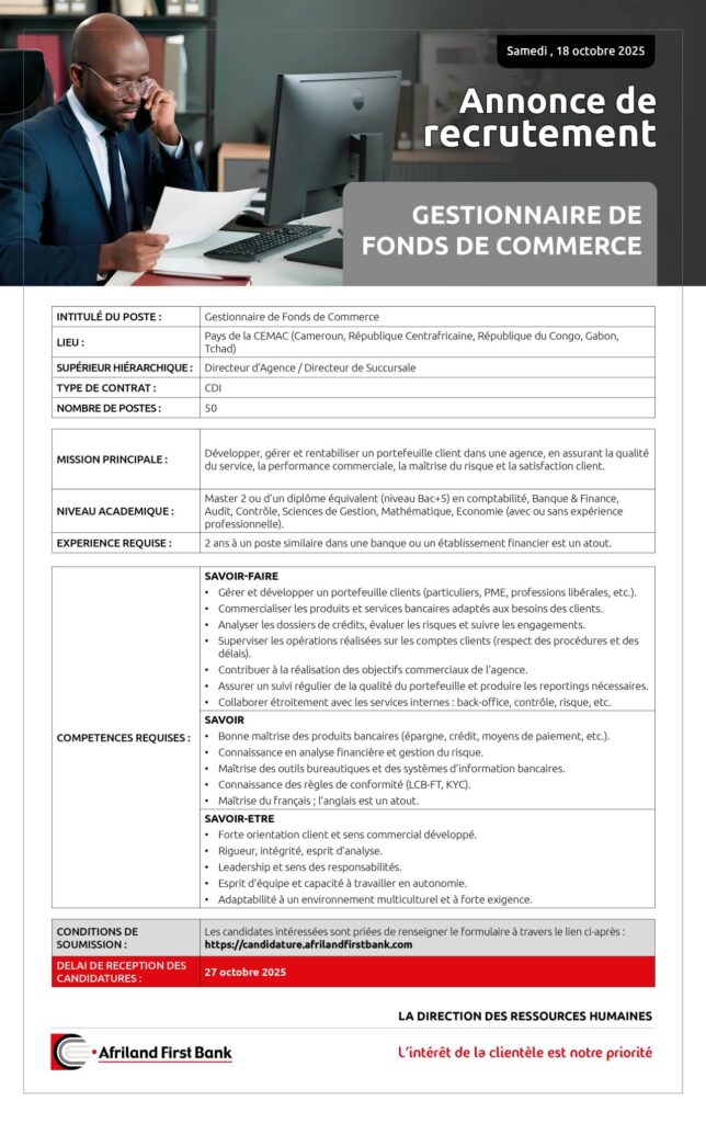 Afriland First Bank recrute pour un CDI 50 Gestionnaires de fond de commerce repartis au Tchad, au Gabon, en RCA et en République du Congo