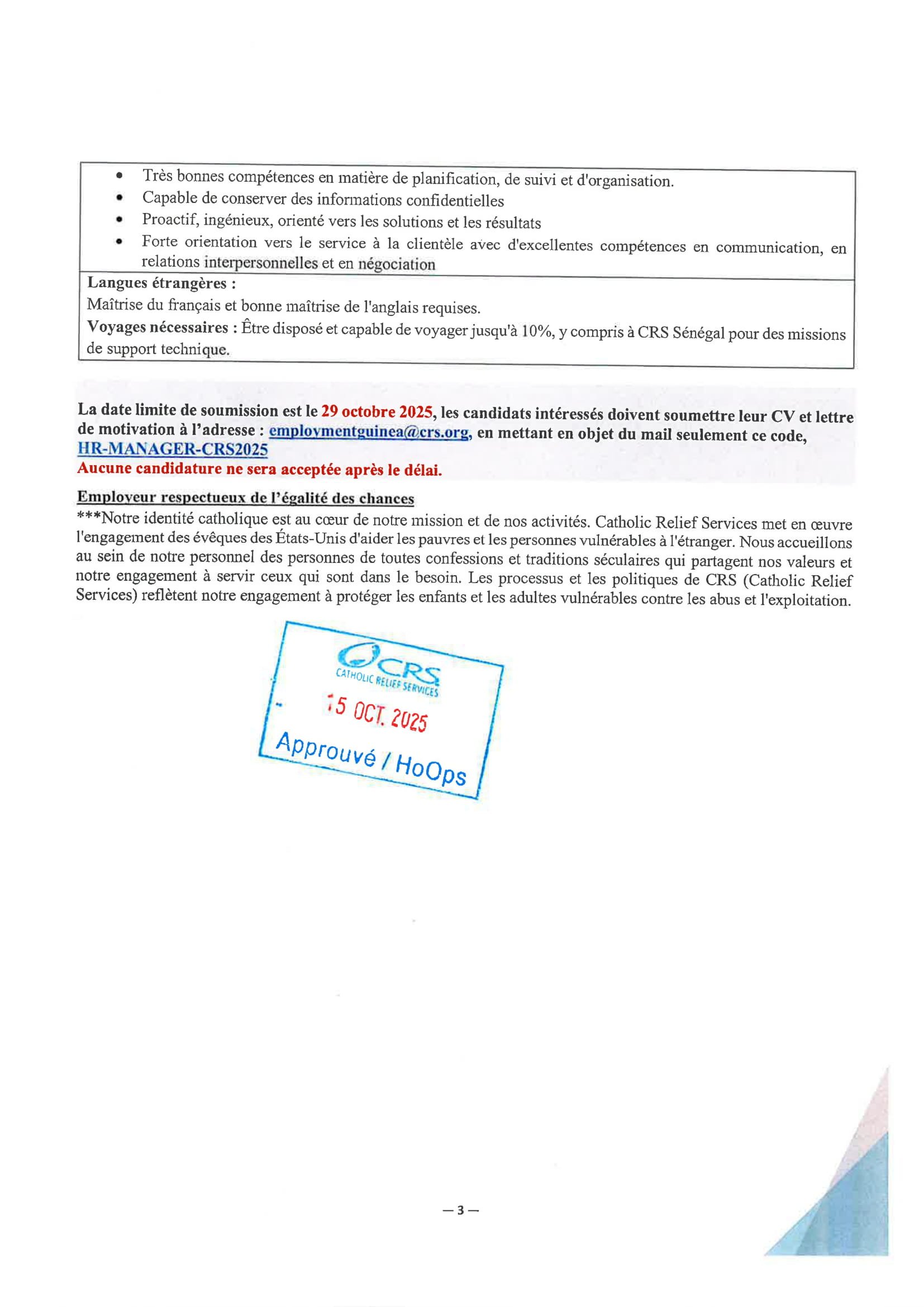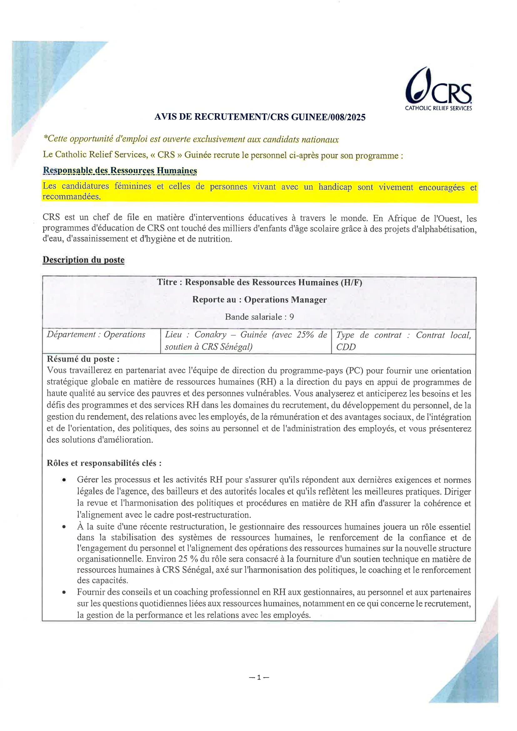 Accueil » Opportunités » Afrique » Guinée » Avis de recrutement d’un(e) Responsable des Ressources Humaines au sein de Catholic Relief Services (CRS), Guinée