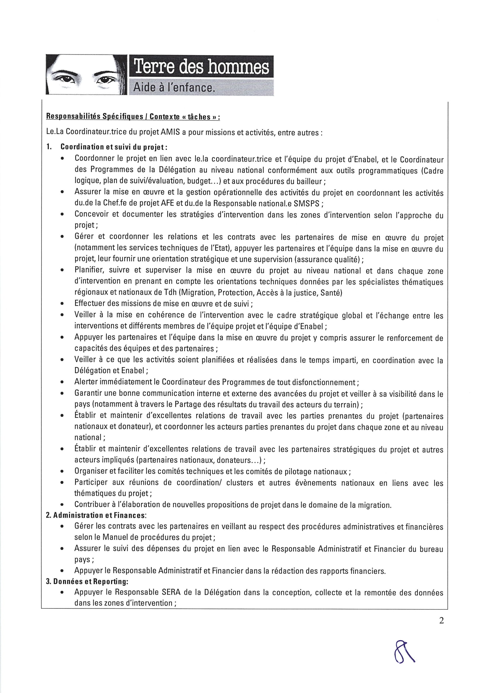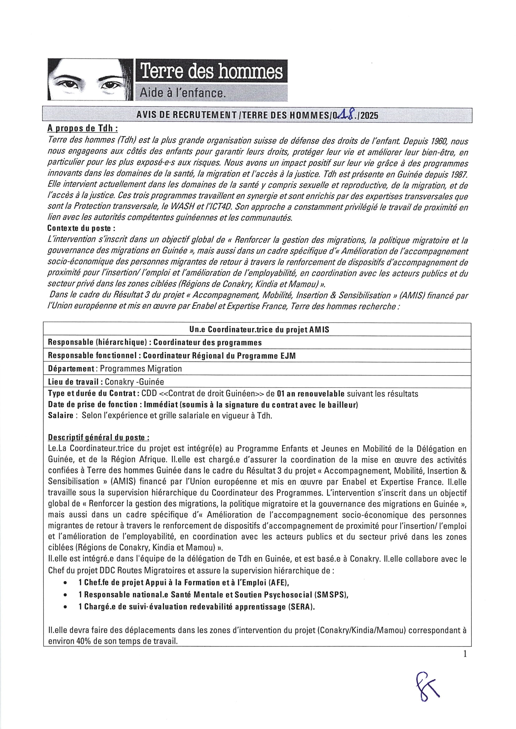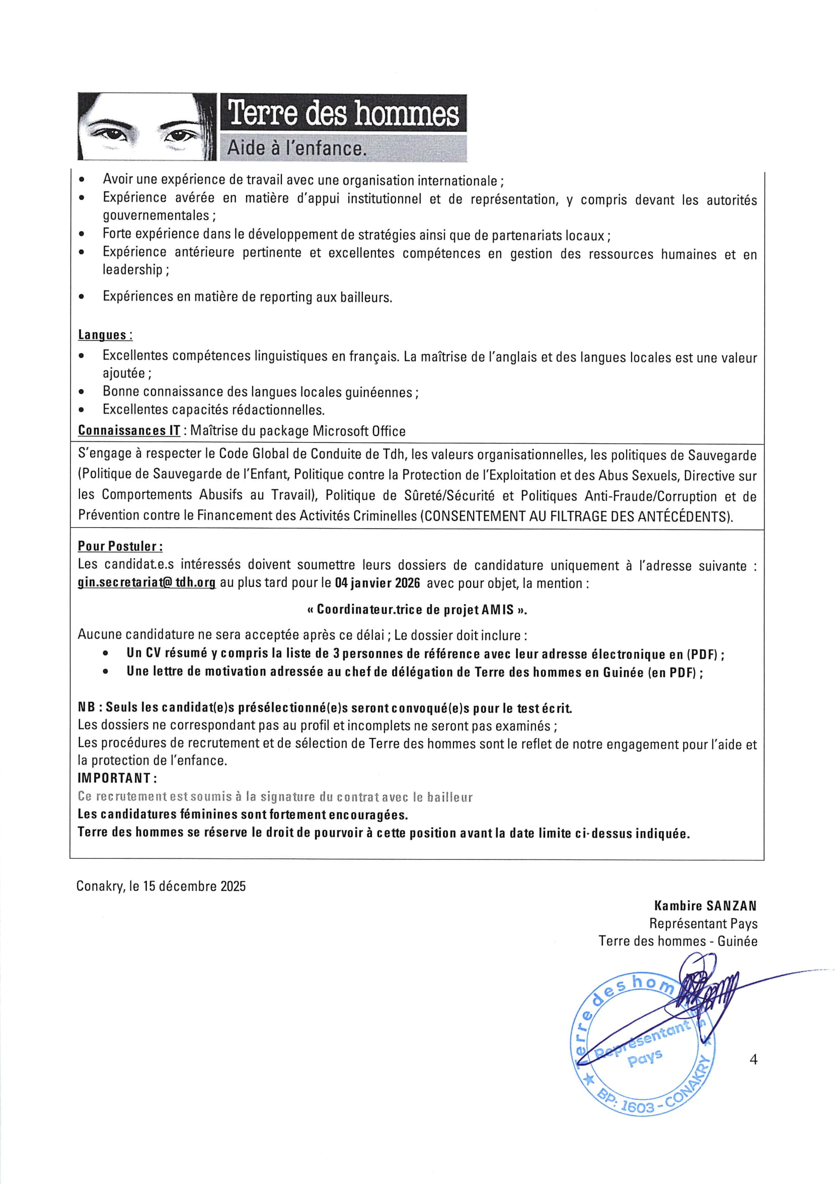 Accueil » Opportunités » Afrique » Guinée » Terre des hommes recherche un(e) Coordonnateur(rice) du projet AMIS, poste basé en Guinée-Conakry