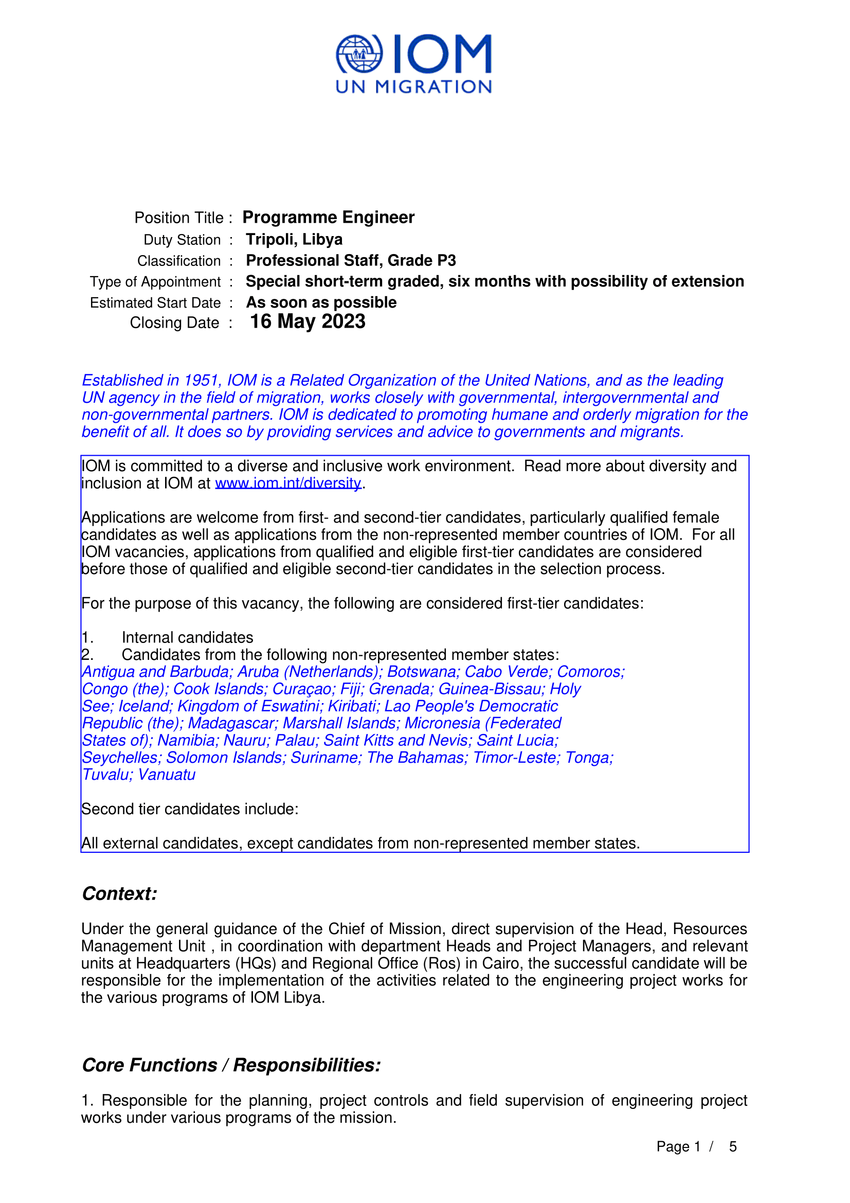 Accueil » Opportunités » Afrique » Libye » Appel à manifestation d’intérêt : OIM recrute un.e Ingénieur.e de programme en Libye.