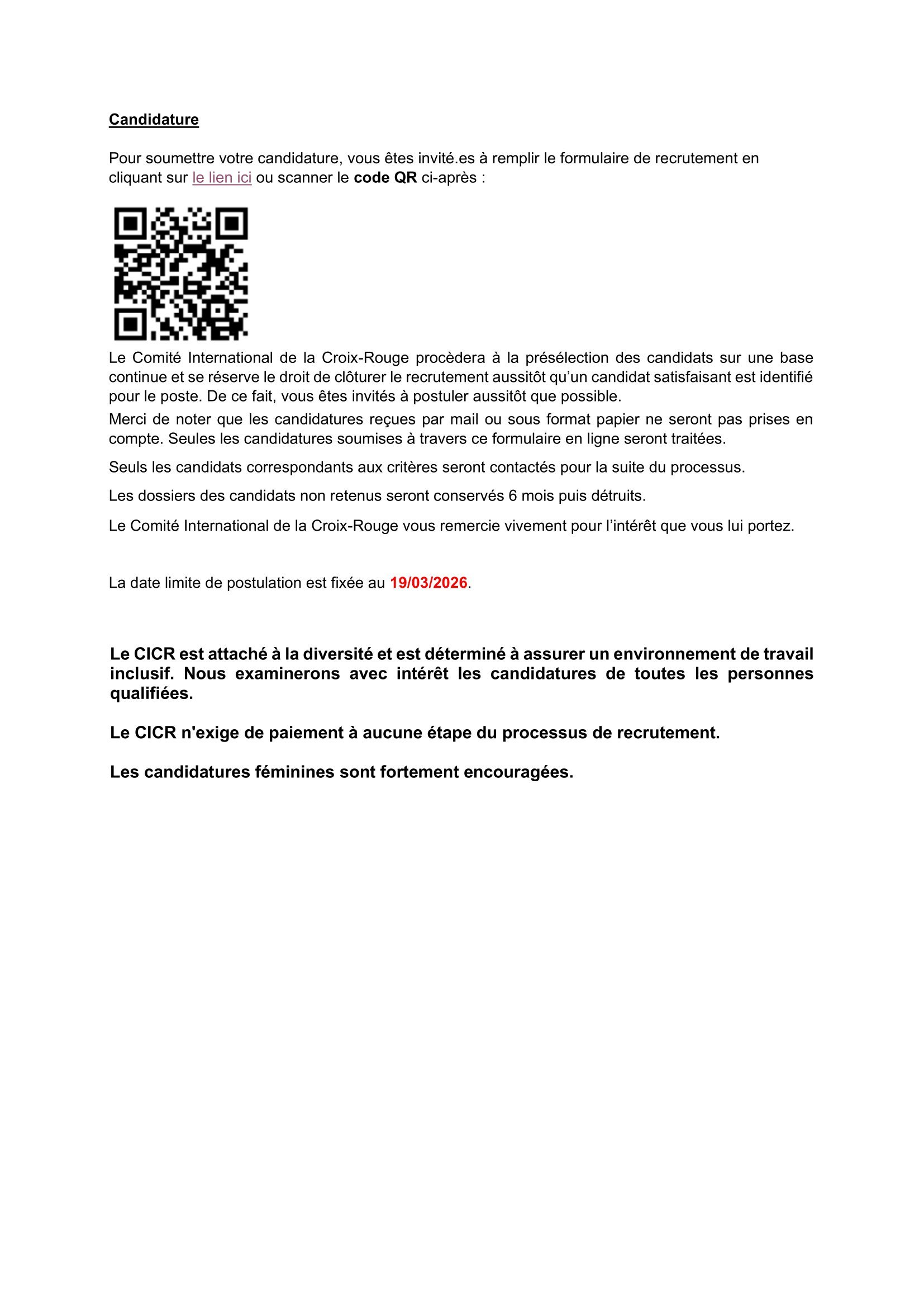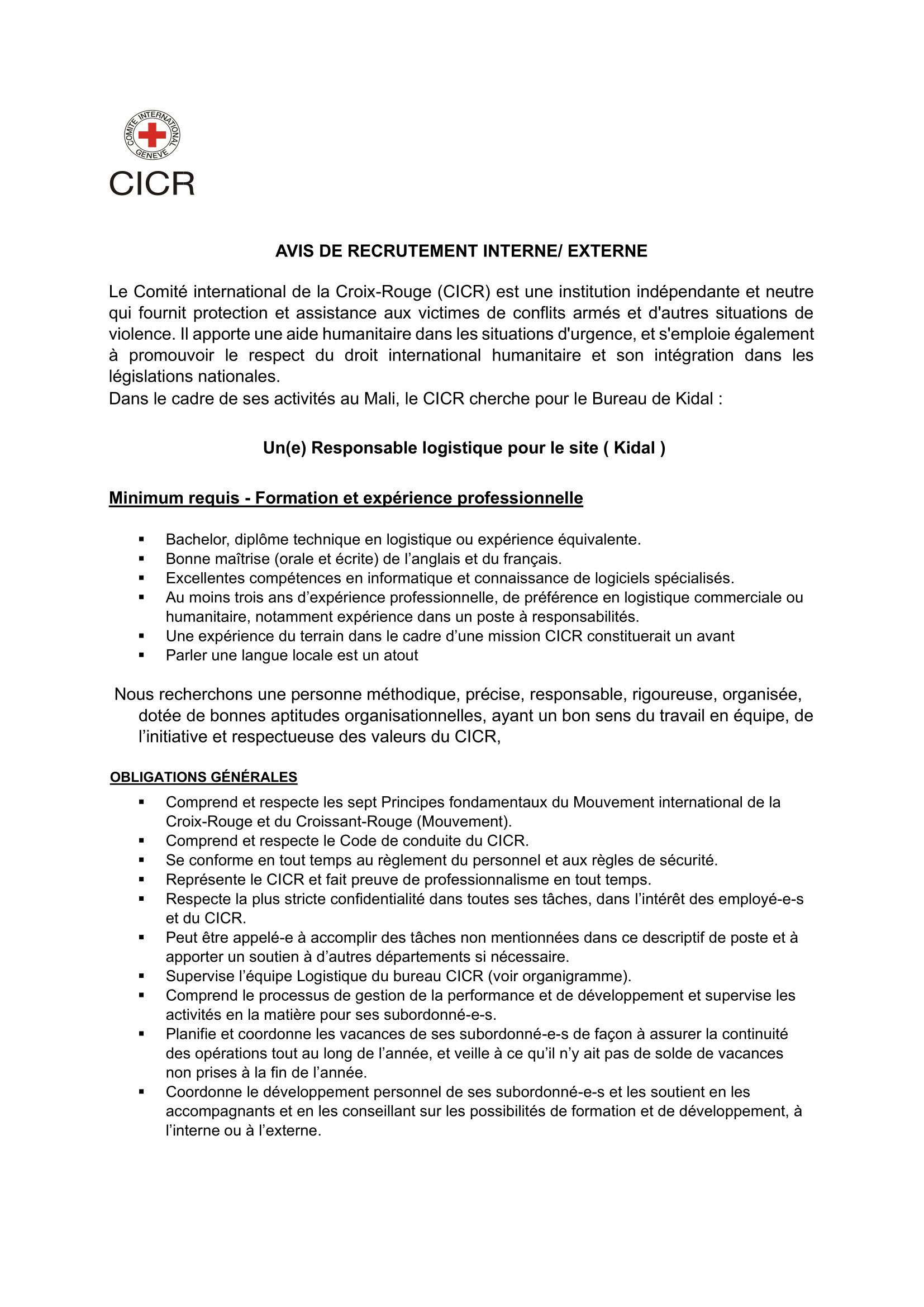 Accueil » Opportunités » Afrique » Mali » Le CICR recrute un(e) Responsable logistique pour le site (Kidal), au Mali