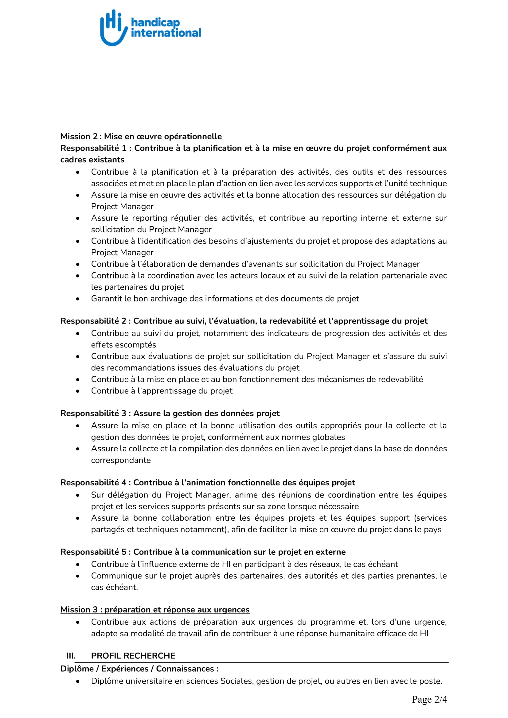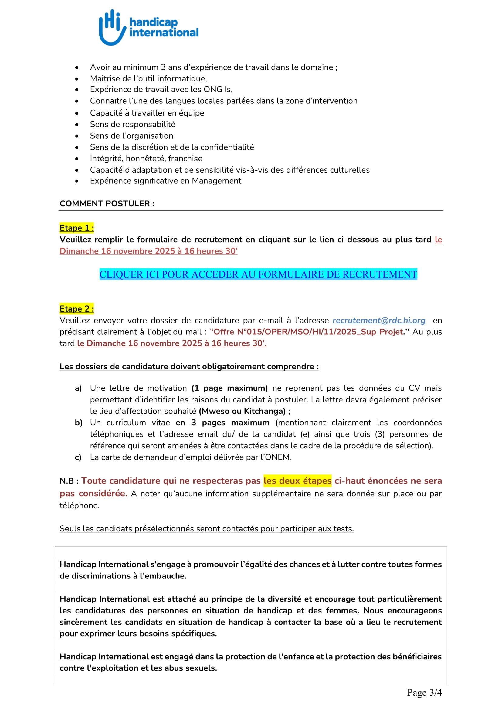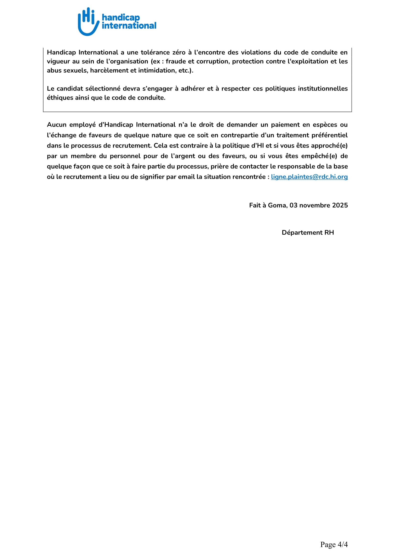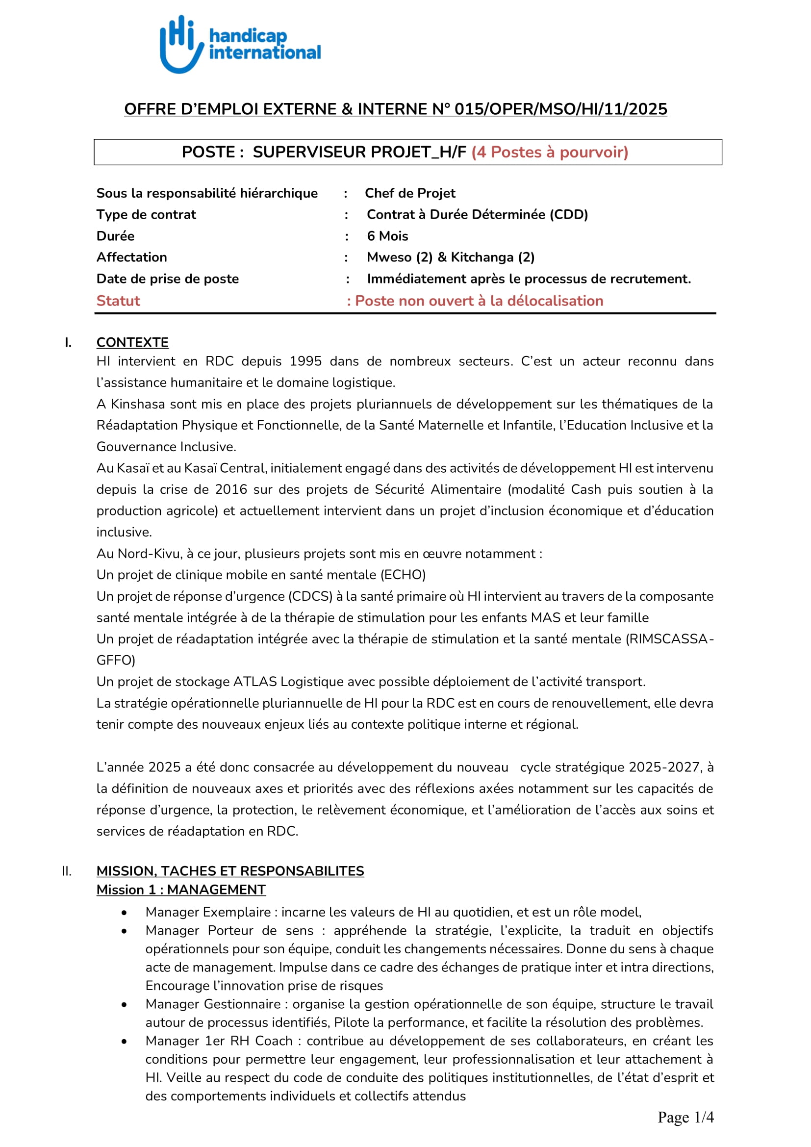 Accueil » Opportunités » Afrique » RD Congo » Humanité et Inclusion (HI) recrute Quatre (04) Superviseurs projet basés à Mweso & Kitchanga, RDC