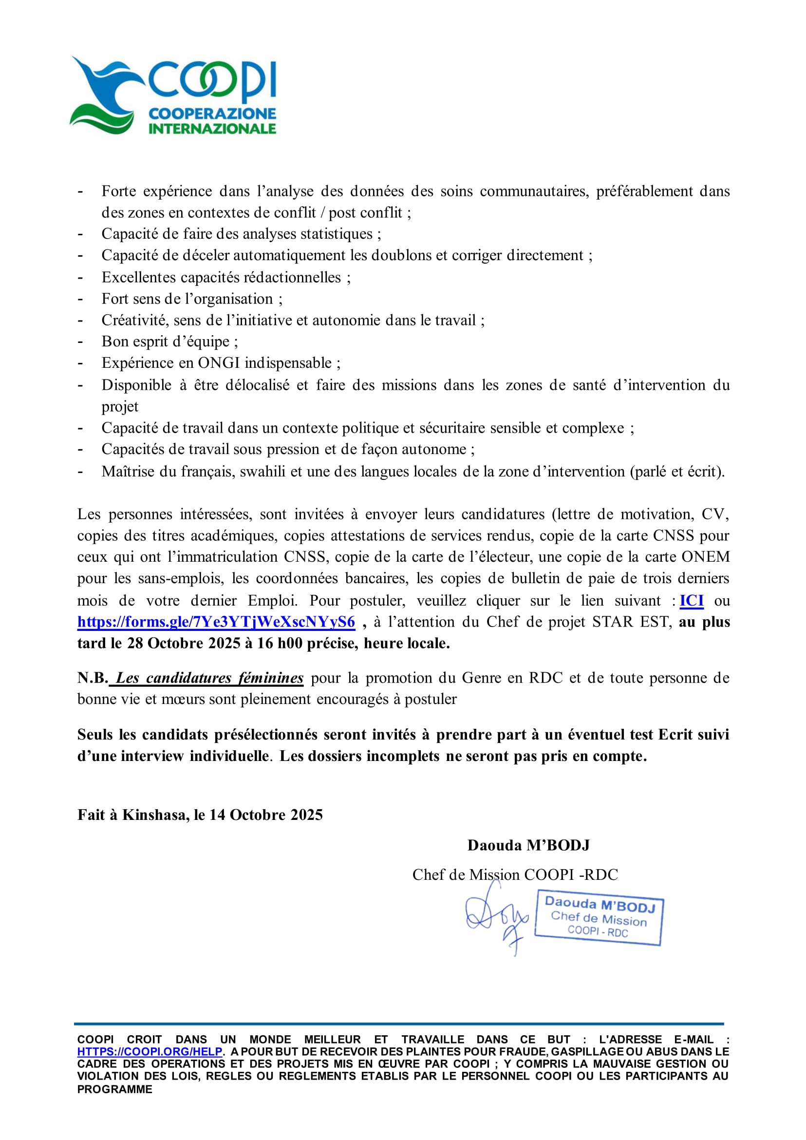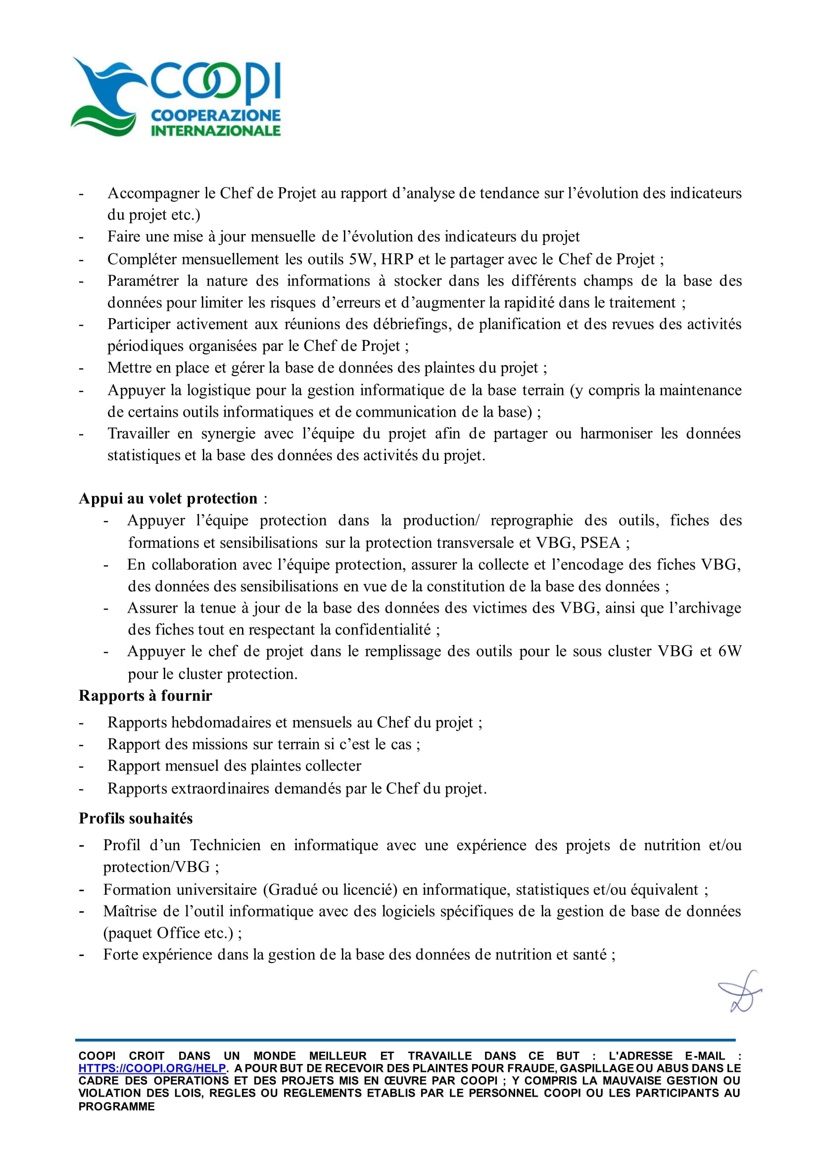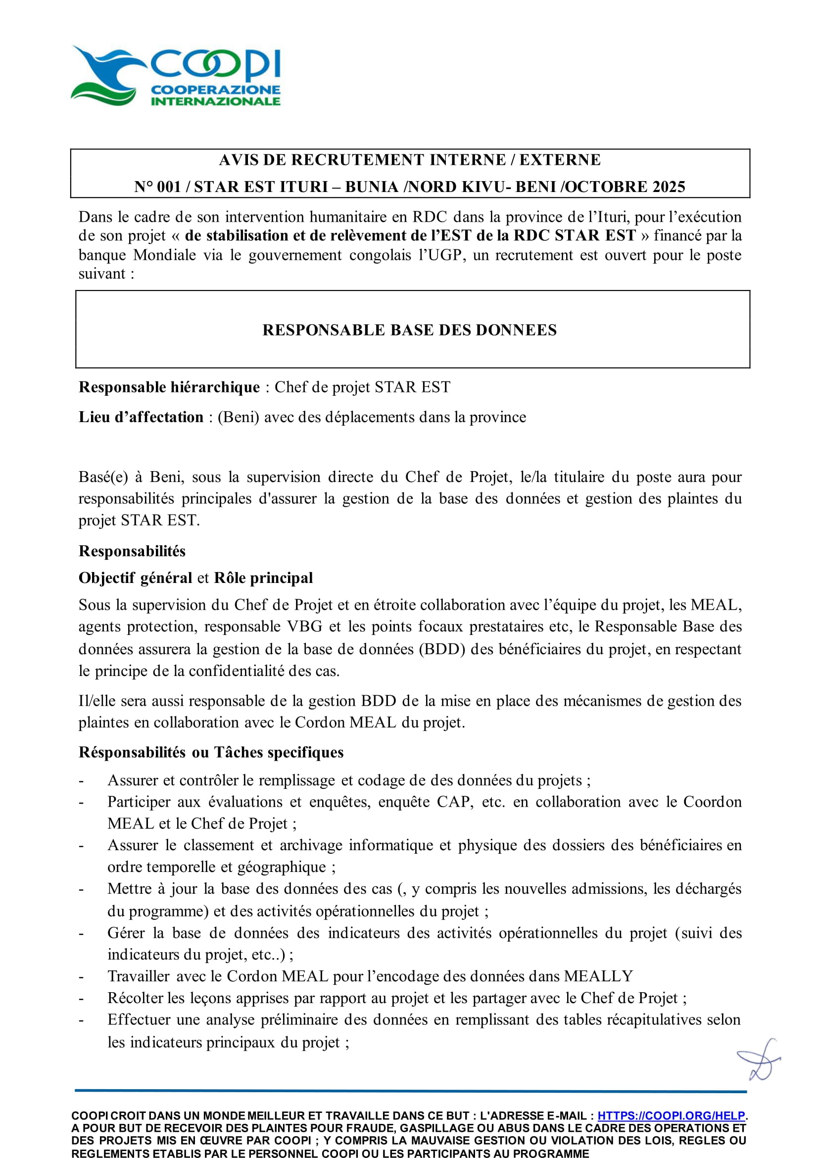 Accueil » Opportunités » Afrique » RD Congo » COOPI recrute un Responsable Base des Données (H/F) à Beni, RDC