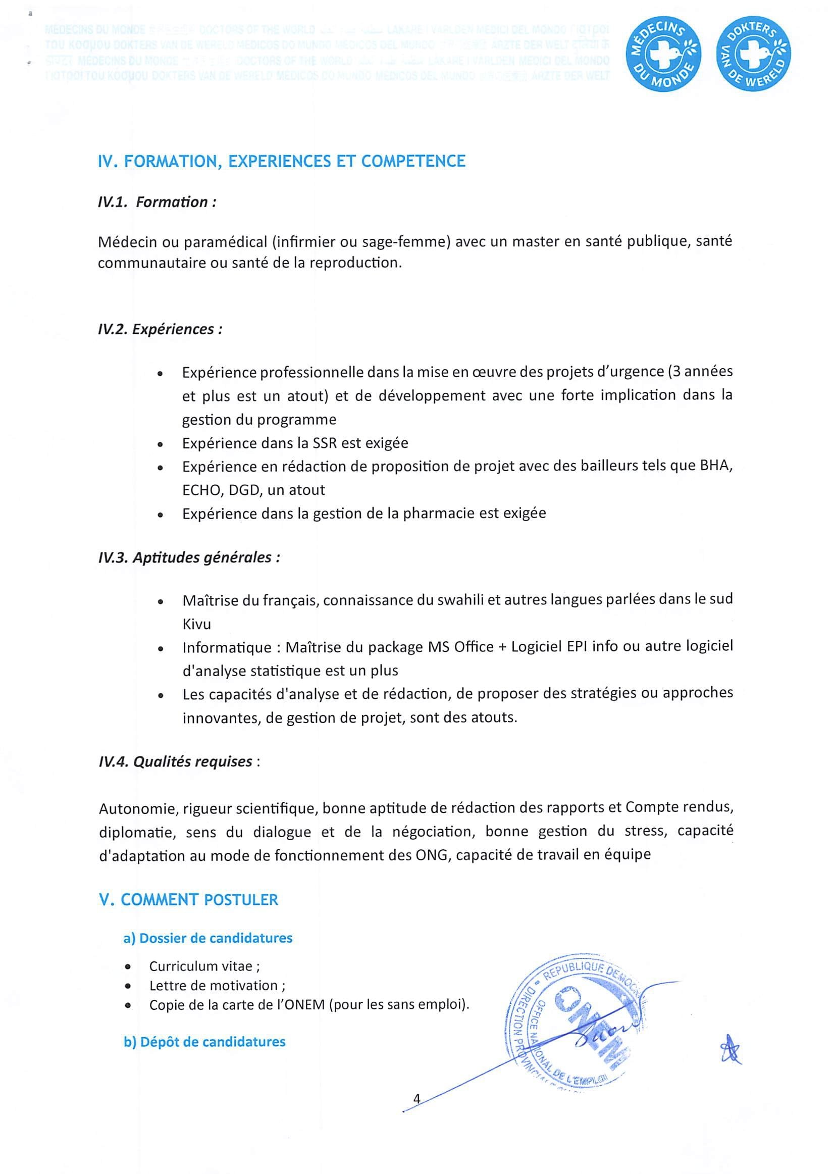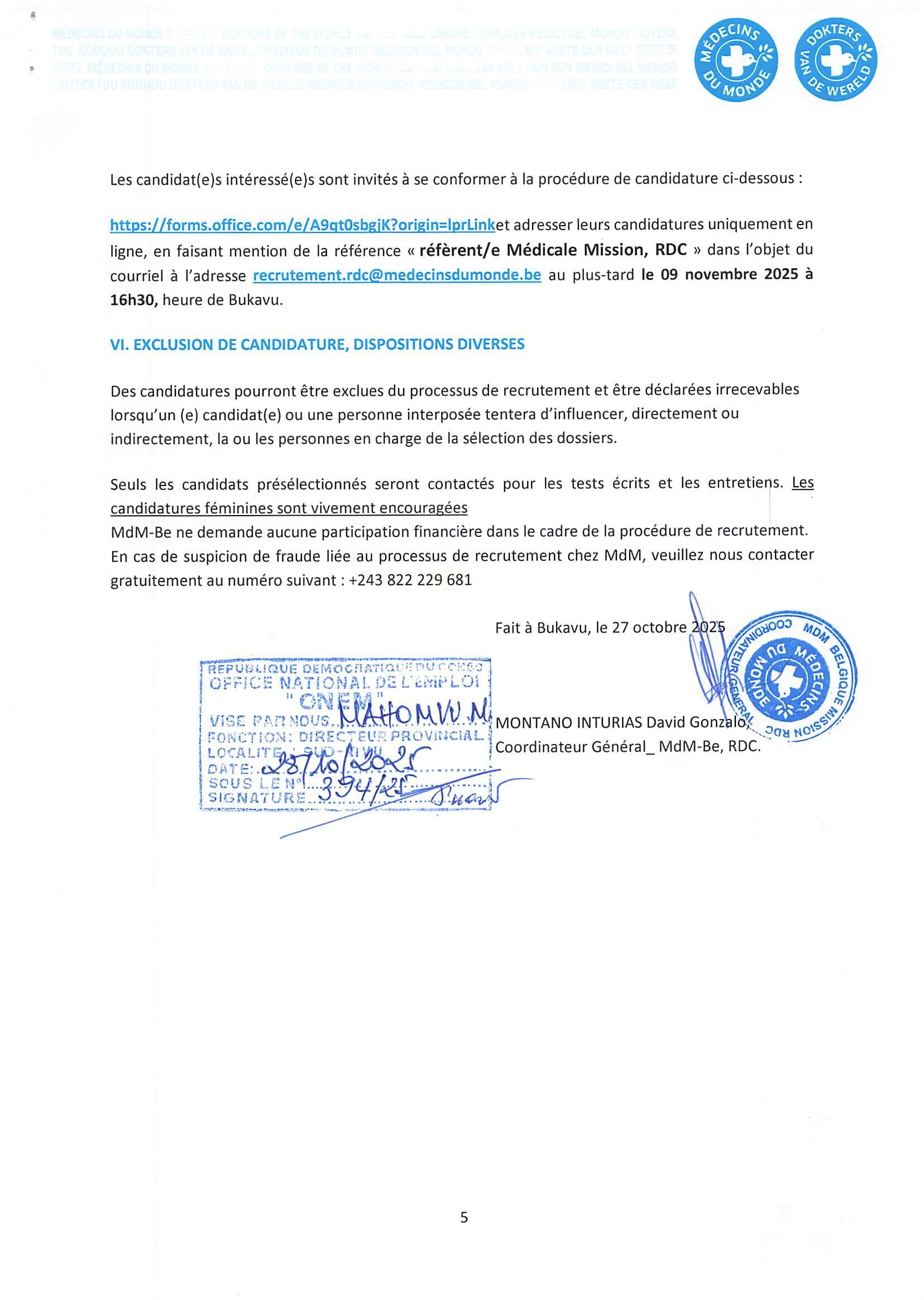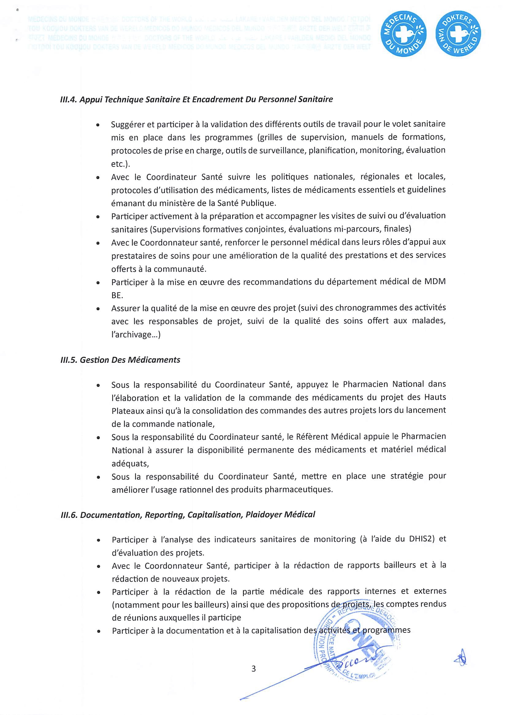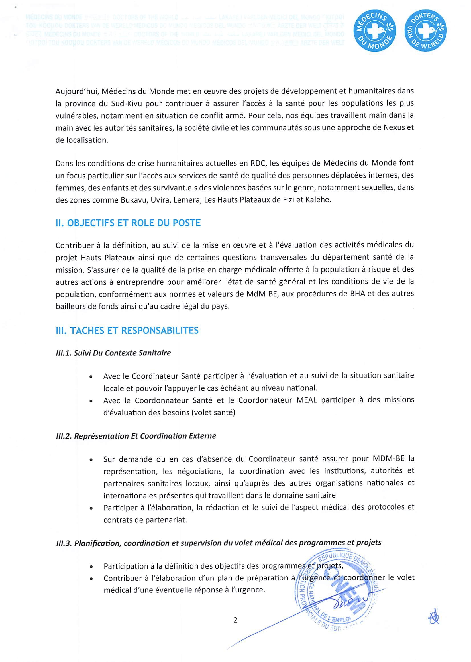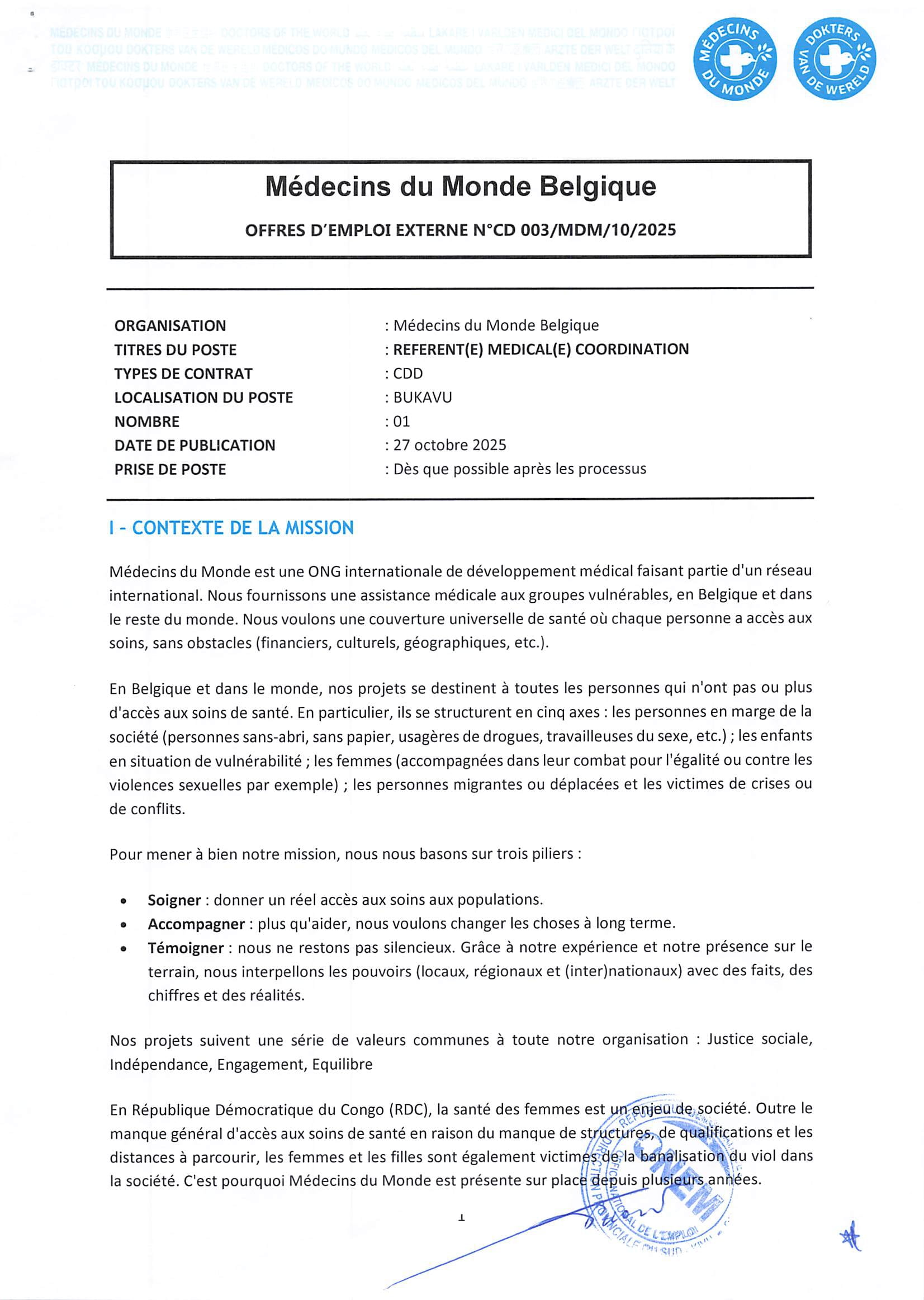 Médecins du Monde recrute à Bukavu un(e) Référent(e) Médical(e) Coordination, RDC