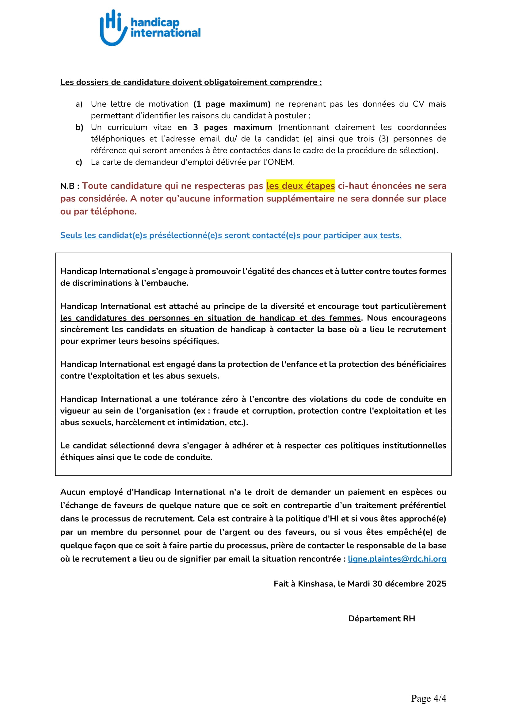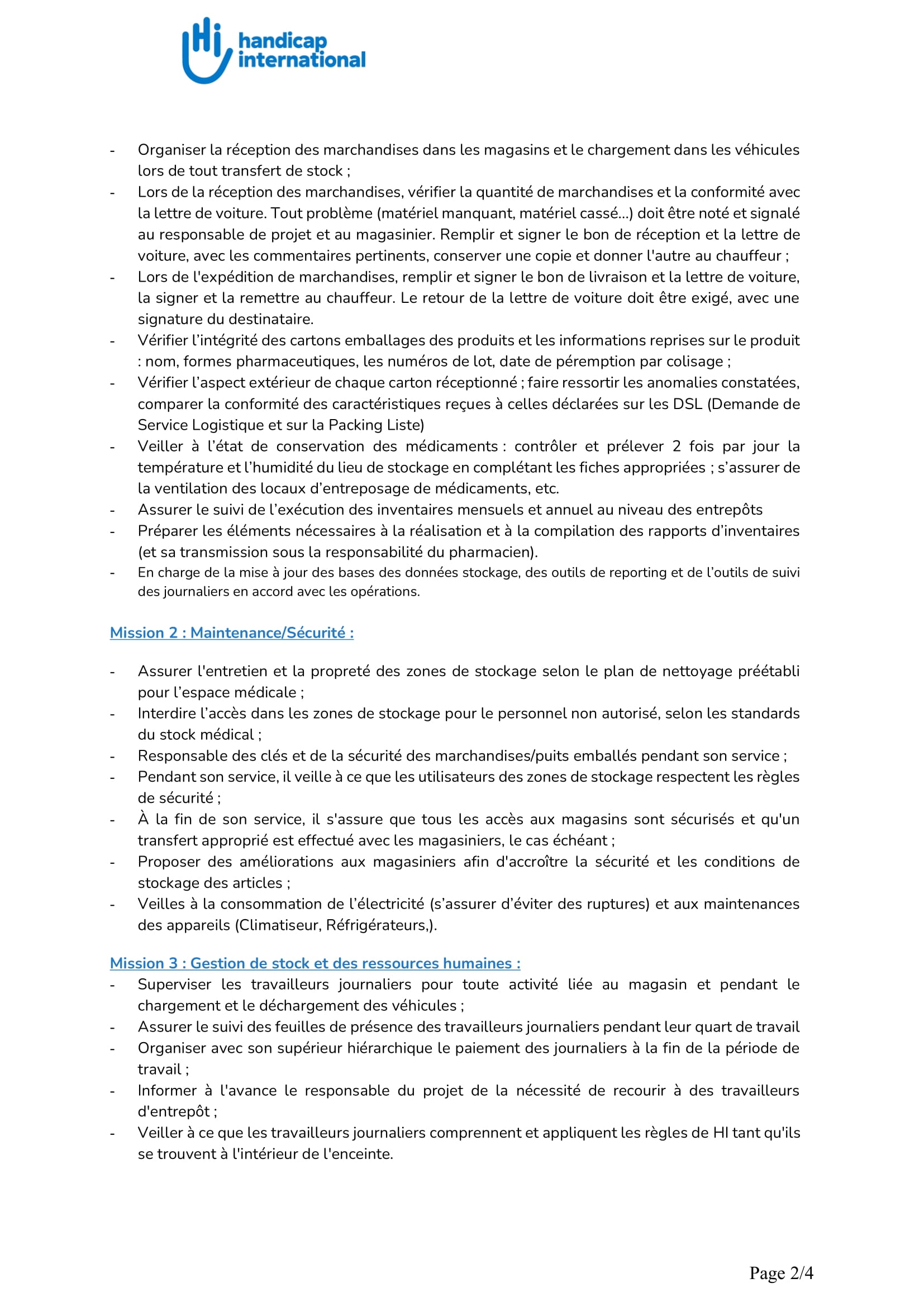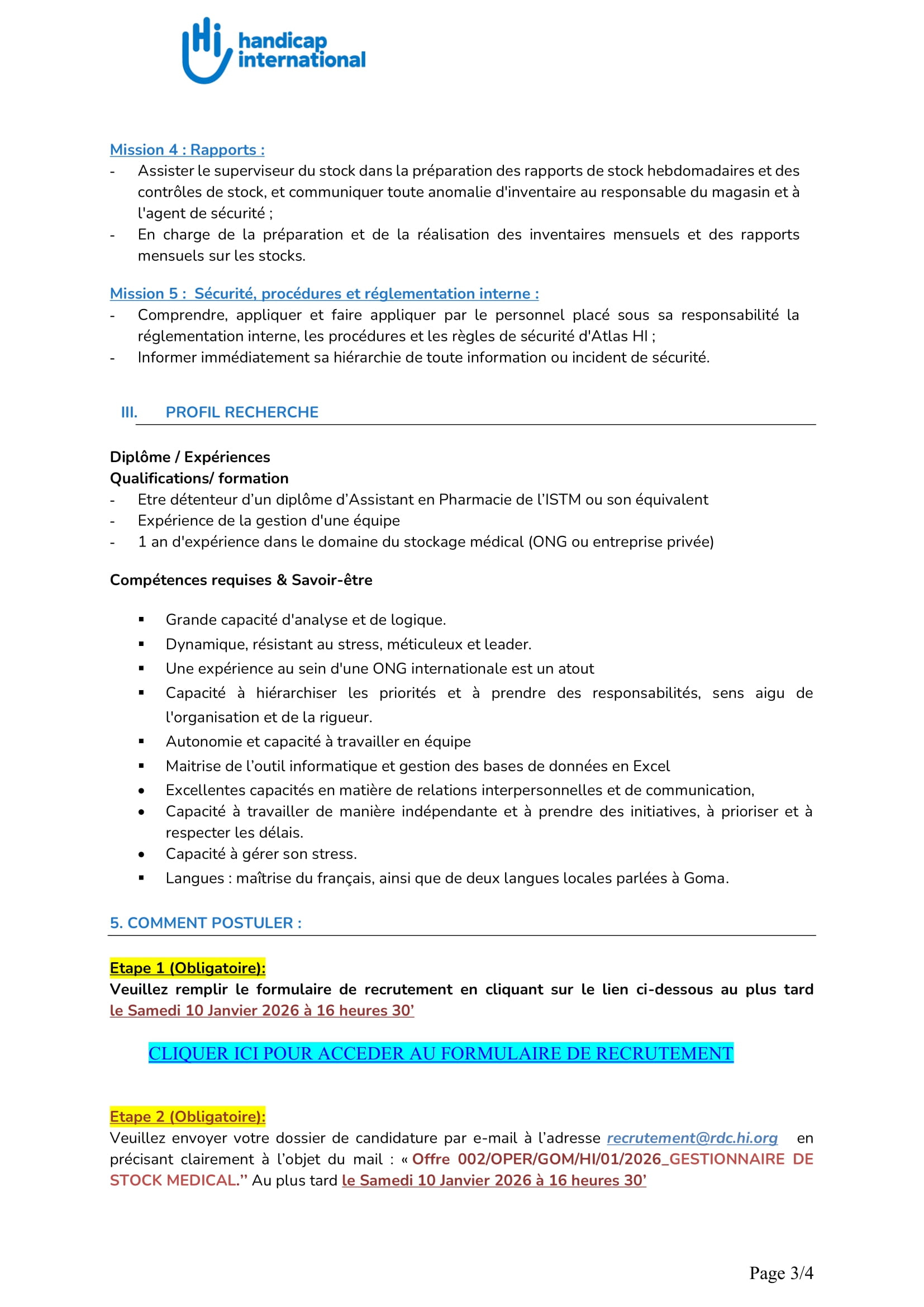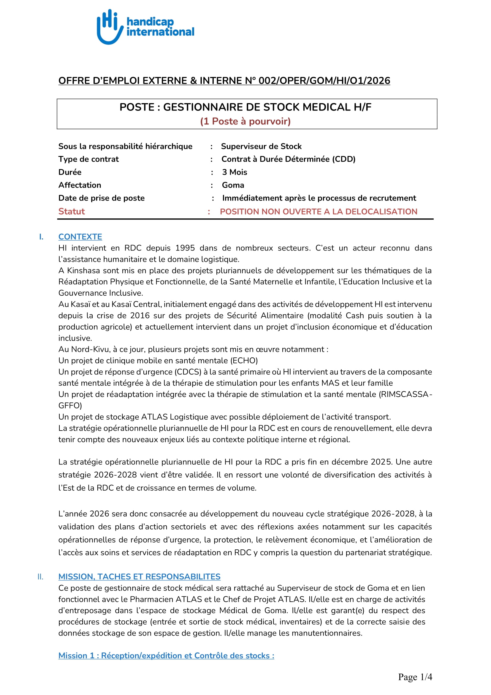 Accueil » Opportunités » Afrique » RD Congo » Humanité & Inclusion (HI) recherche un(e) Gestionnaire de stock médical, Goma (RDC)