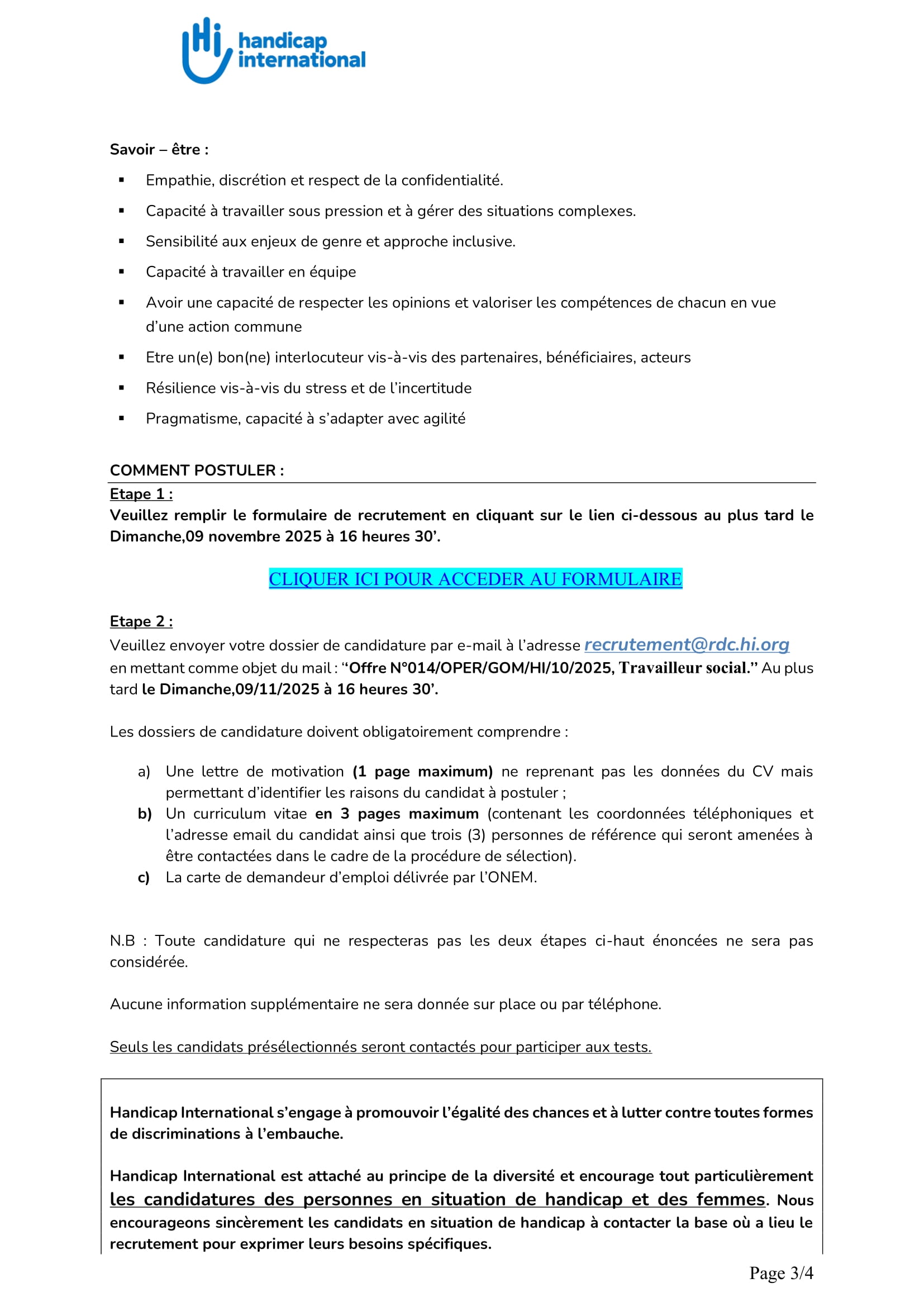 Accueil » Opportunités » Afrique » RD Congo » Humanité et Inclusion recrute 03 Travailleurs Sociaux (H/F) à Goma, RDC
