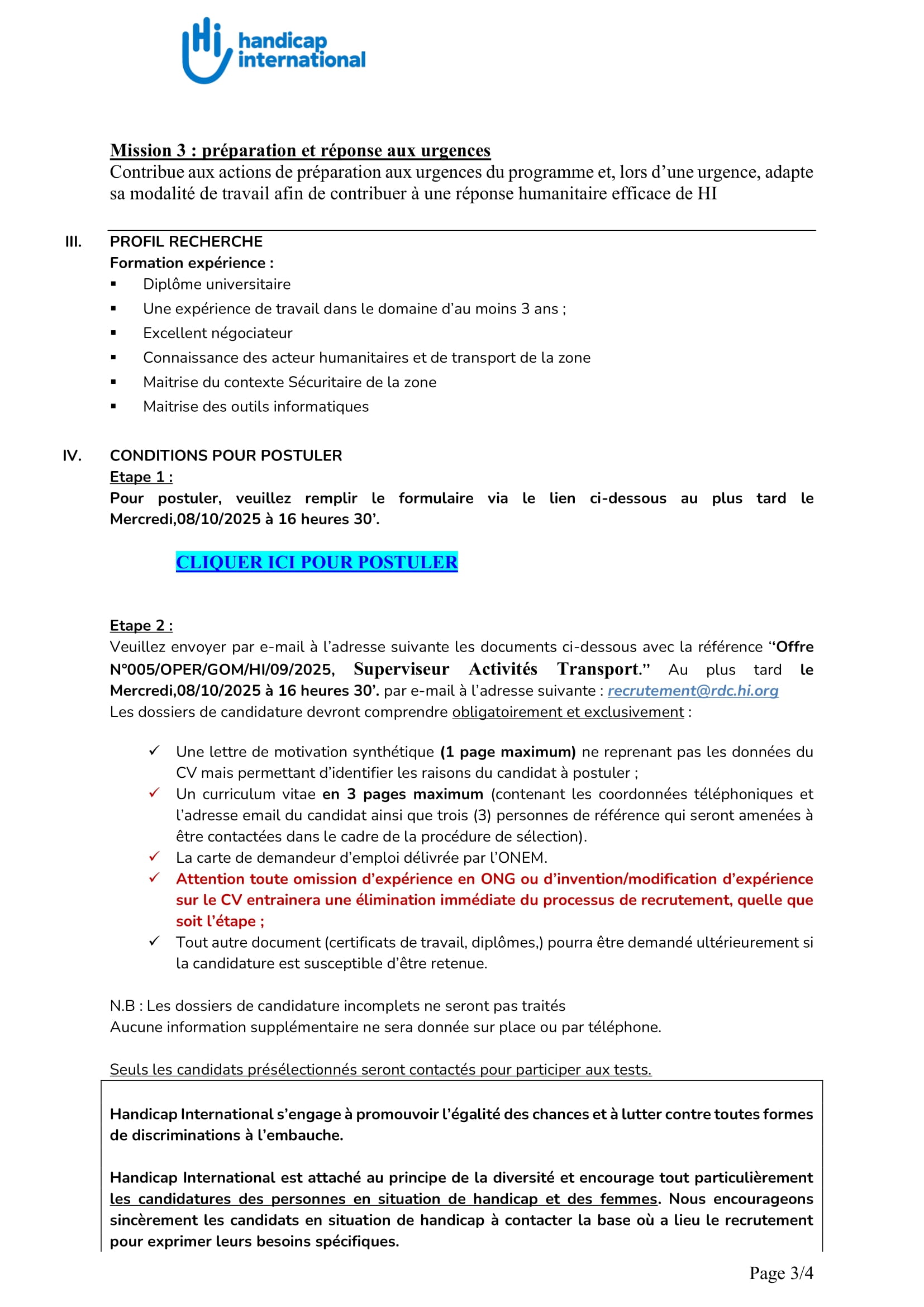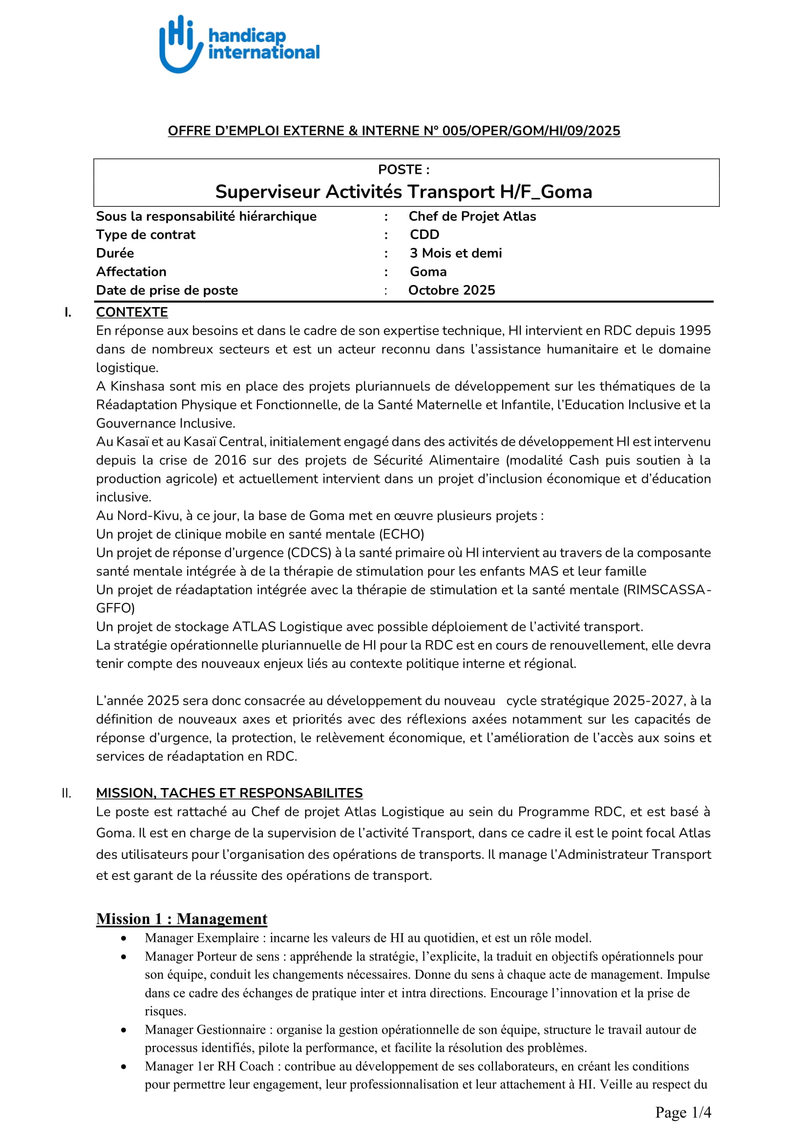 Accueil » Opportunités » Afrique » RD Congo » Humanité et Inclusion (H/F) recrute un Superviseur des Activités Transport (H/F) à Goma, RDC