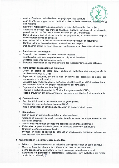 Accueil » Opportunités » Afrique » Rép. Centrafricaine » Le Centre de Support en Santé Internationale (CSSI) recrute un(e) Directeur(rice) Pays et Coordinateur(rice) Médical, Bangui, République Centrafricaine