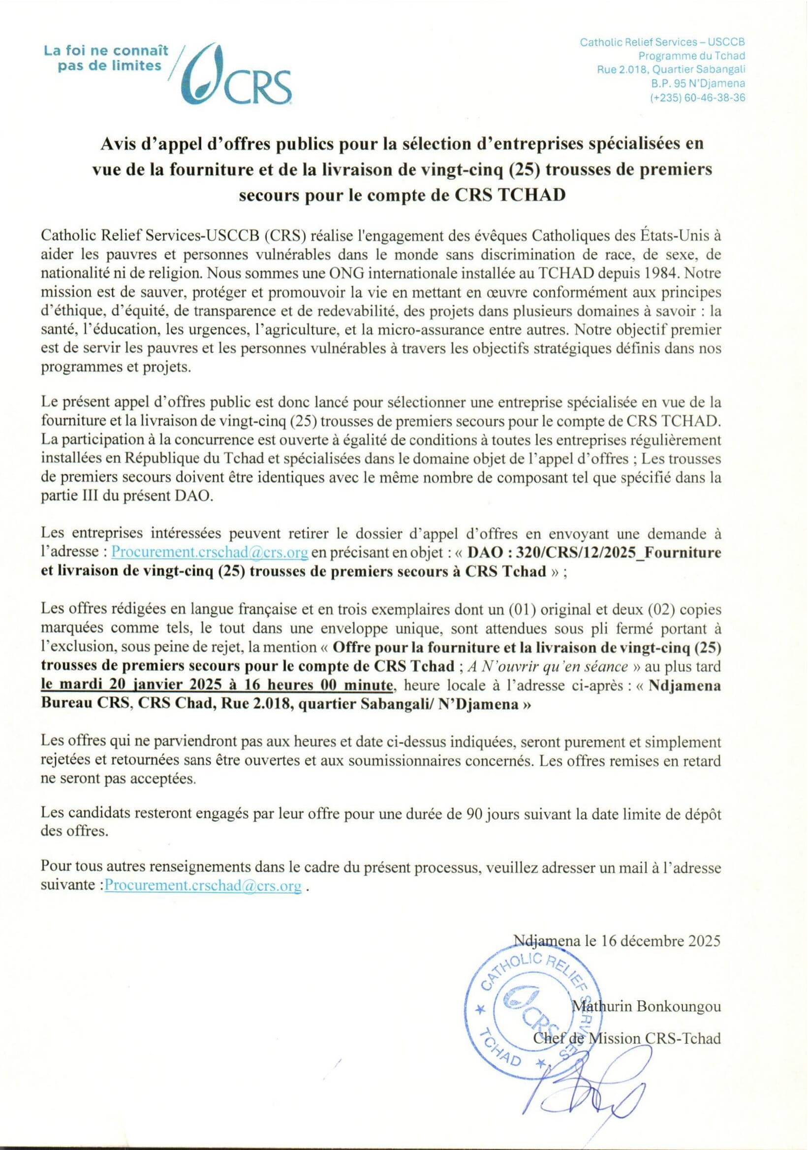 Accueil » Opportunités » Afrique » Tchad » Catholic Relief Services lance un avis d’appel d’offres pour la sélection des Entreprises spécialisées en vue de la fourniture et de la livraison de vingt-cinq trousses de premiers secours, Tchad
