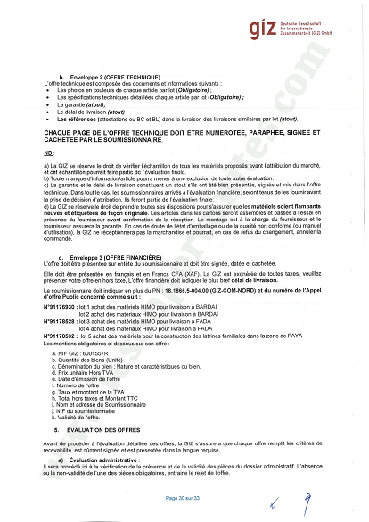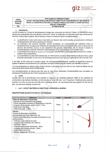 Accueil » Opportunités » Afrique » Tchad » Avis d’appel d’offre : La GIZ lance un avis d’appel d’offres pour l’achat des matériels-matériaux HIMO pour Fada/Bardai et matériels pour la construction des latrines familiales dans la zone de Faya, Projet COM NORD, Tchad