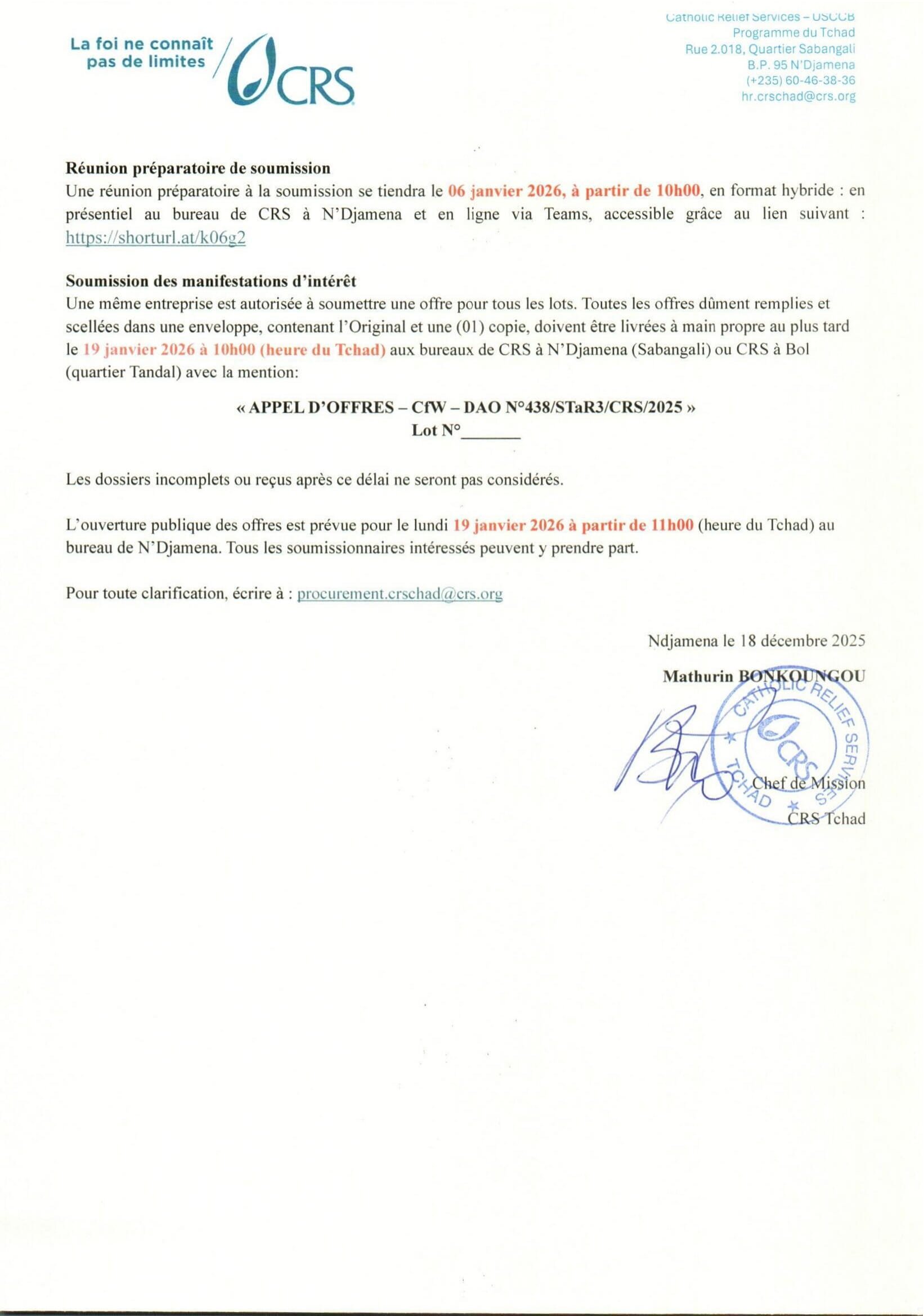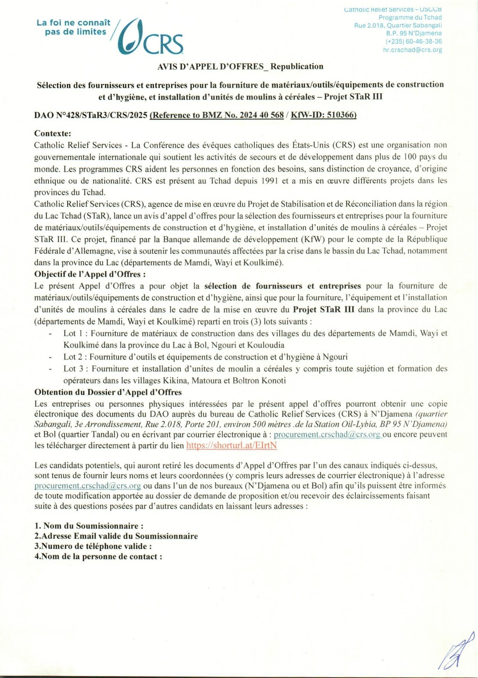 Accueil » Opportunités » Afrique » Tchad » Catholic Relief Services (CRS) au Tchad lance un avis d’appel d’offres pour la sélection des Fournisseurs et Entreprises pour la fourniture de matériaux/outils/équipements de construction et d’hygiène, et installation d’unités de moulins à céréales dans le cadre du projet StaR III