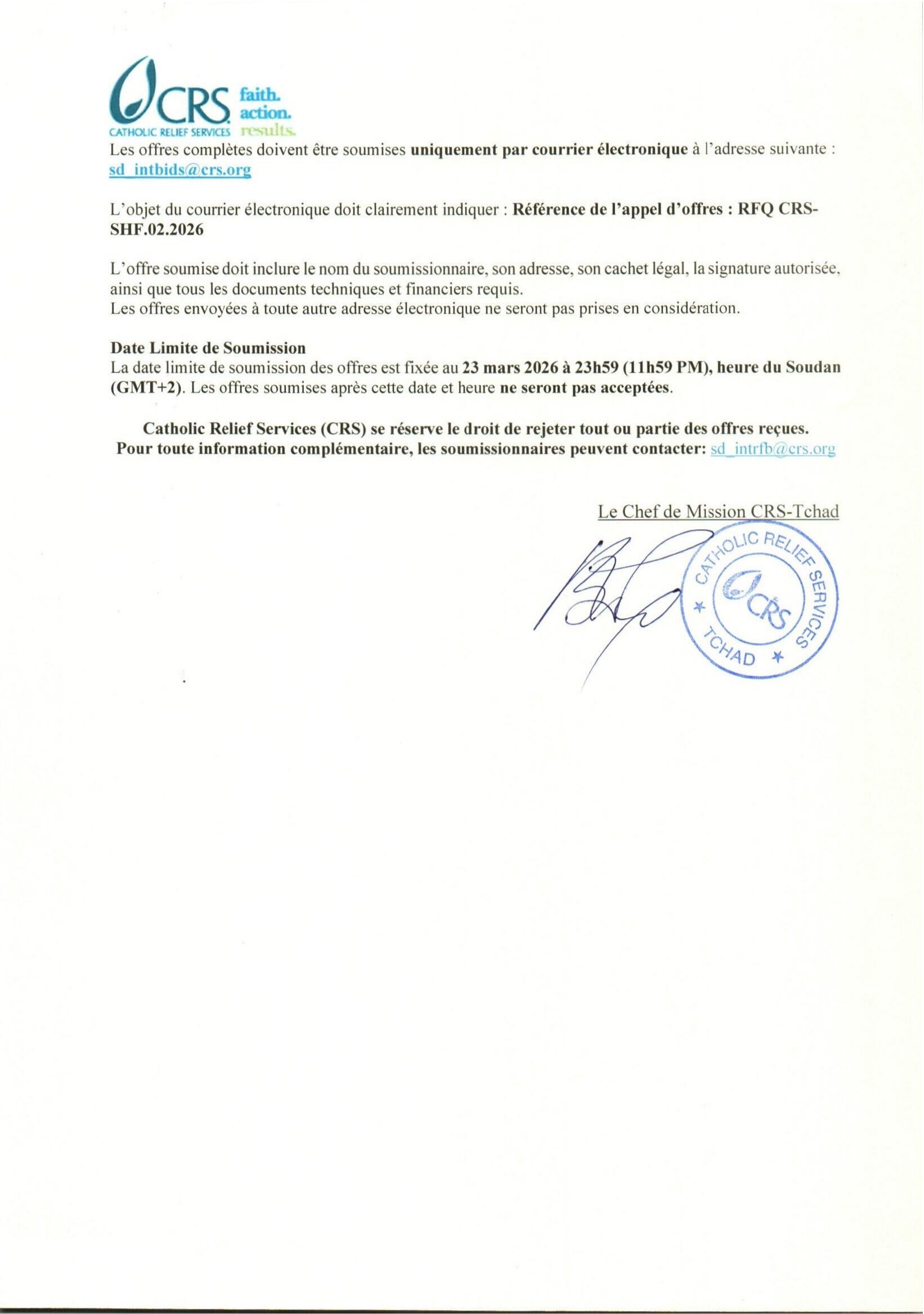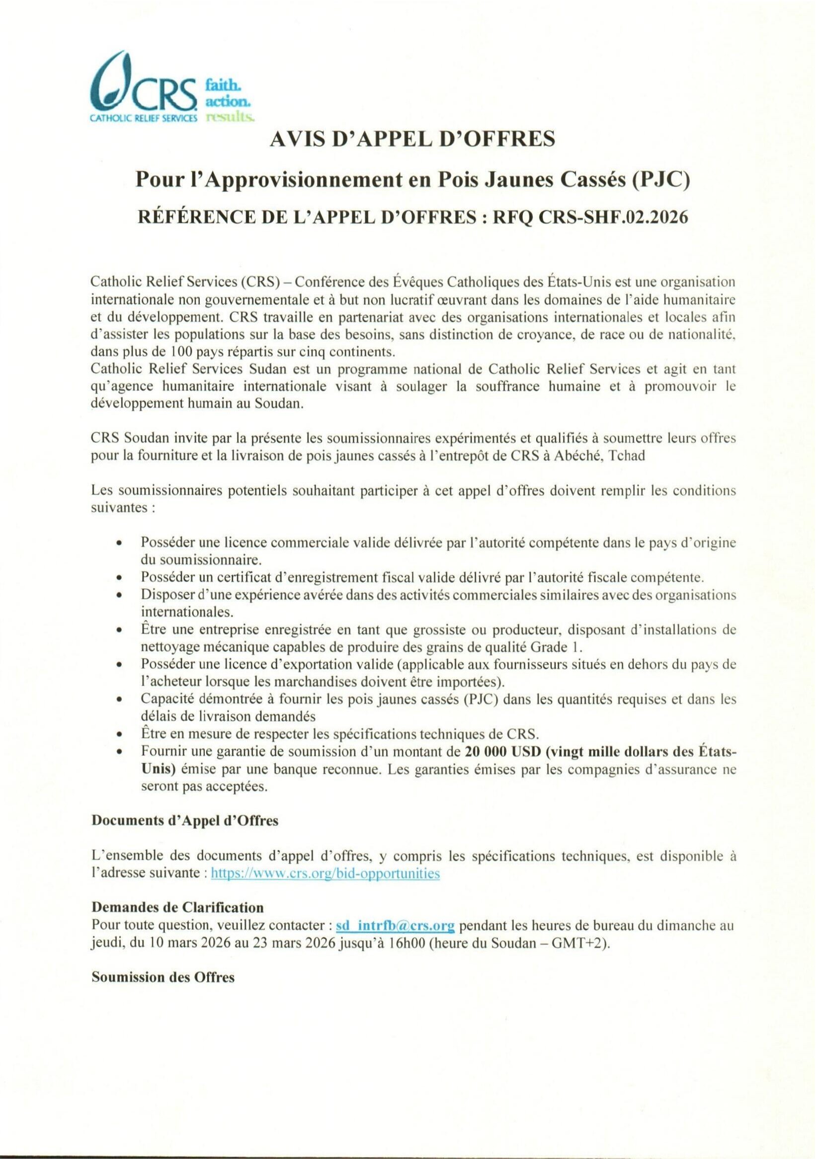 Accueil » Opportunités » Afrique » Tchad » Catholic Relief Services lance un appel d’offres pour la fourniture et la livraison de Pois Jaunes Cassés dans la ville d’Abéché, Tchad