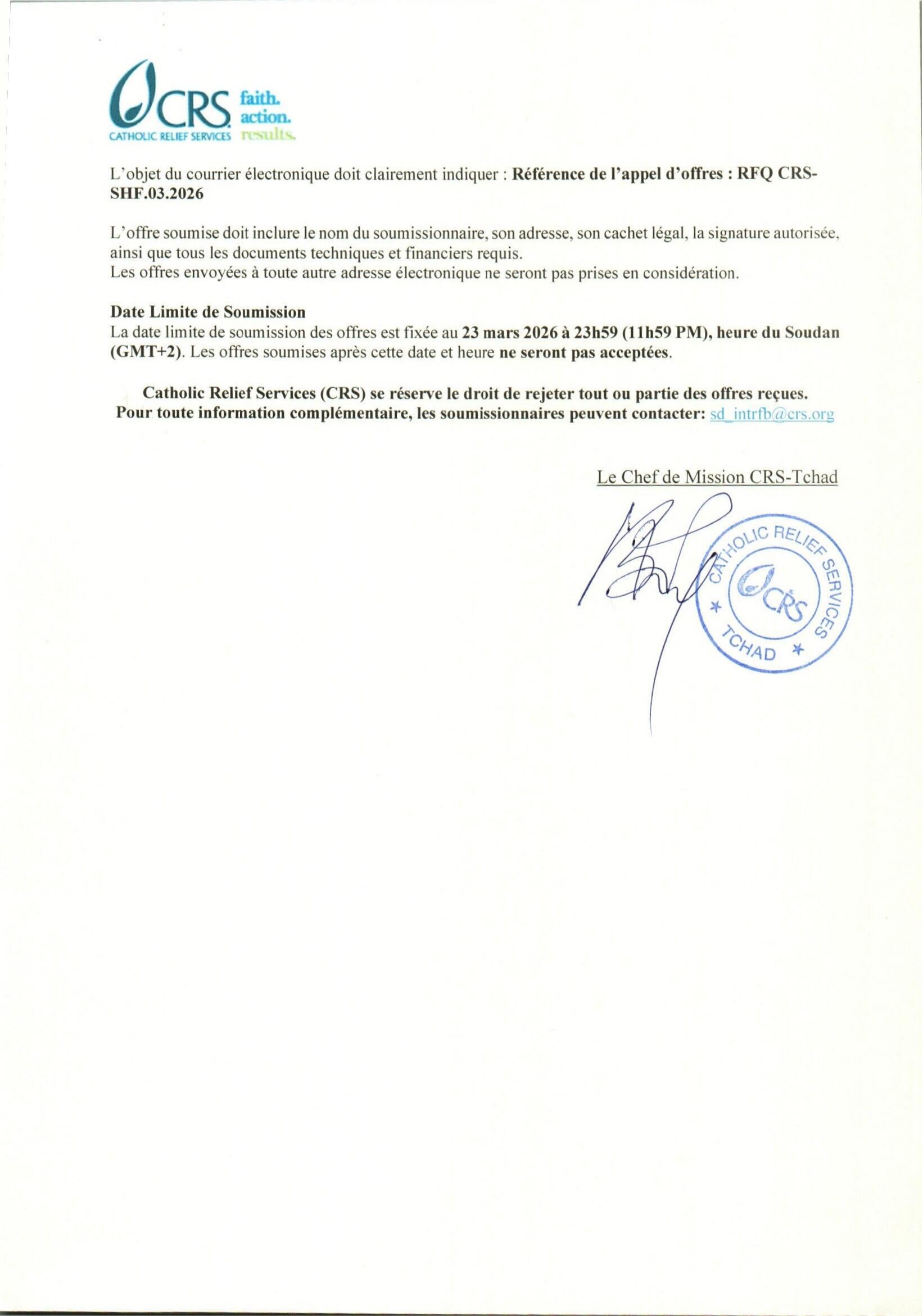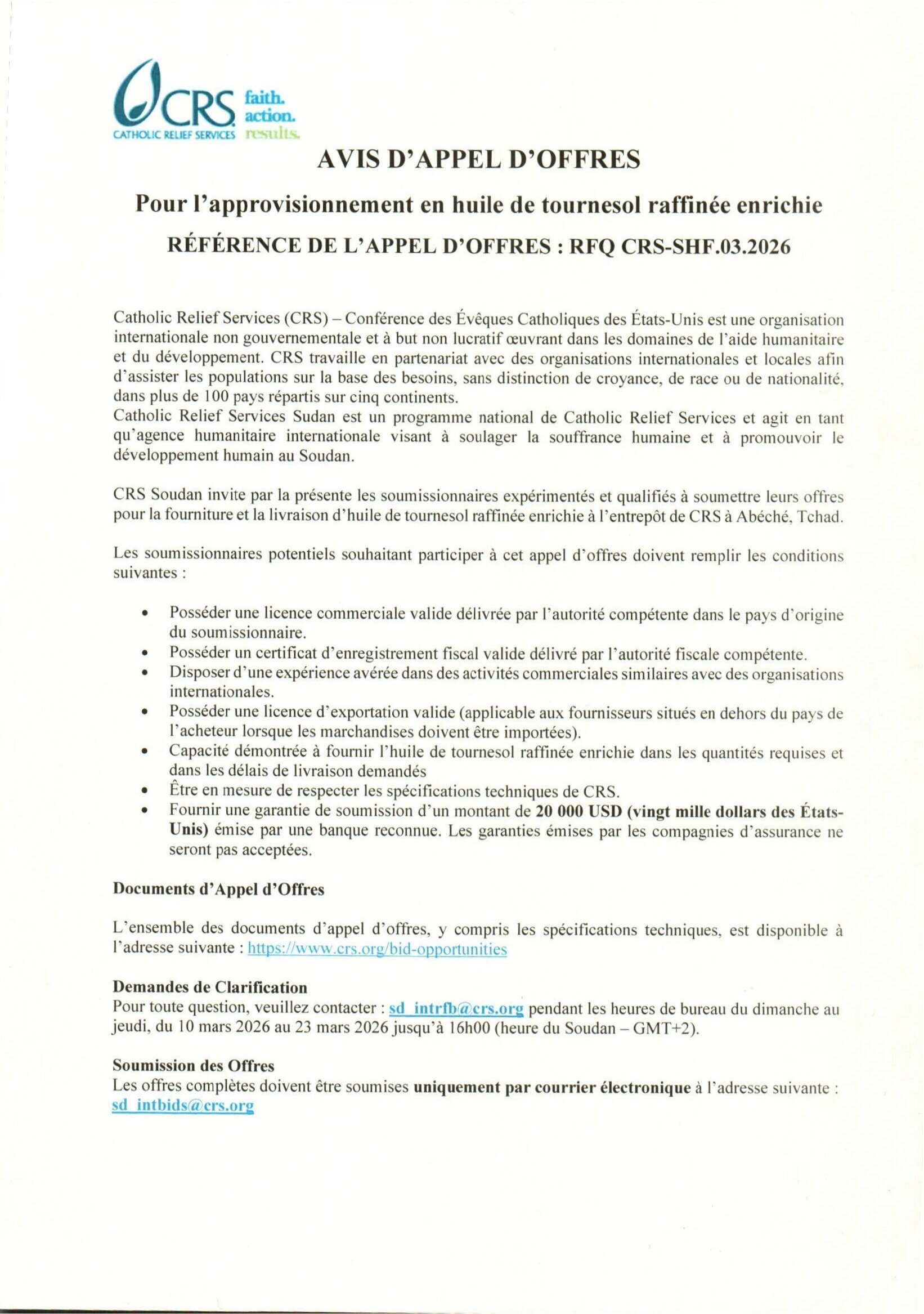 Accueil » Opportunités » Afrique » Tchad » Catholic Relief Services lance un appel d’offres pour la fourniture et la livraison d’huile de tournesol raffinée enrichie dans la ville d’Abéché, Tchad