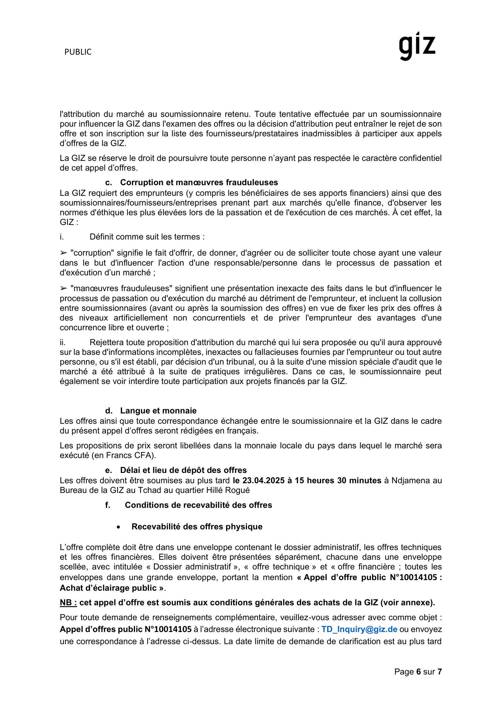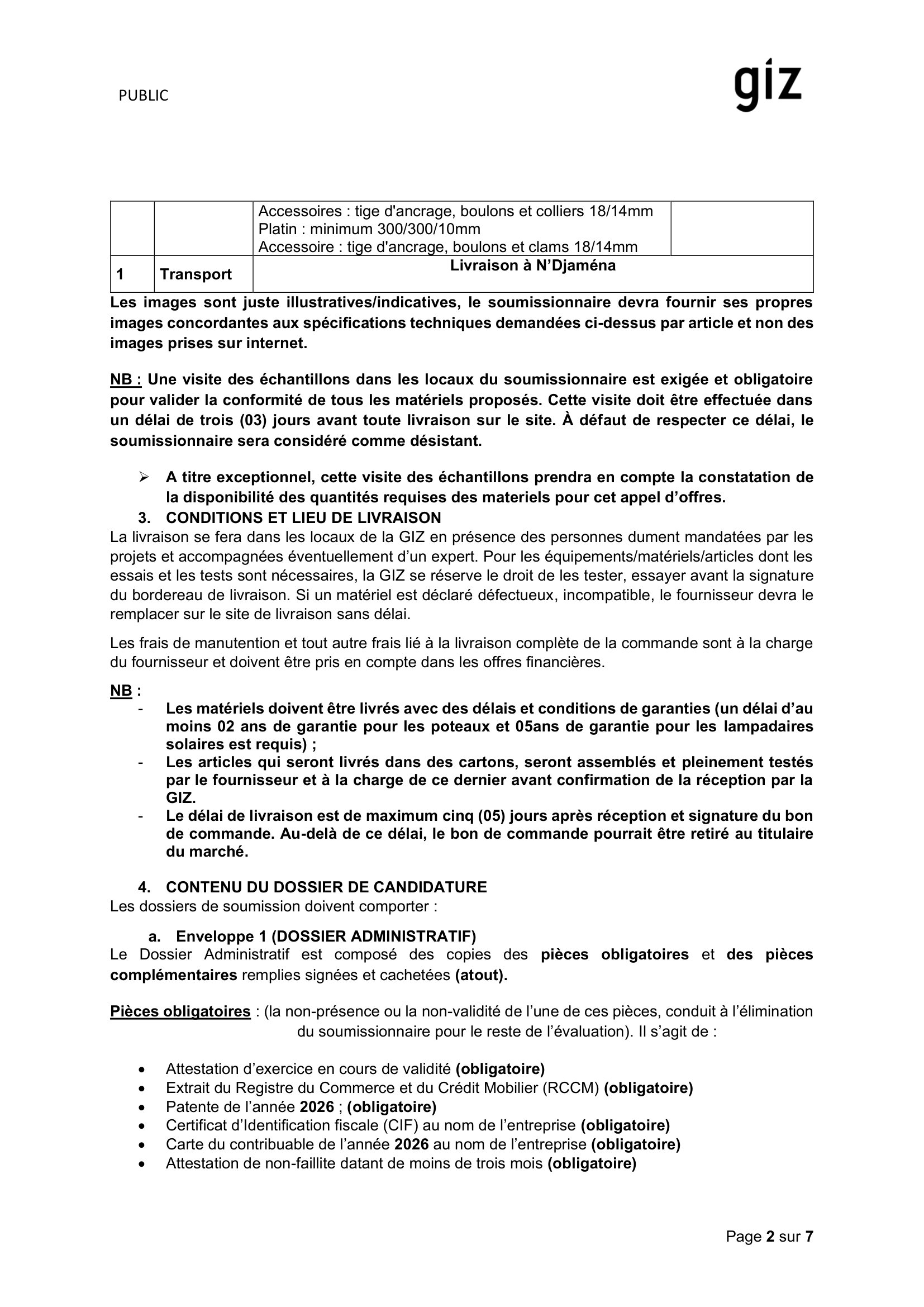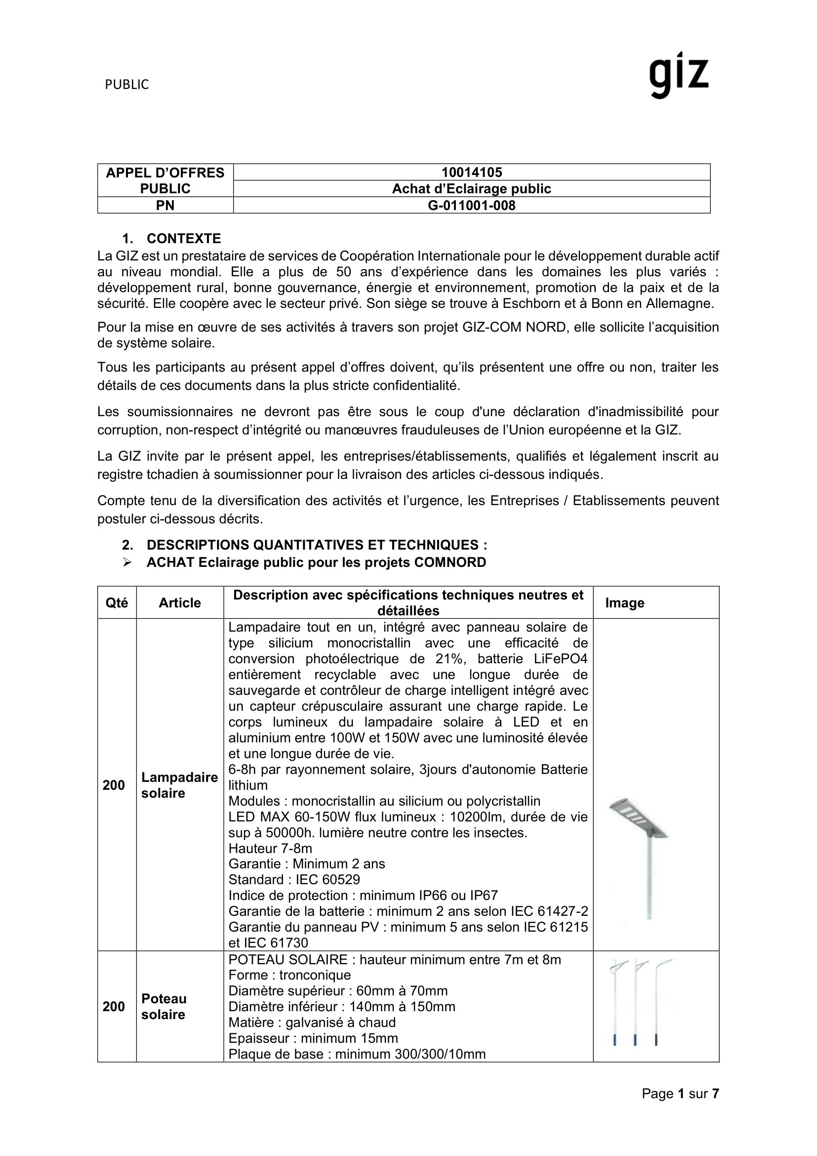 Accueil » Opportunités » Afrique » Tchad » La GIZ lance un appel d’offres pour la sélection d’entreprises et d’établissements qualifiés en vue de la fourniture et de la livraison d’éclairage public (lampadaires) dans le cadre du projet COMNORD