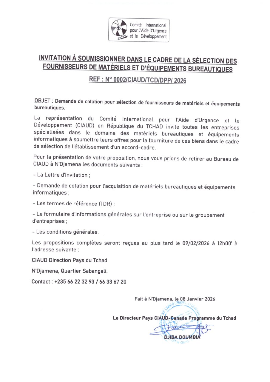Accueil » Opportunités » Afrique » Tchad » Le CIAUD lance un avis d’appel d’offres pour la sélection de Fournisseurs de matériels et équipements bureautiques, Tchad