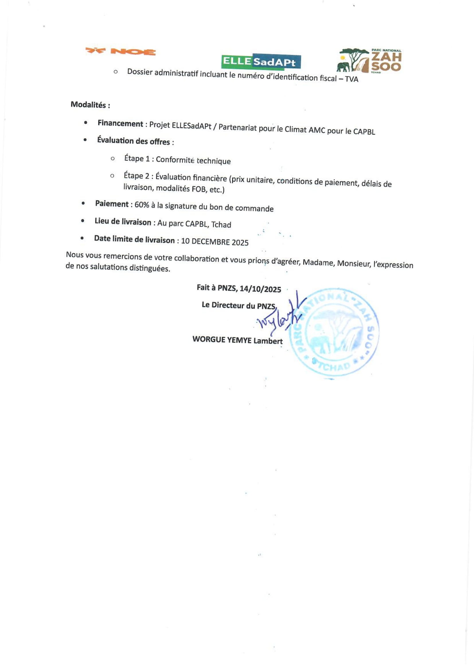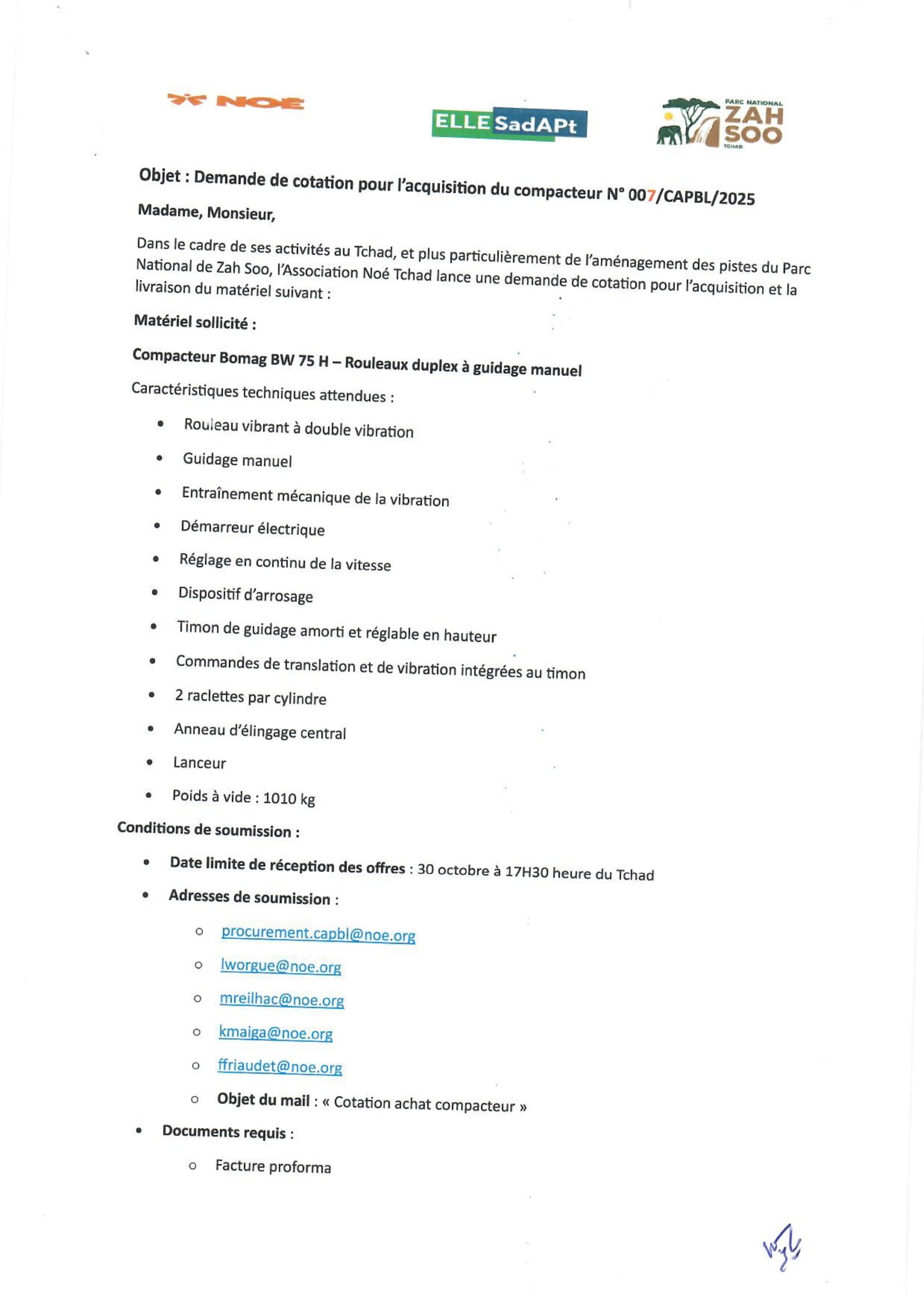 Accueil » Opportunités » Afrique » Tchad » Noé lance un avis d’appel d’offres pour l’Achat d’un Compacteur Bomag BW 75 H dans le cadre de l’aménagement des pistes du Parc National de Zah Soo, Tchad