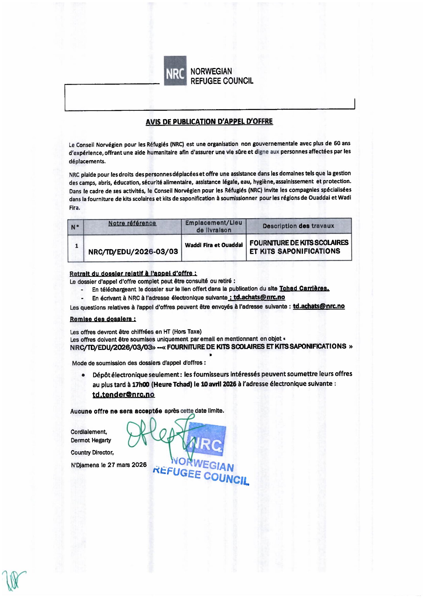 Accueil » Opportunités » Afrique » Tchad » NRC lance un appel d’offres pour la sélection d’un Fournisseur pour la fourniture de kits scolaires et kits de saponification dans les régions de Ouaddaï et Wadi Fira, Tchad