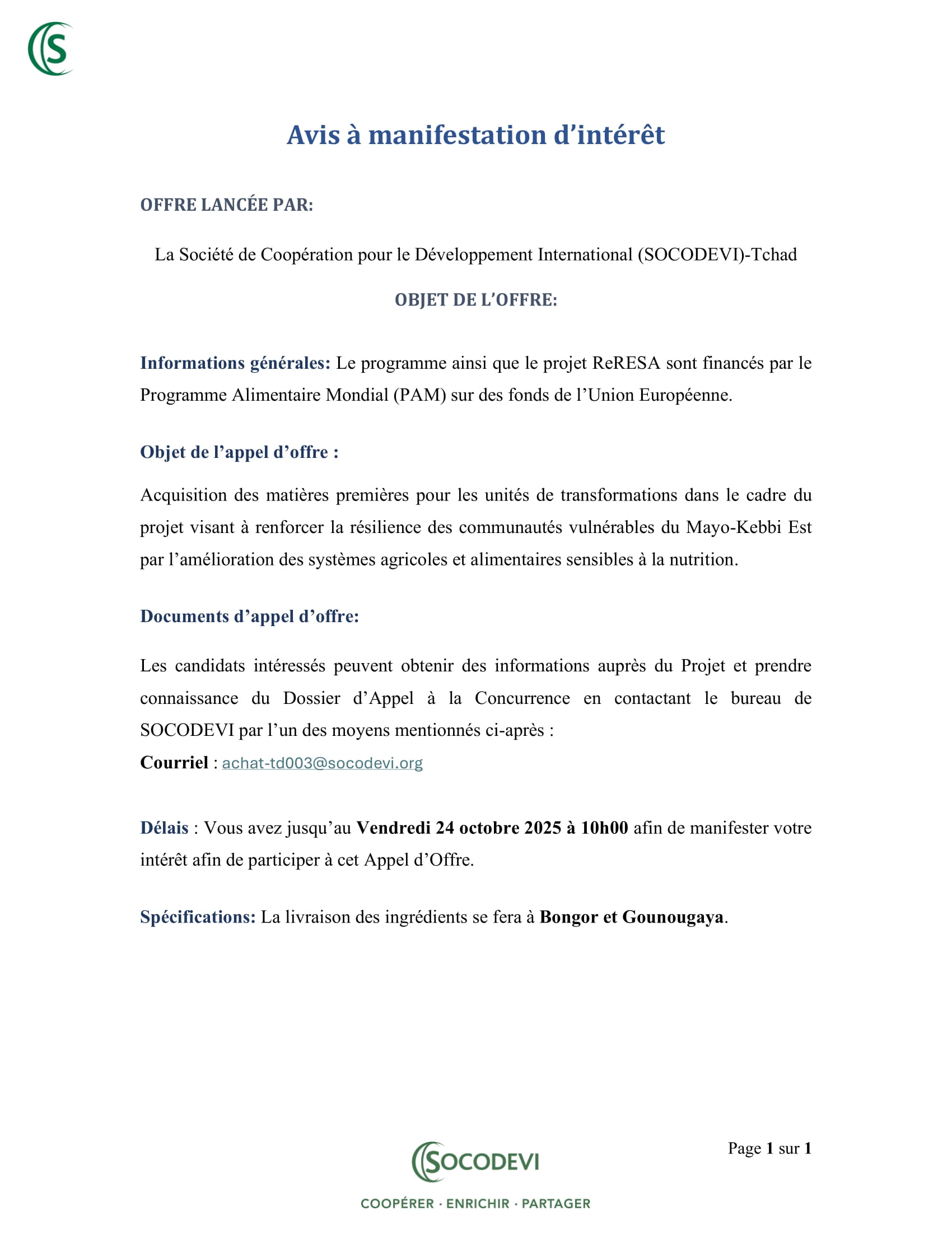 Accueil » Opportunités » Afrique » Tchad » SOCODEVI lance un avis d’appel d’offres pour l’acquisition des matières premières pour les unités de transformations dans le cadre de son projet dans le Mayo-Kebbi Est, Tchad