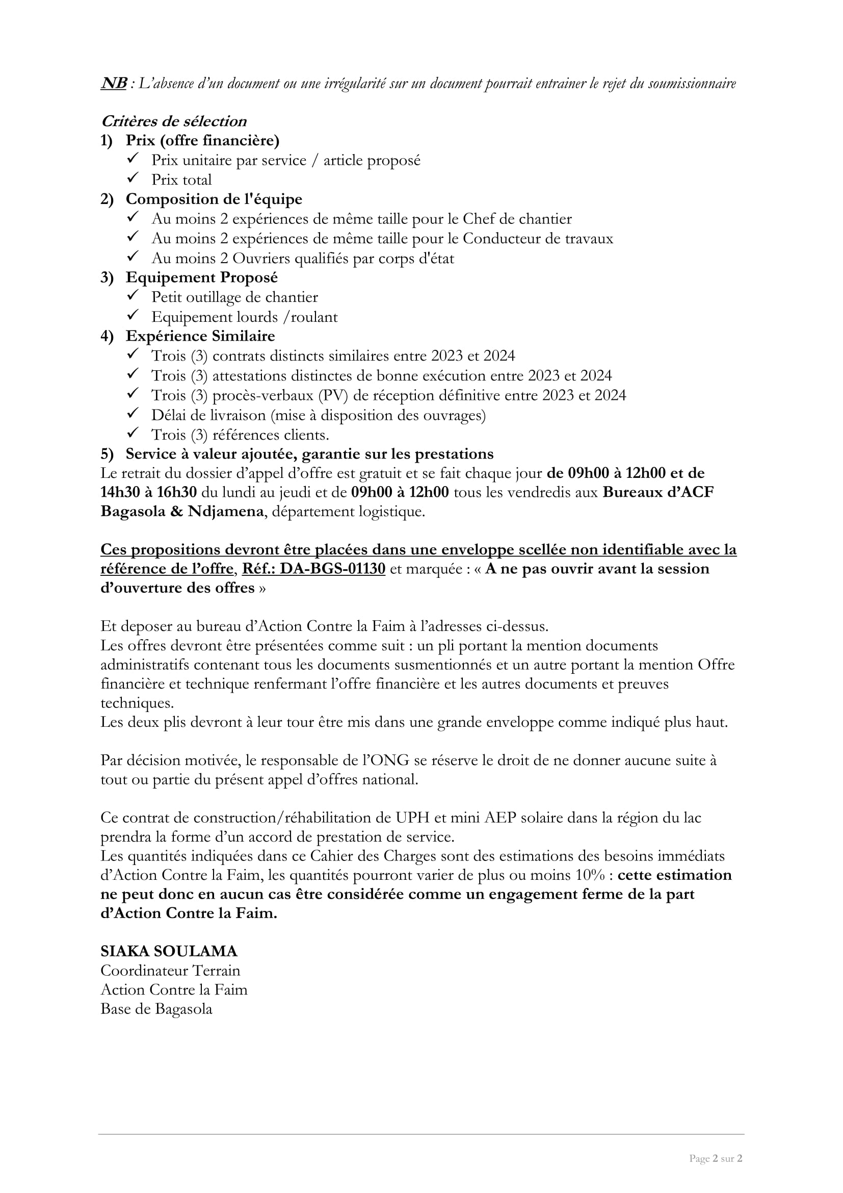 Accueil » Opportunités » Afrique » Tchad » Action Contre la Faim lance un appel d’offre pour la signature d’un contrat d’aménagement hydro-agricole des périmètres irrigués type goute à goute dans la province du Lac, Tchad