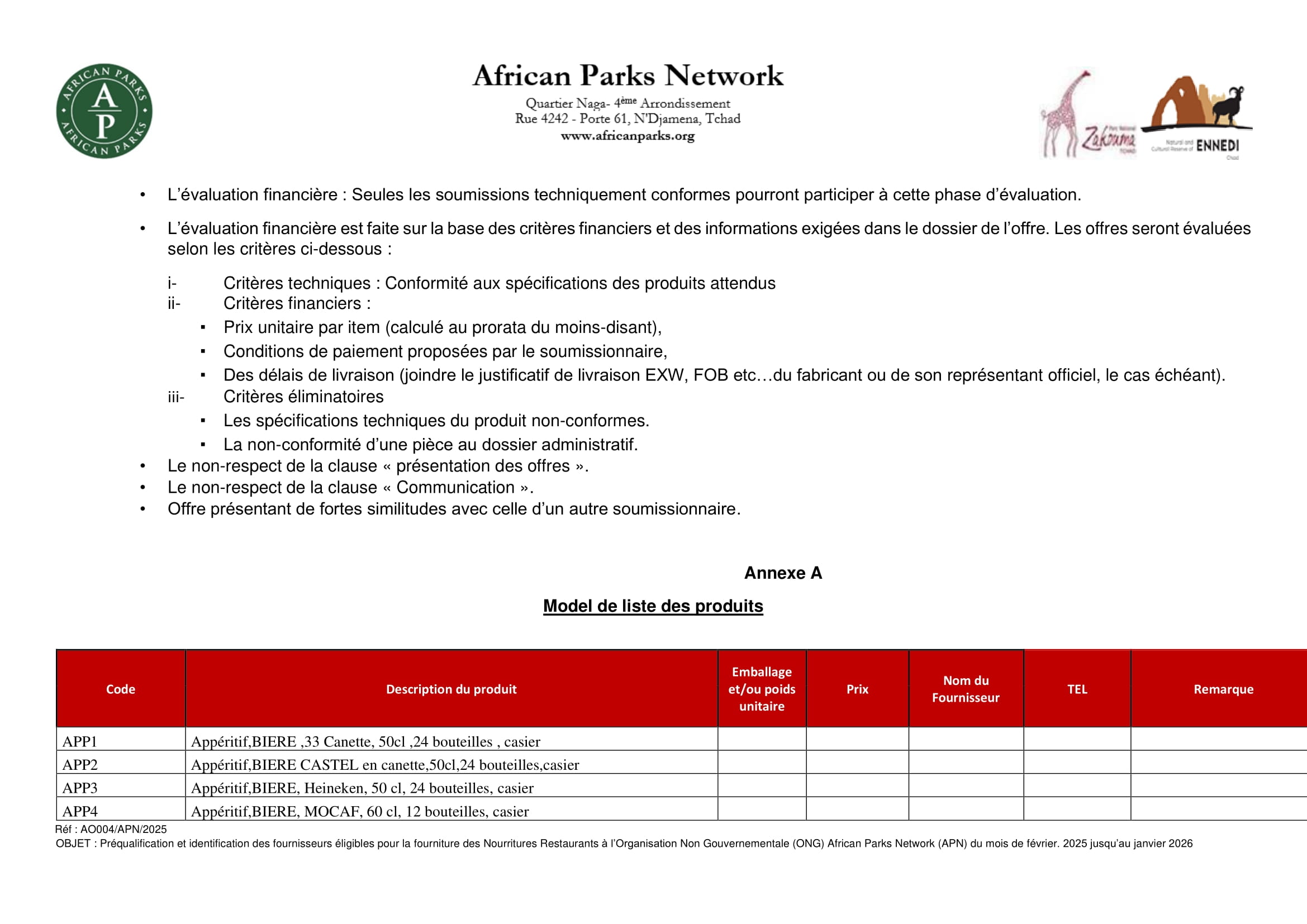 Cliquer ici pour télécharger le fichier PDF : African Parks-Avis d’appel d’offre pour la fourniture de Nourritures Restaurant