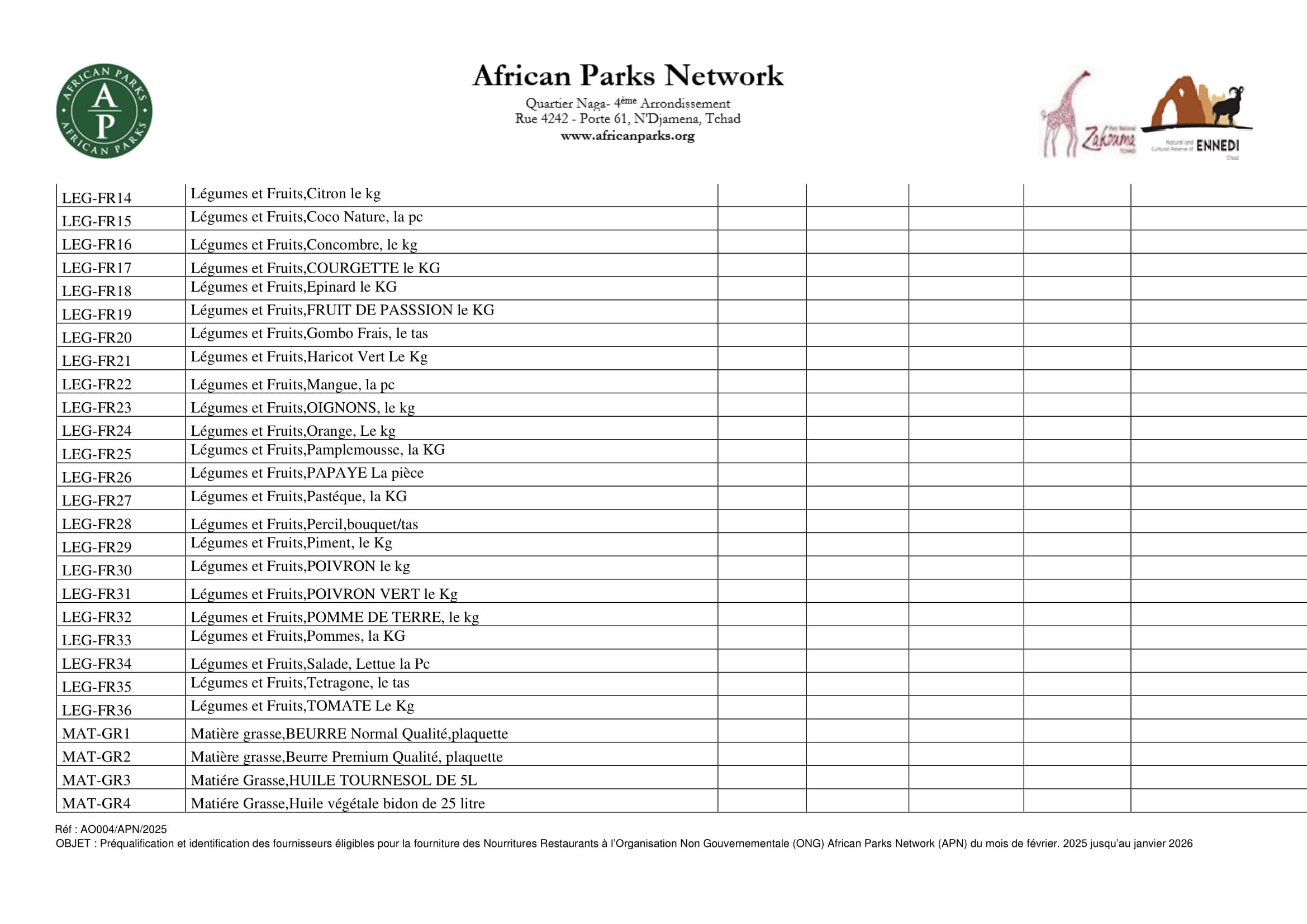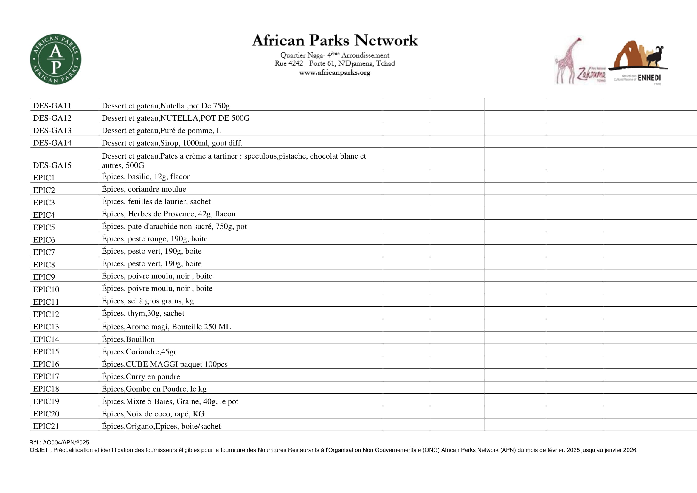 Accueil » Opportunités » Afrique » Tchad » African Parks lance un avis d’appel à manifestation d’intérêt pour la Préqualification et identification des fournisseurs de nourritures restaurants, N’Djamena, Tchad