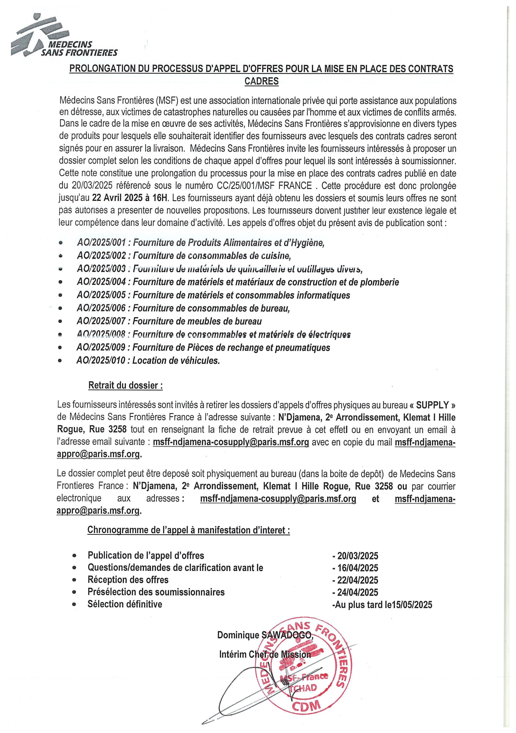 Médecins Sans Frontières (MSF) lance un avis d’appel d’offre pour la mise en place des contrats cadres pour la fourniture de plusieurs produits et matériels, et la location de véhicules, N’Djamena, Tchad