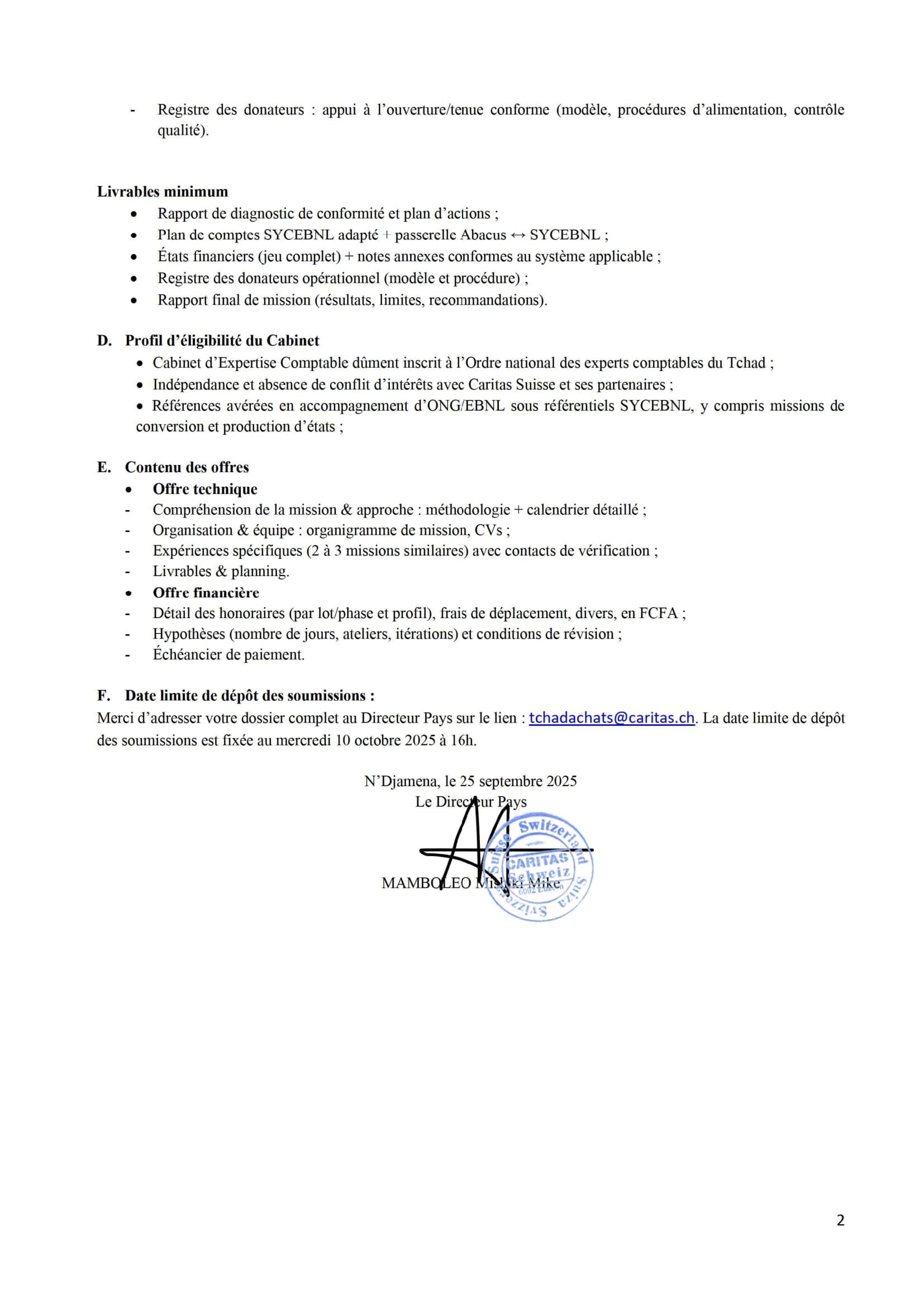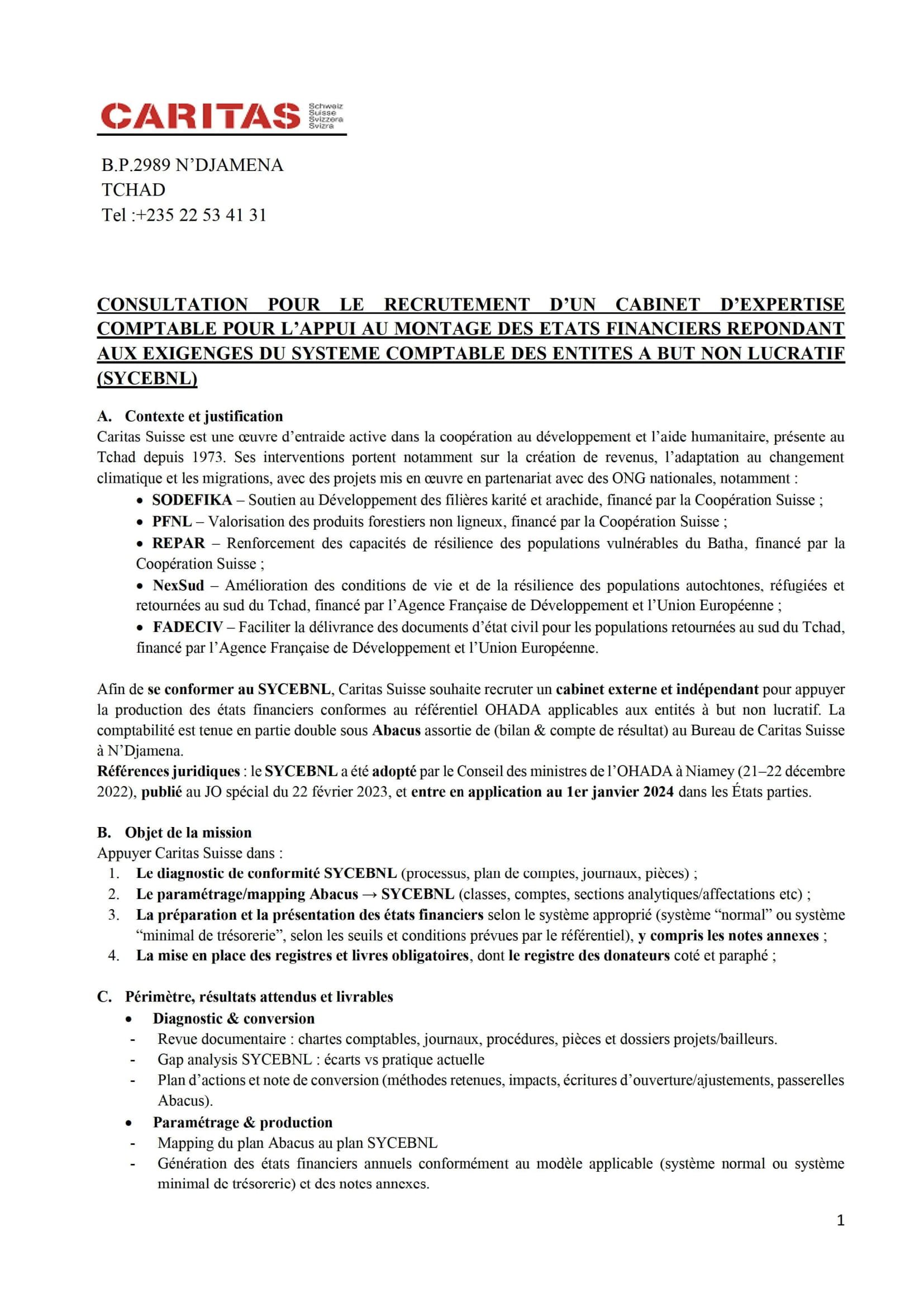 Accueil » Opportunités » Afrique » Tchad » La Caritas Suisse lance un appel d’offre pour le recrutement d’un Cabinet d’expertise comptable, Tchad