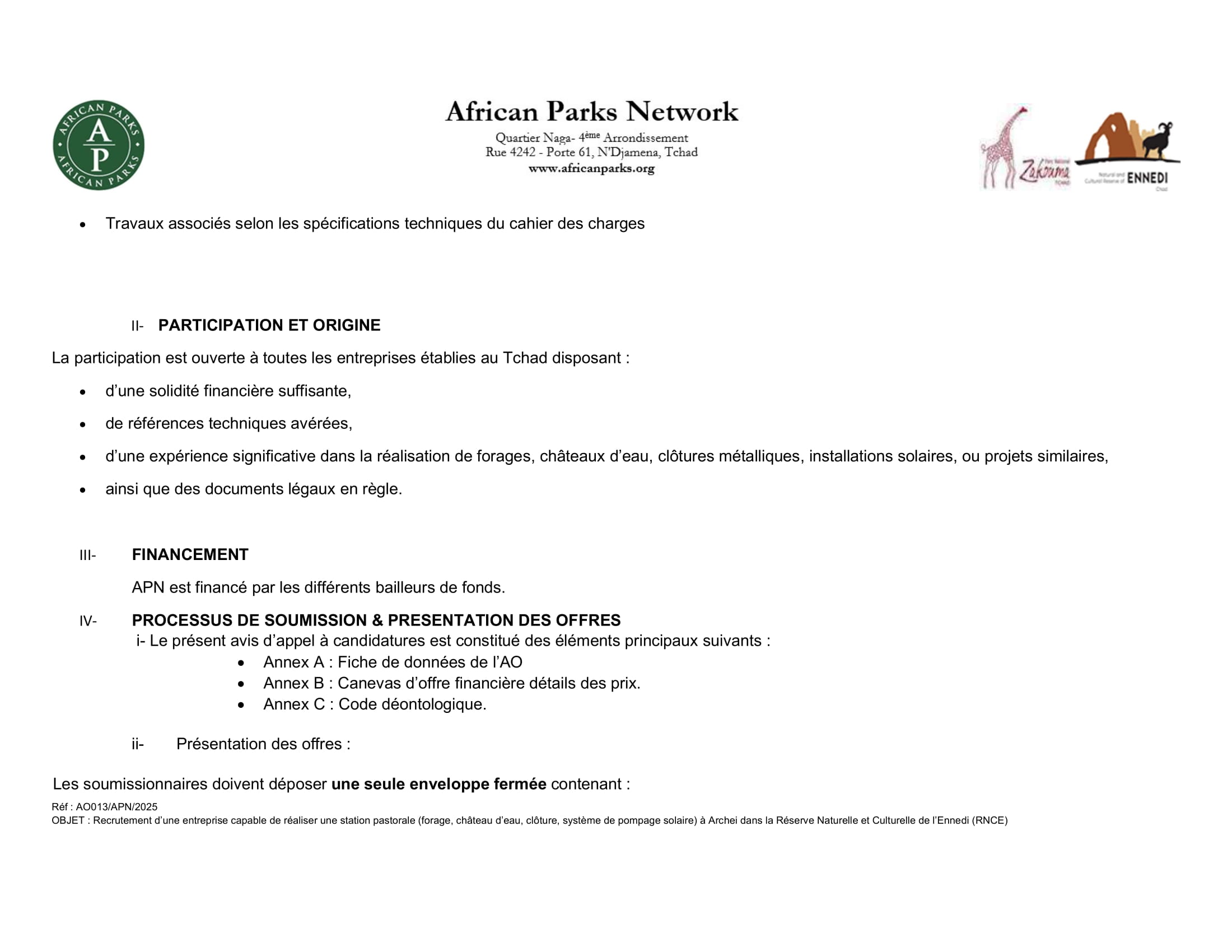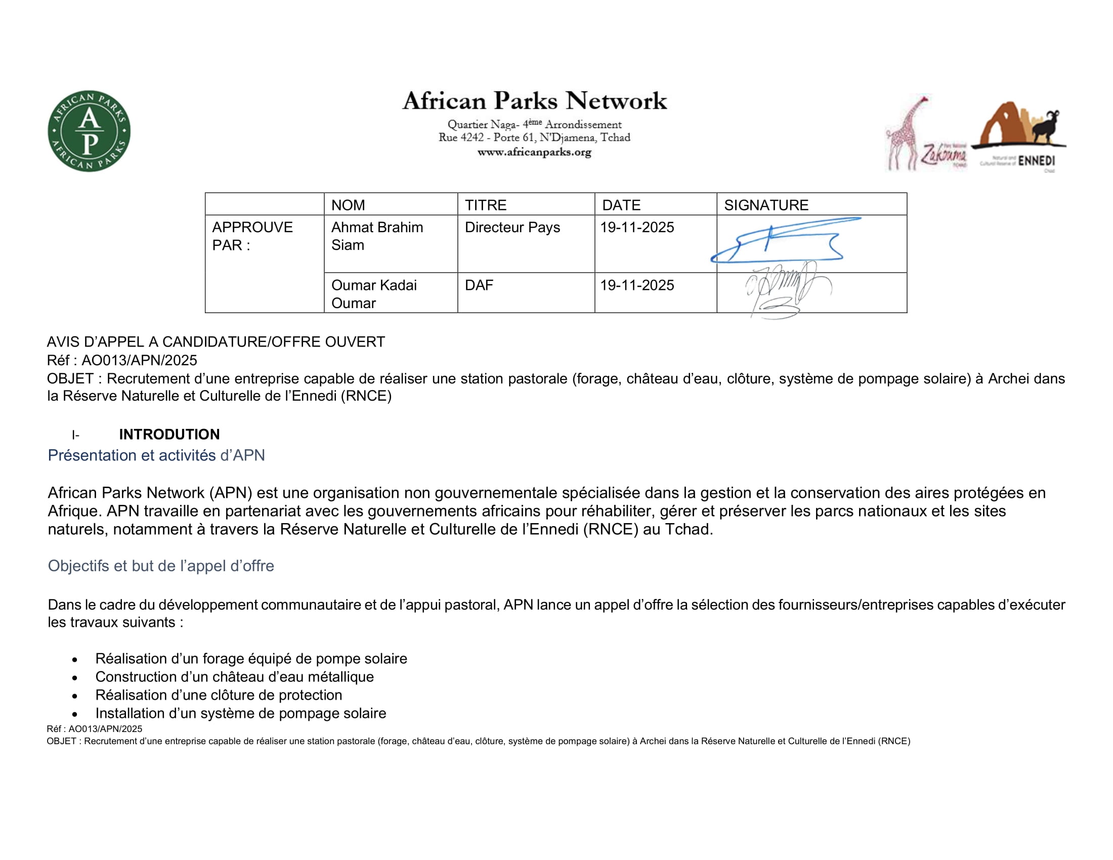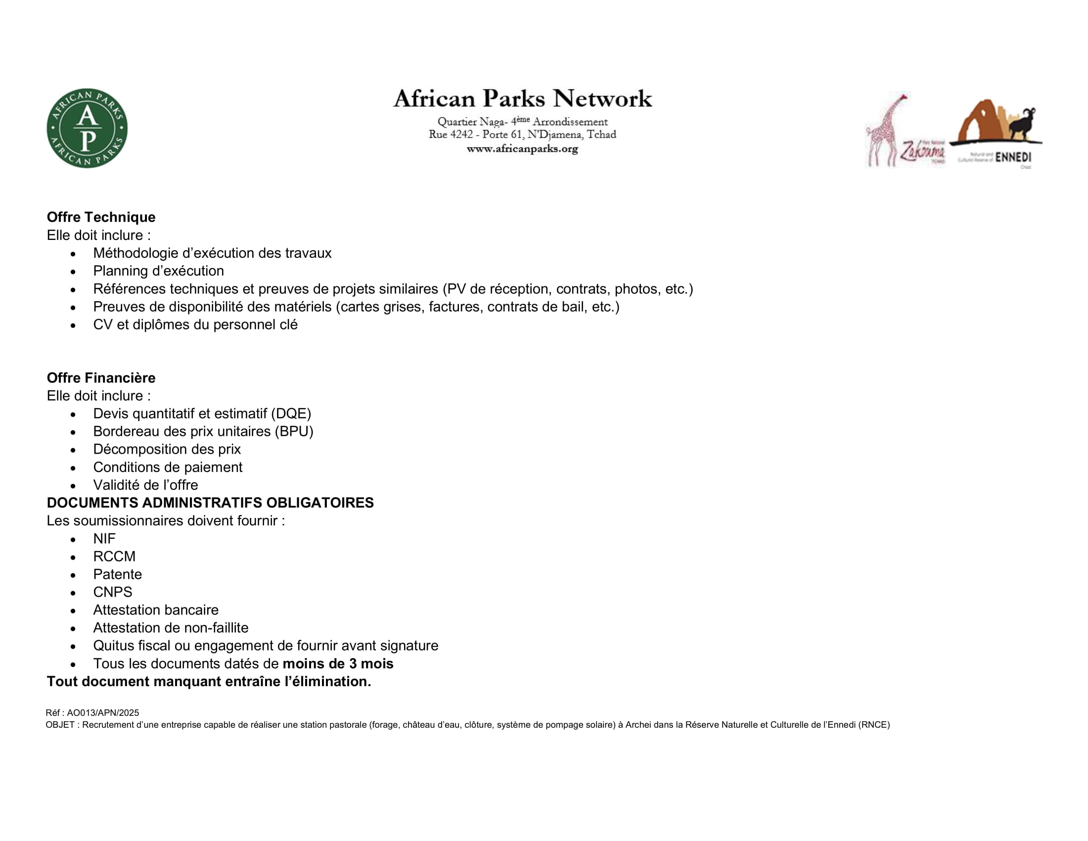 Accueil » Opportunités » Afrique » Tchad » African Parks lance un avis d’appel d’offres pour le recrutement d’une Entreprise pour la réalisation d’une station pastorale (forage, château d’eau, clôture, système de pompage solaire), Tchad