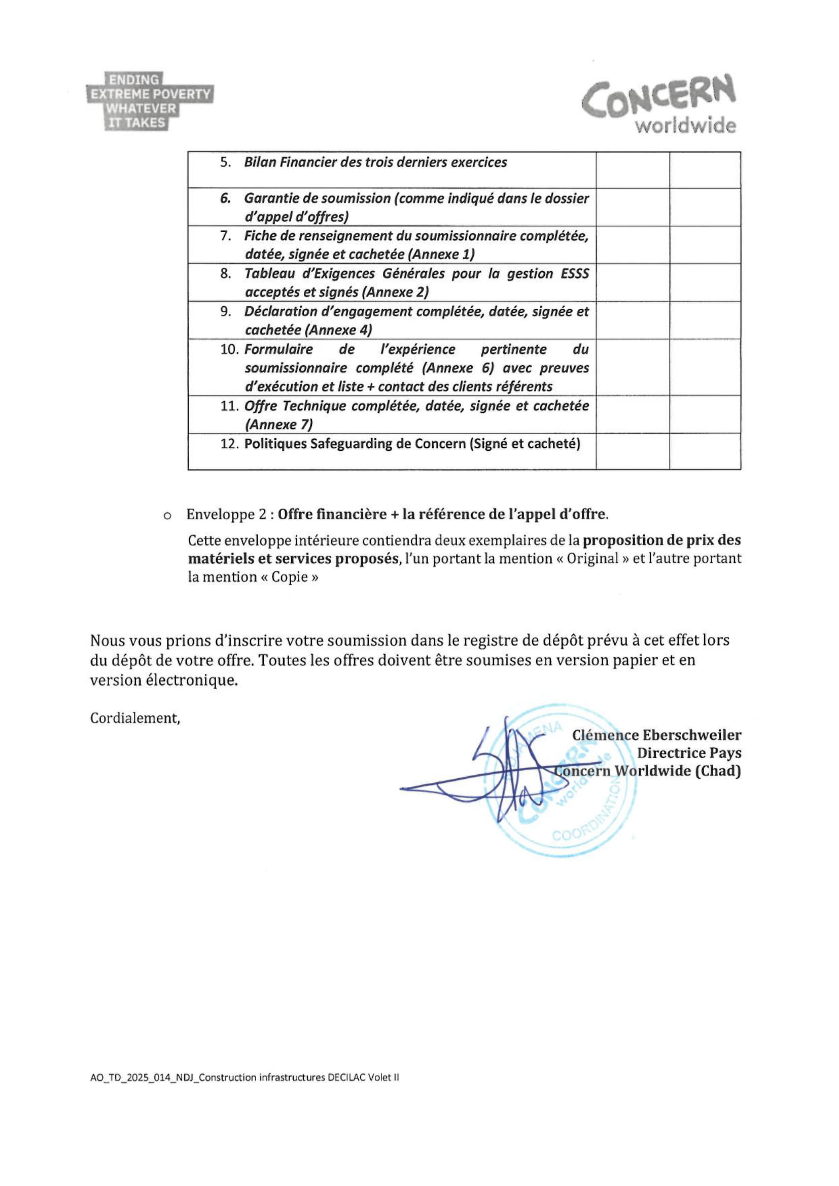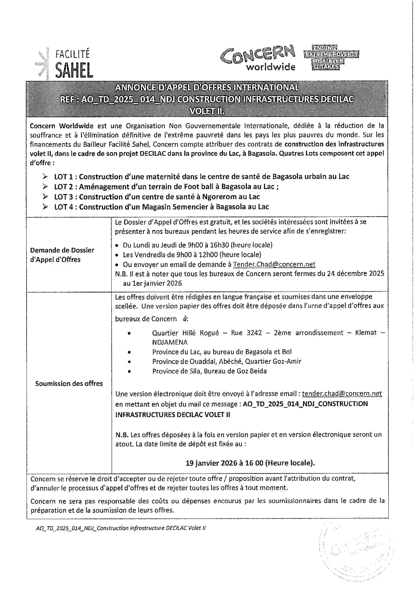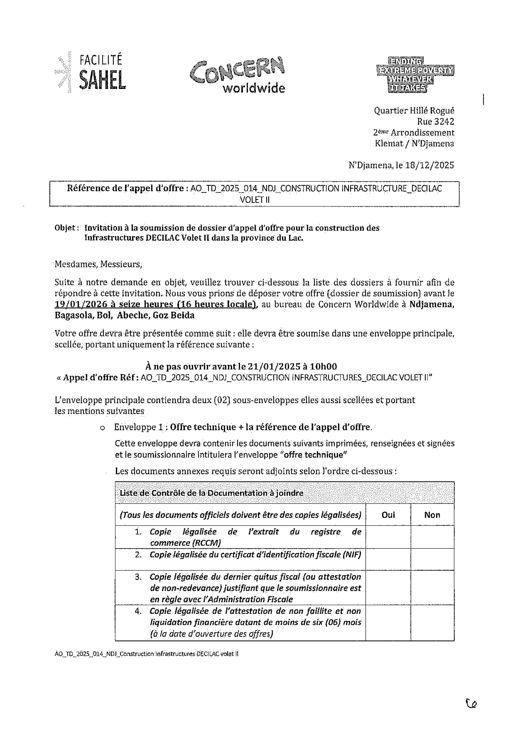 Accueil » Opportunités » Afrique » Tchad » Concern Worldwide au Tchad lance un avis d’appel d’offres pour la sélection d’une Entreprise en vue de réaliser les Travaux de construction et d’aménagement dans le cadre du projet DECILAC, Bagasola