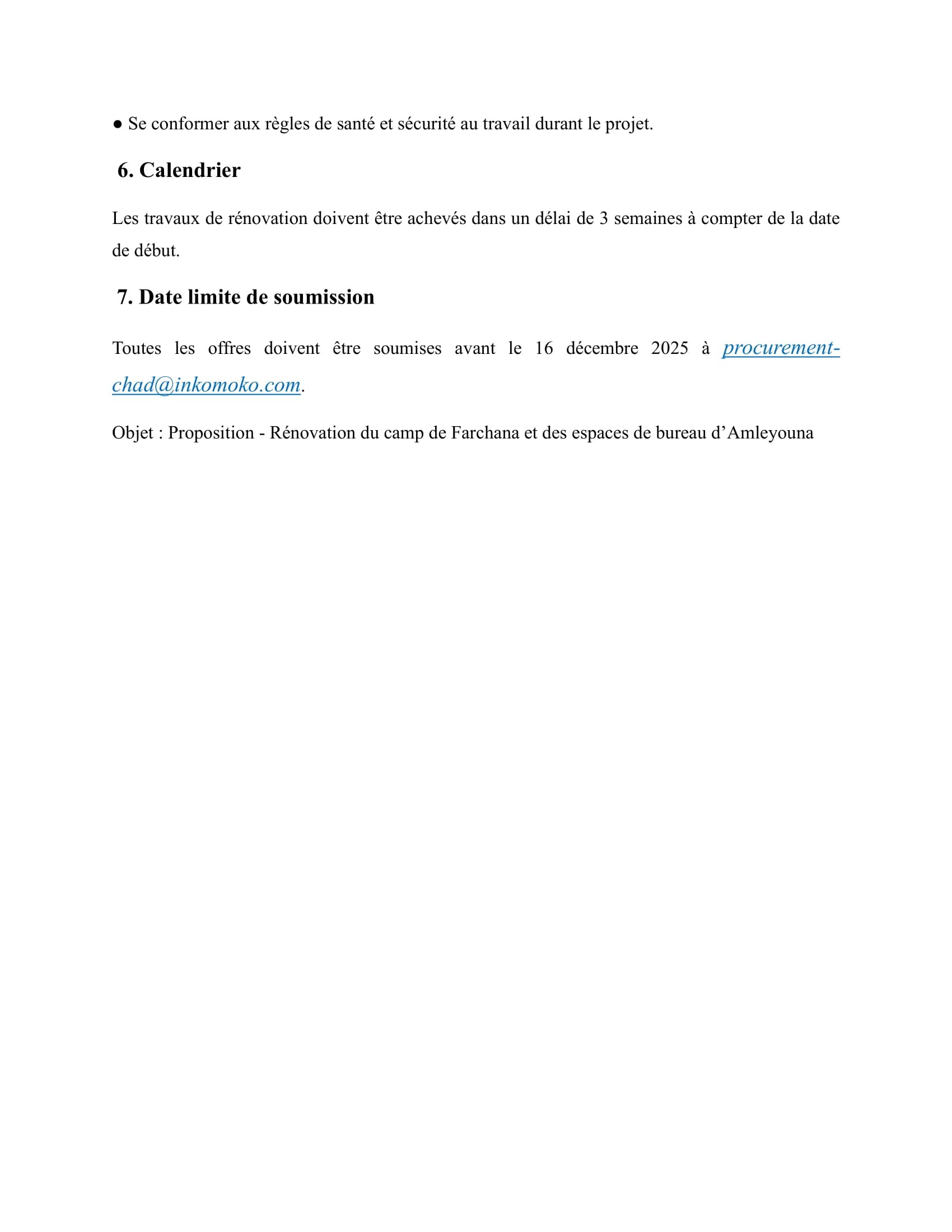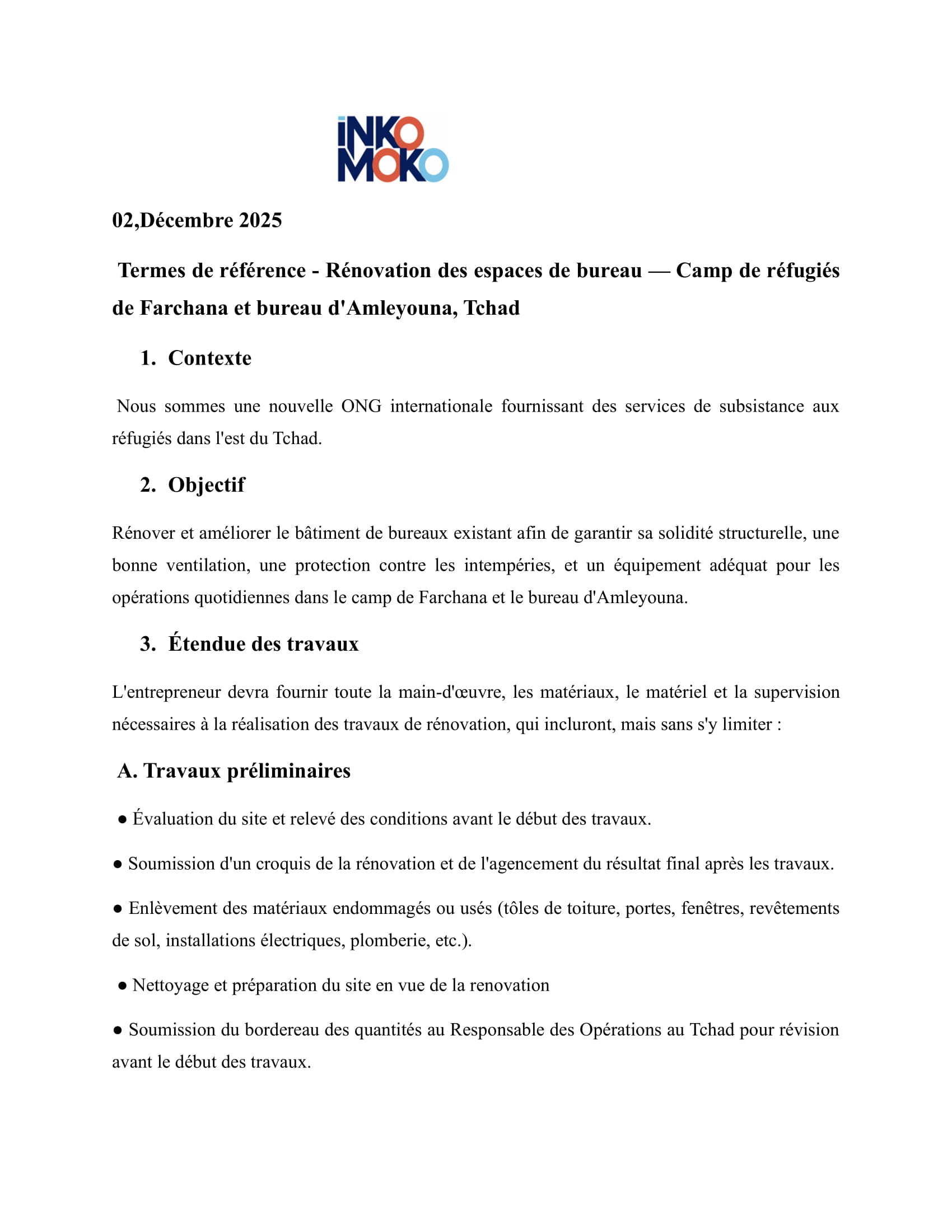 Accueil » Opportunités » Afrique » Tchad » Inkomoko lance un avis d’appel d’offres pour recruter un Entrepreneur pour la Rénovation des espaces de bureau – Camp de réfugiés de Farchana et bureau d’Amleyouna, Tchad
