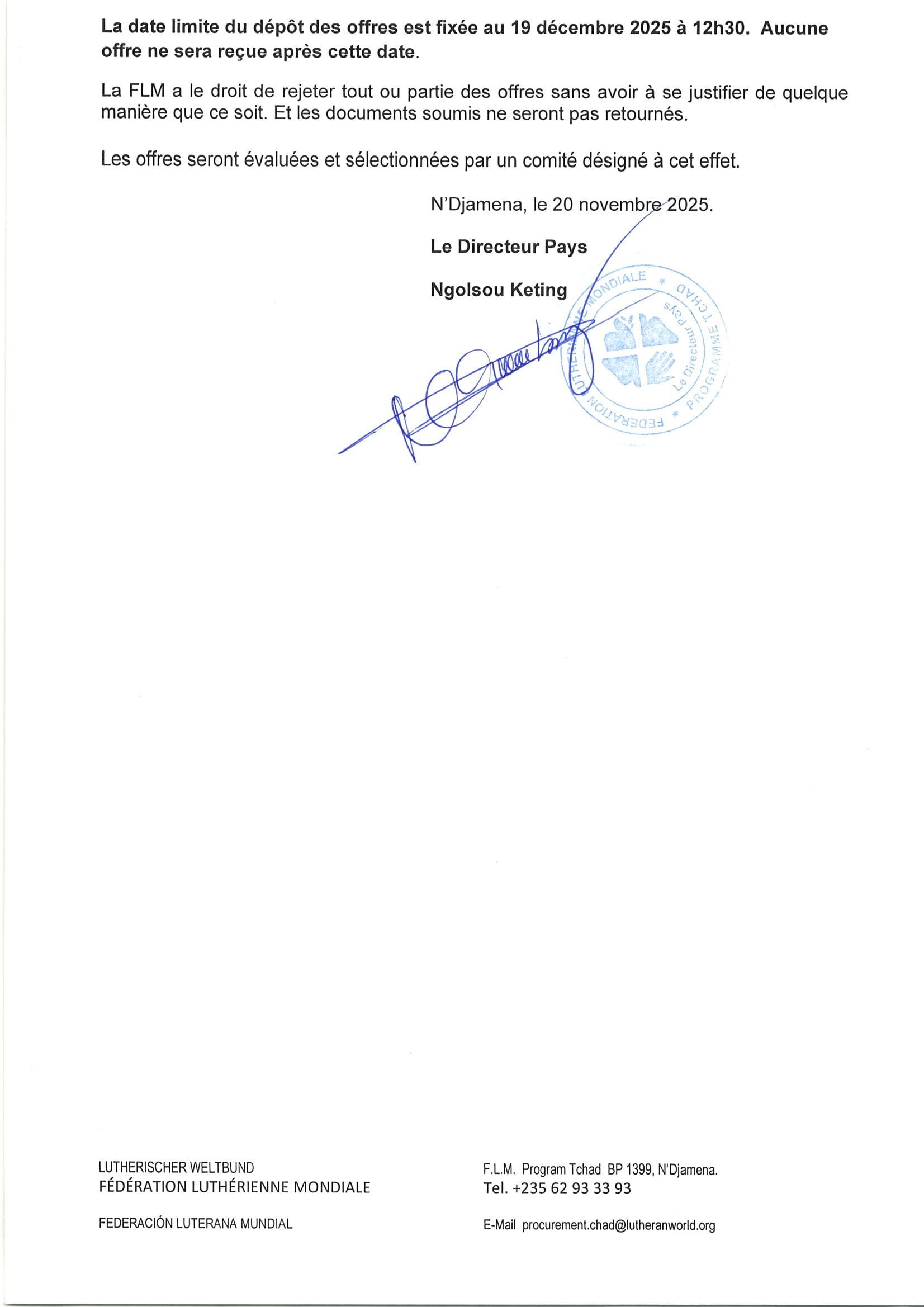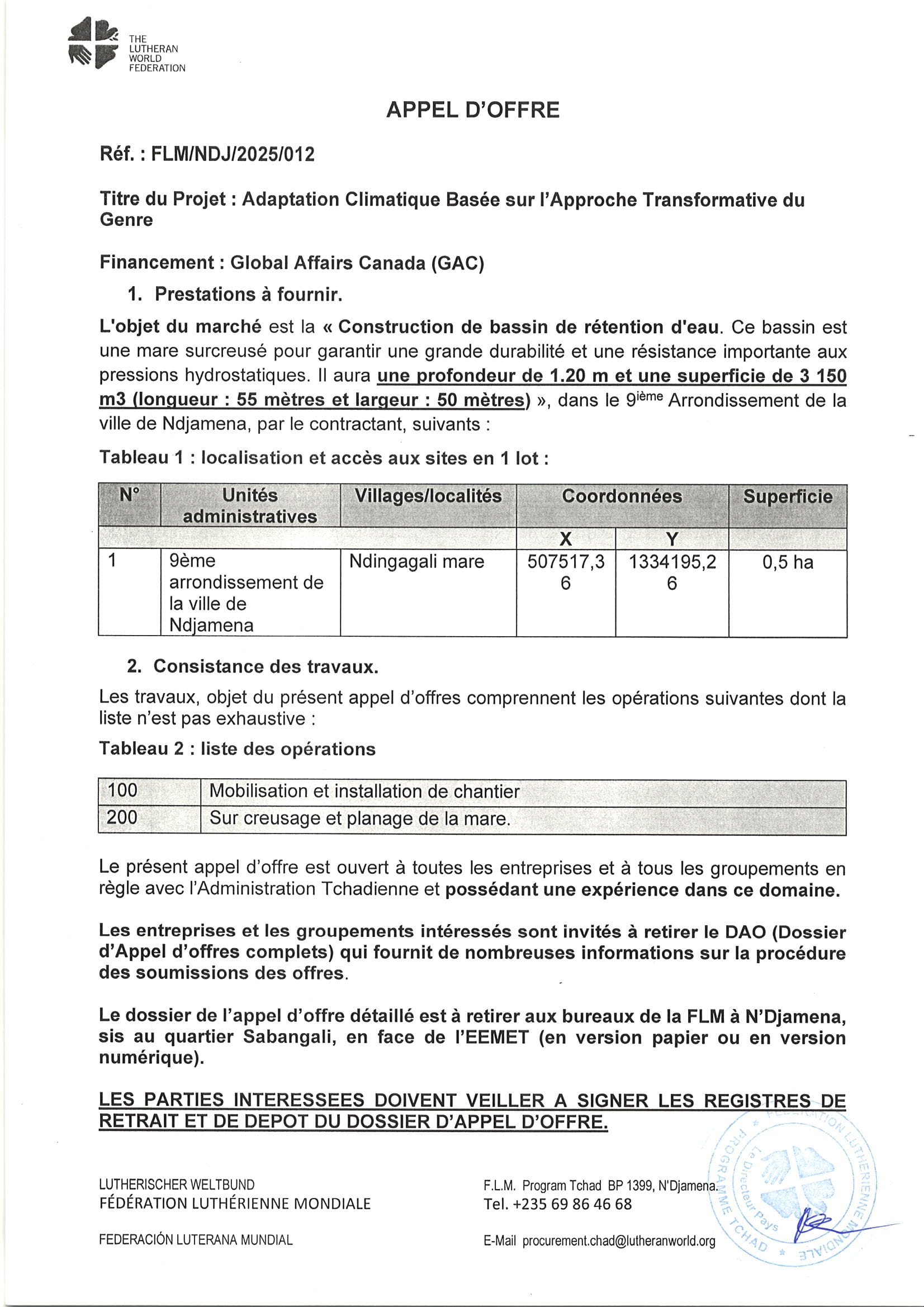 Accueil » Opportunités » Afrique » Tchad » La Fédération Luthérienne Mondiale (FLM) lance un avis d’appel d’offres pour le recrutement d’une Entreprise ou d’un Groupement pour les travaux de construction de Bassin de rétention d’eau dans la ville de N’Djamena, Tchad