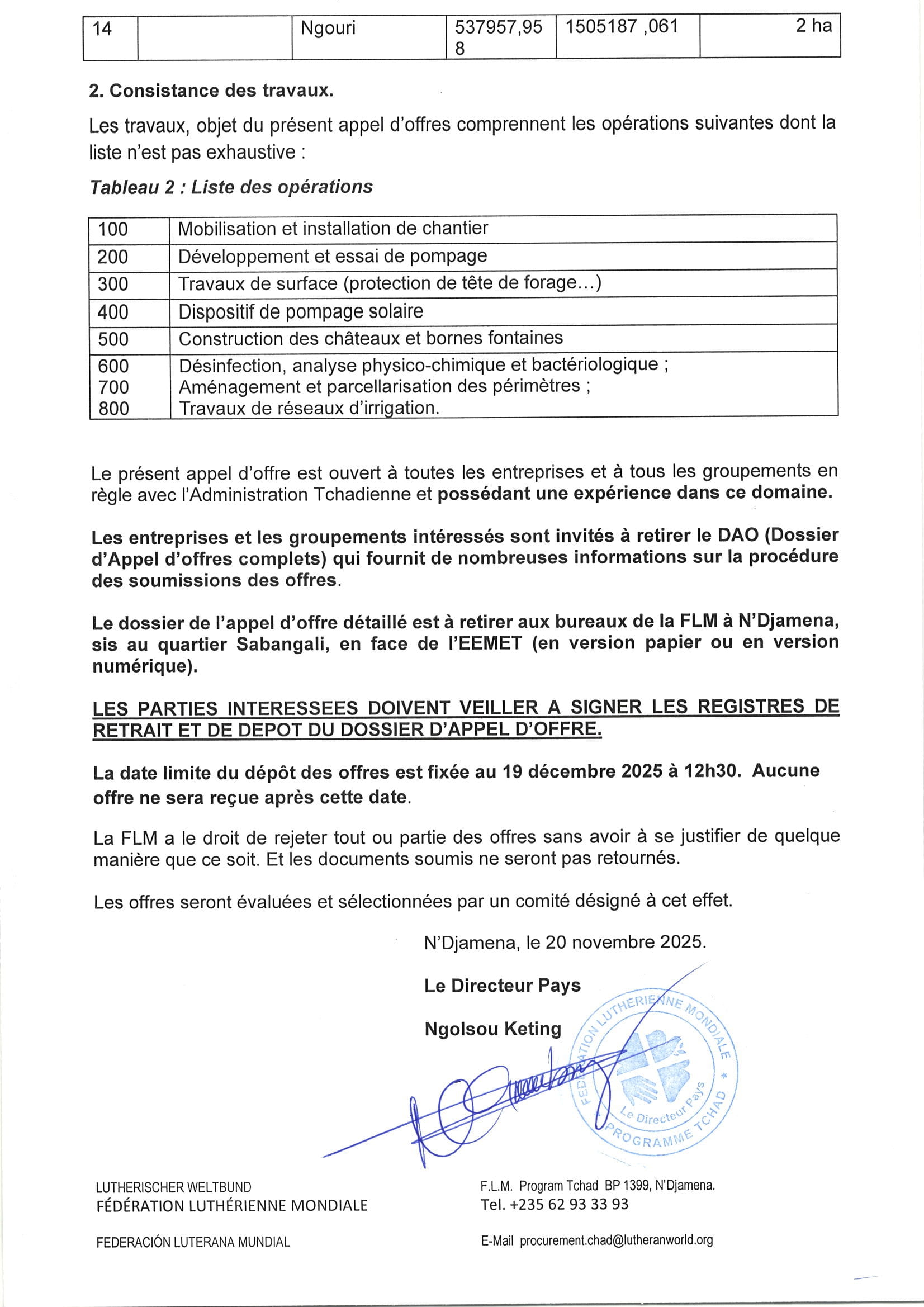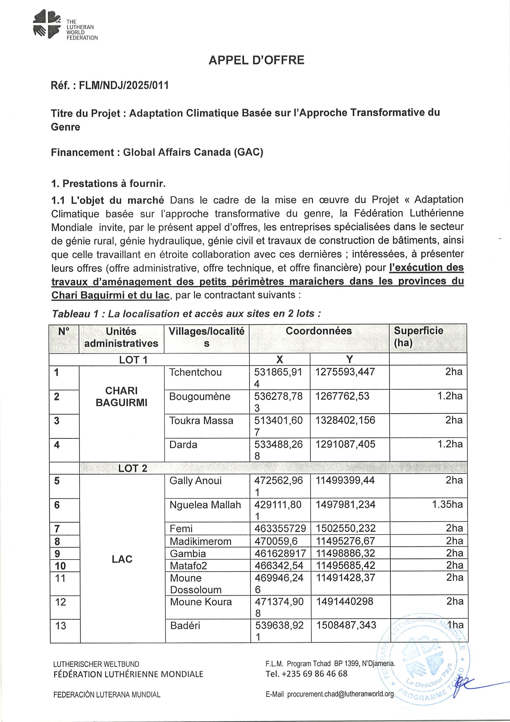 Accueil » Opportunités » Afrique » Tchad » La Fédération Luthérienne Mondiale (FLM) lance un avis d’appel d’offres pour le recrutement d’une Entreprise spécialisée pour les travaux d’aménagement des petits périmètres maraichers dans les provinces du Chari Baguirmi et le Lac, Tchad