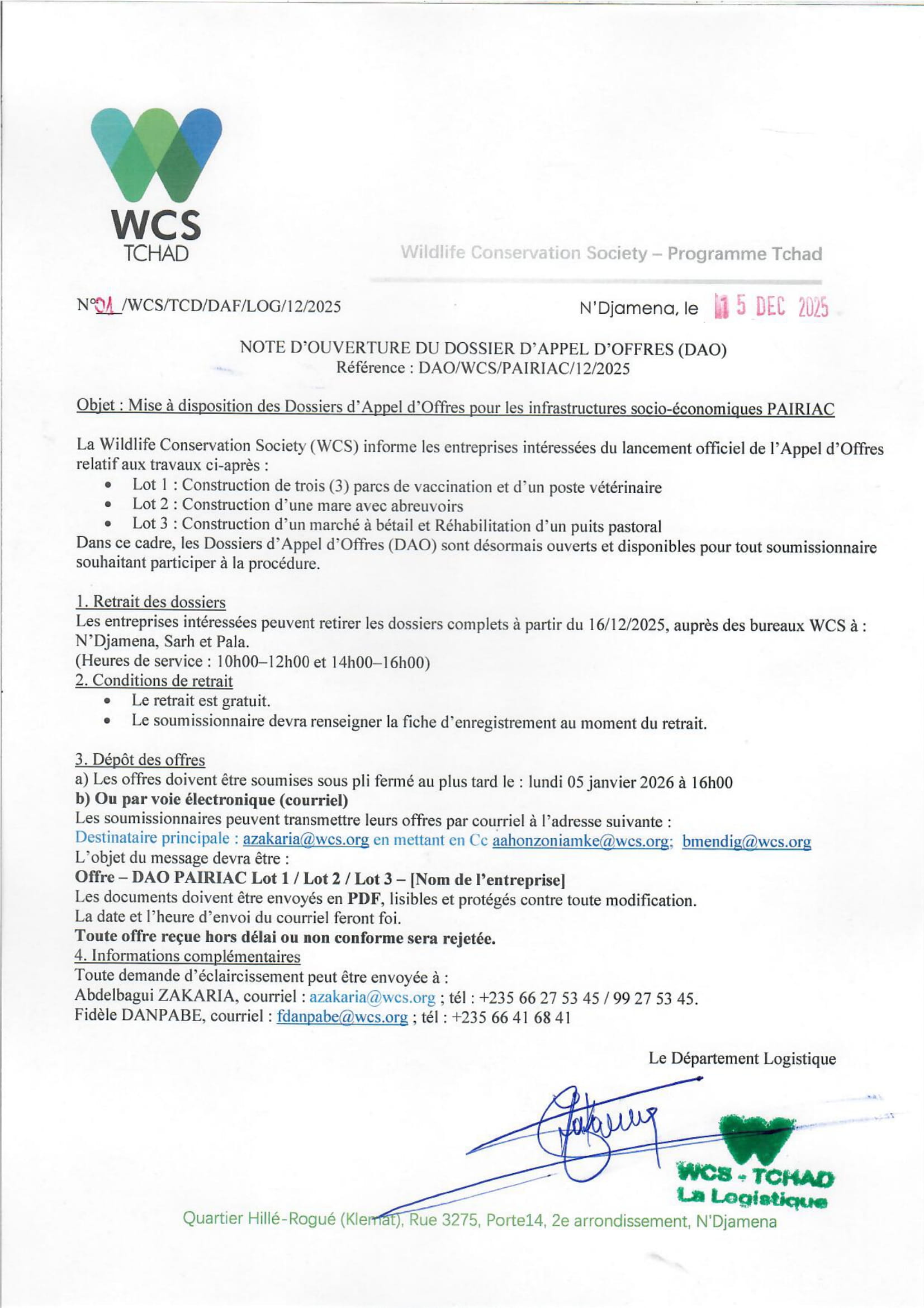 Accueil » Opportunités » Afrique » Tchad » La Wildlife Conservation Society (WCS) au Tchad lance un avis d’appel d’offres pour la sélection des Entreprises pour le réalisation des travaux suivants : Construction de trois (03) parc de vaccination et d’un poste vétérinaire, Construction d’une mare avec abreuvoirs, Construction d’un marché à bétail et réhabilitation d’un puits pastoral