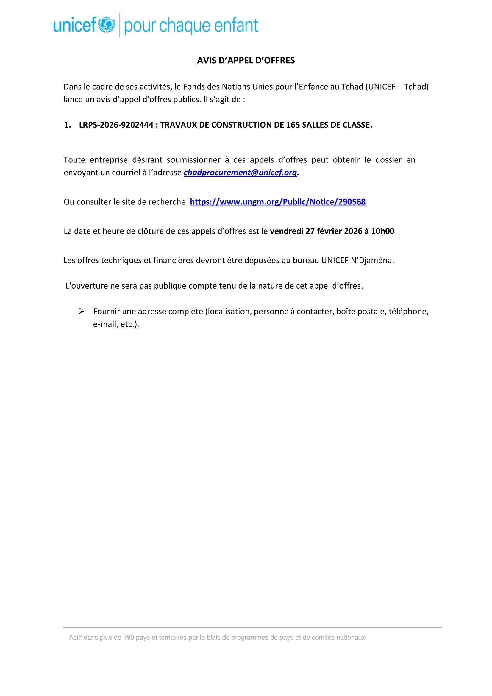 L’UNICEF annonce le lancement d’un avis d’appel d’offres en vue du recrutement d’une entreprise qualifiée pour la réalisation des travaux de construction de 165 salles de classe au Tchad