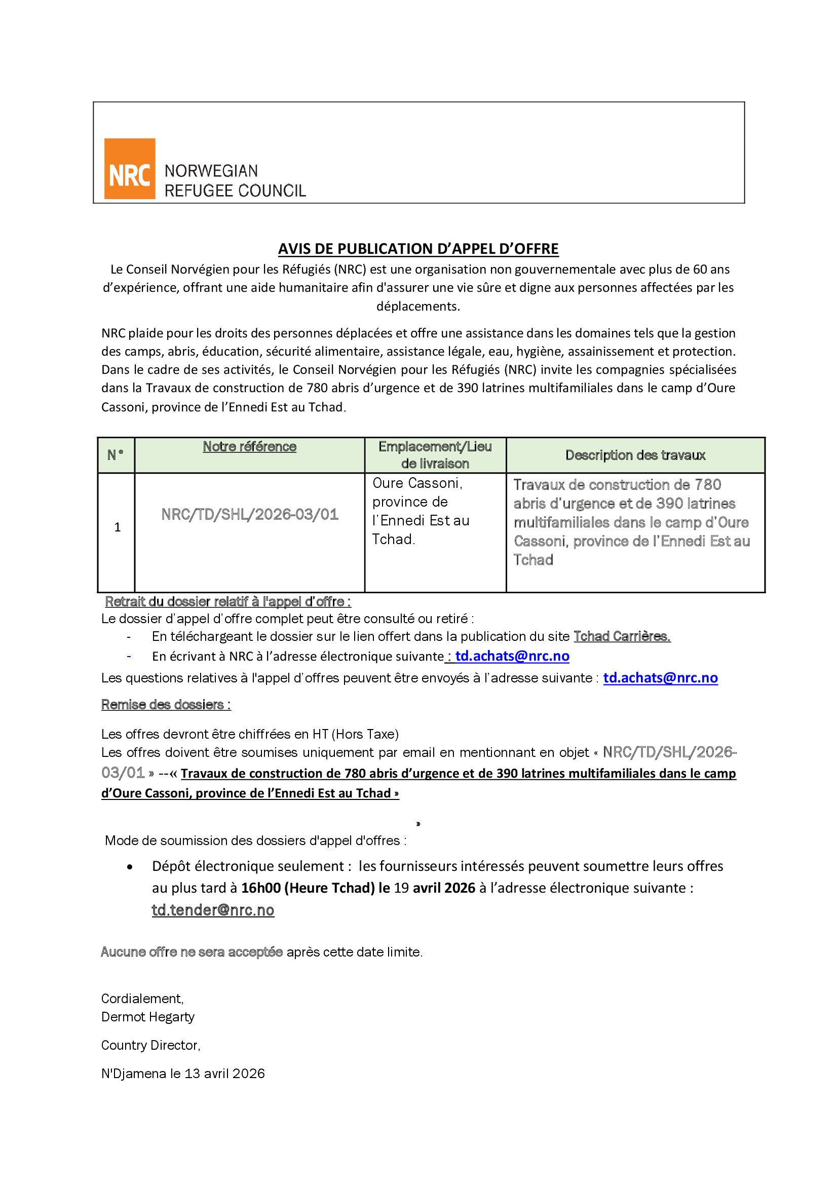 Accueil » Opportunités » Afrique » Tchad » NRC lance un appel d’offres pour la sélection de compagnies spécialisées en vue de la réalisation de travaux de construction de 780 abris d’urgence et 390 latrines multifamiliales dans le camp d’Oure Cassoni, situé dans la province de l’Ennedi Est au Tchad