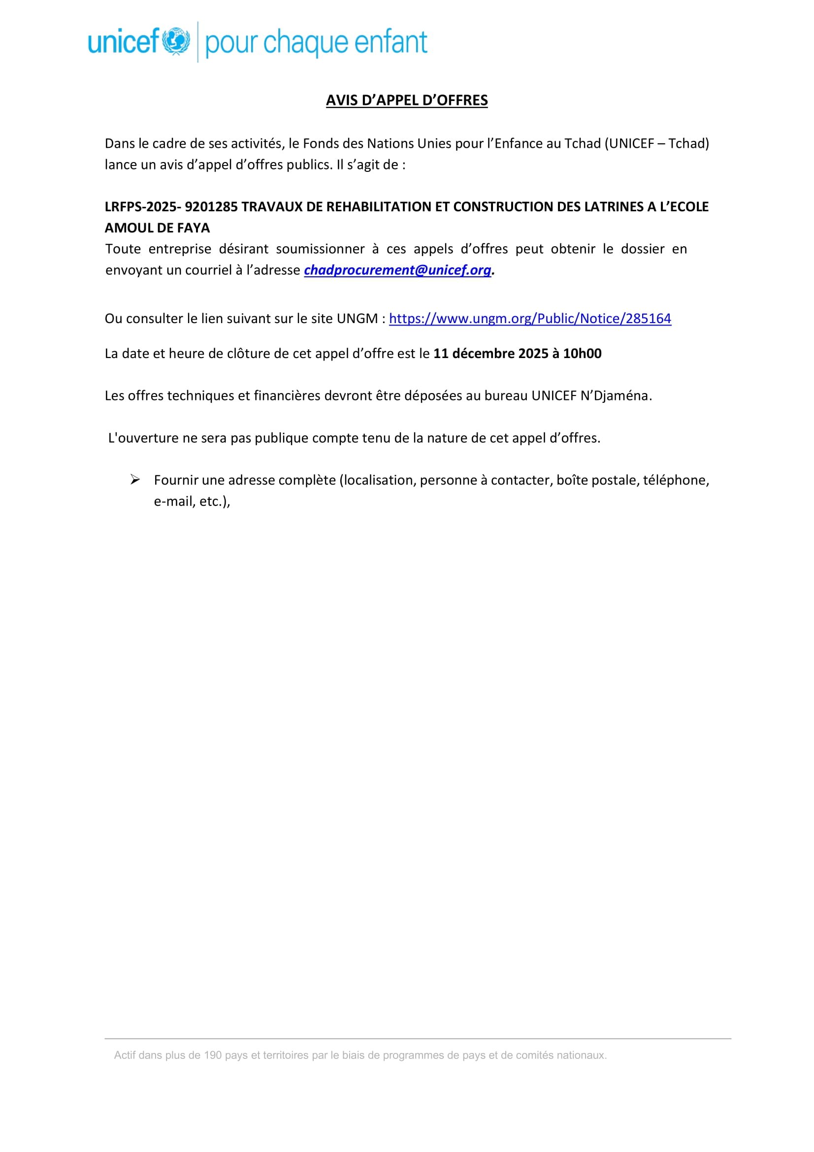 Accueil » Opportunités » Afrique » Tchad » UNICEF lance un avis d’appel d’offres pour les travaux de réhabilitation et construction des latrines à l’école Amoul de Faya, Tchad