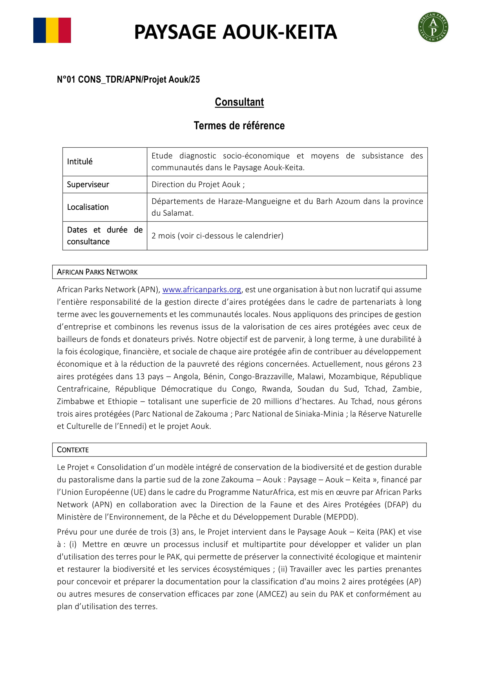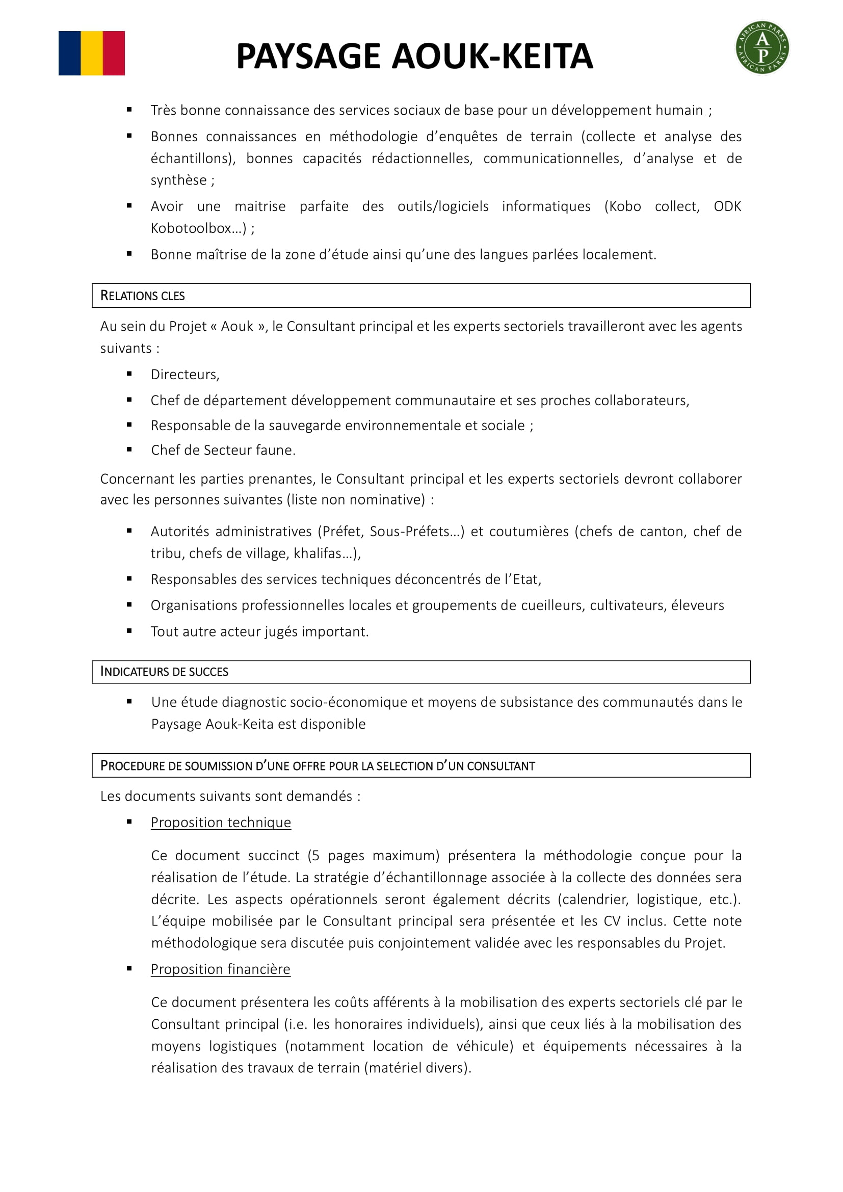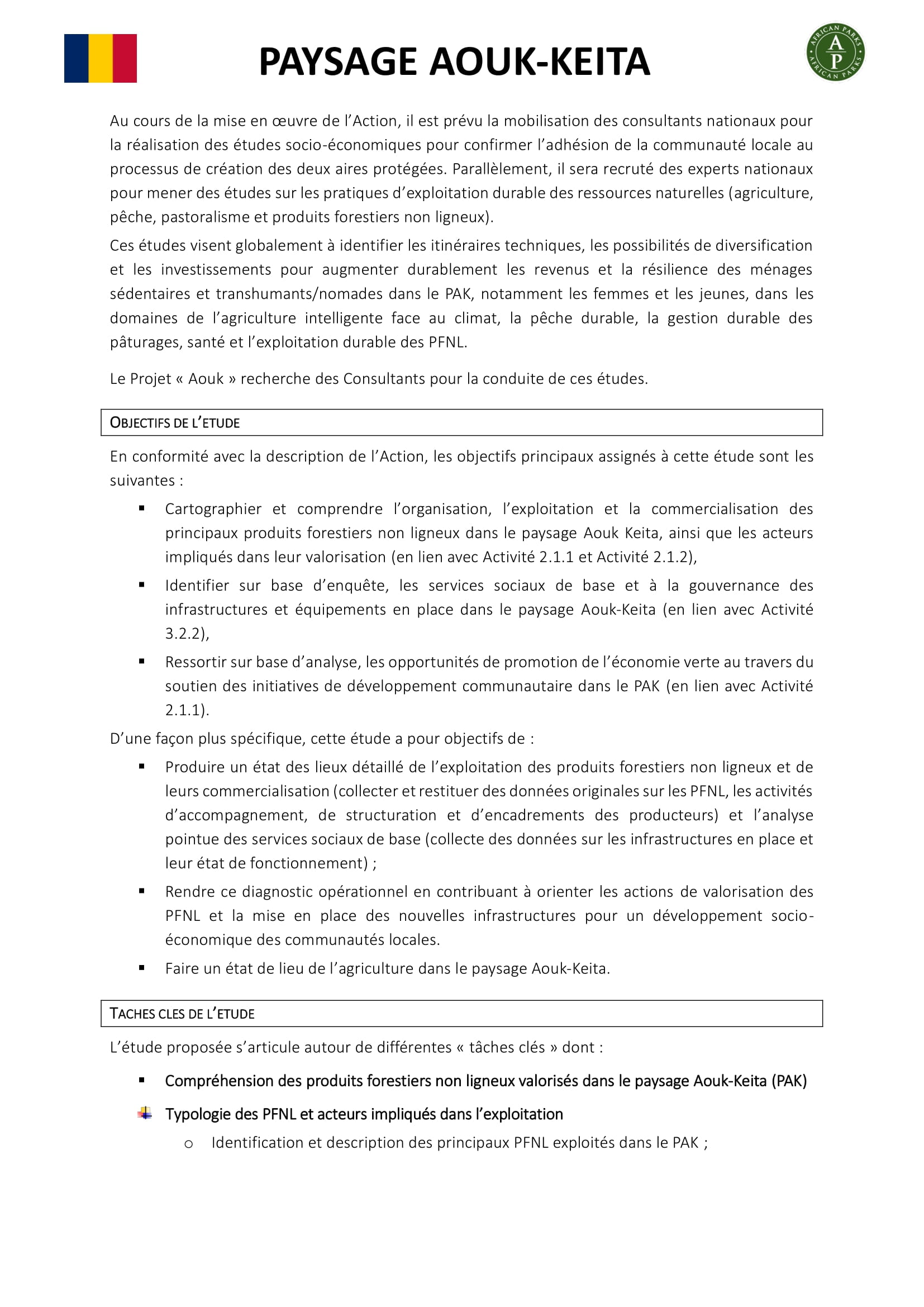 African Parks lance un avis d’appel d’offres pour la sélection d’un Consultant pour une Etude diagnostic socio-économique et moyens de subsistance des communautés dans le paysage Aouk-Keita, Tchad