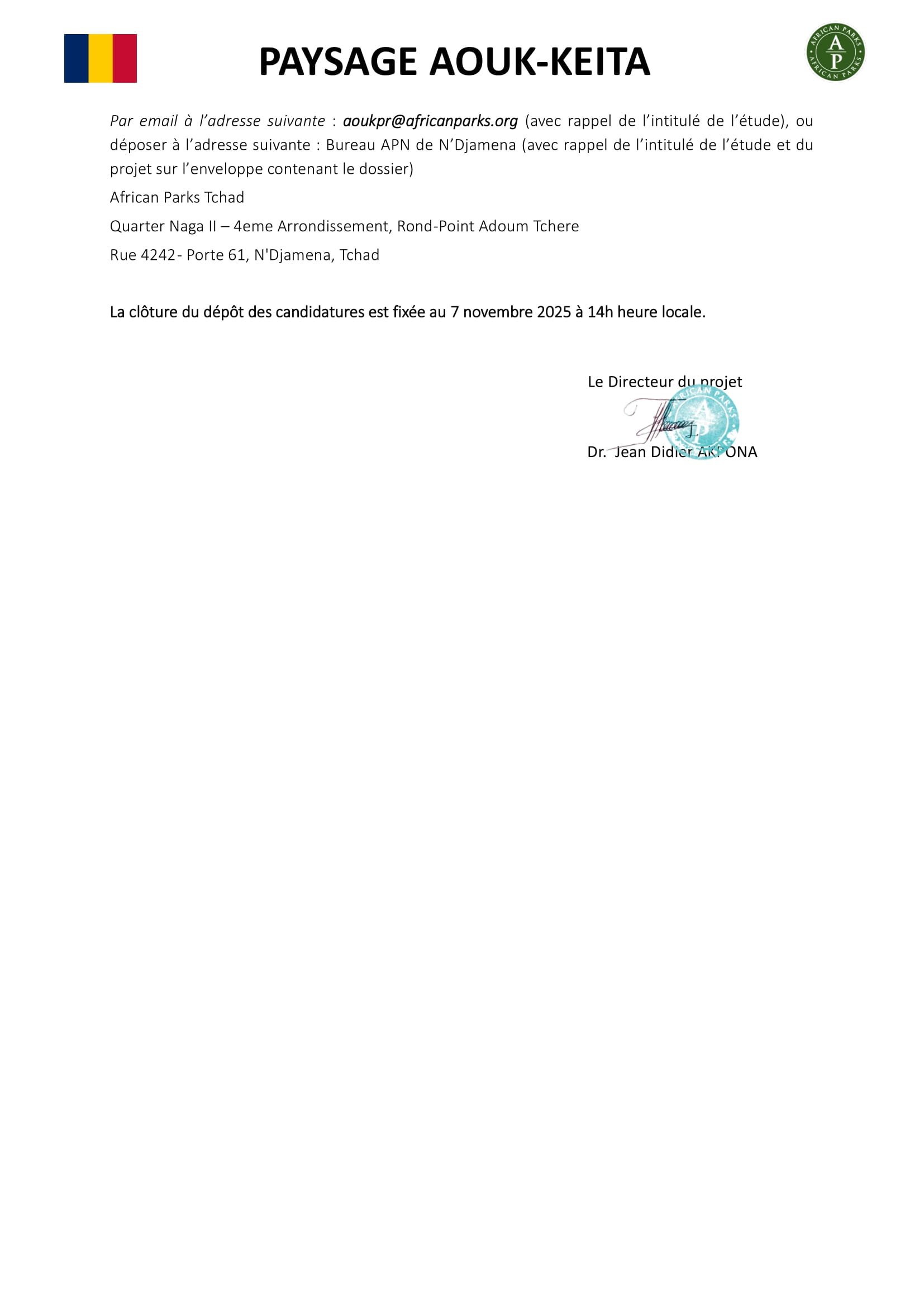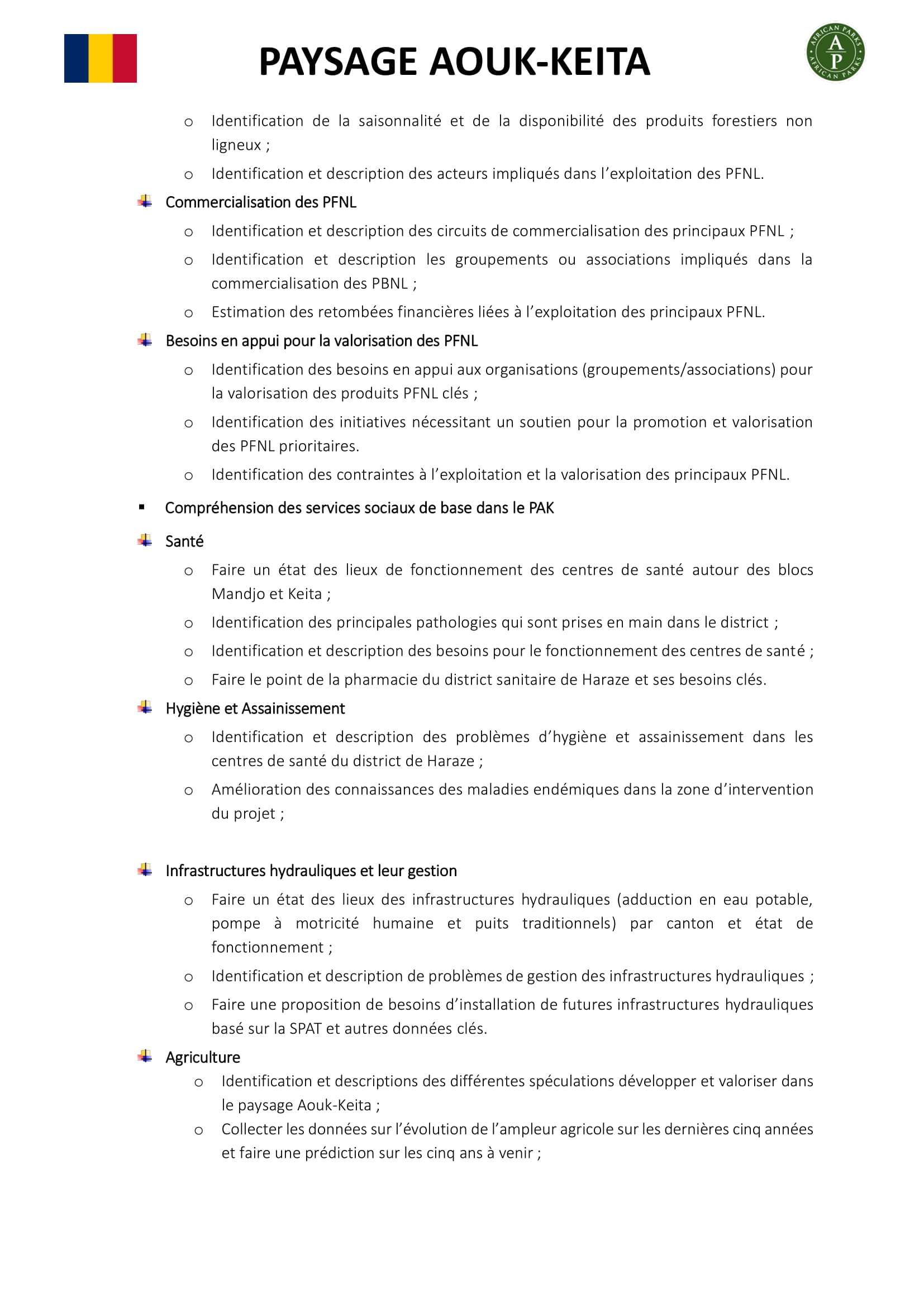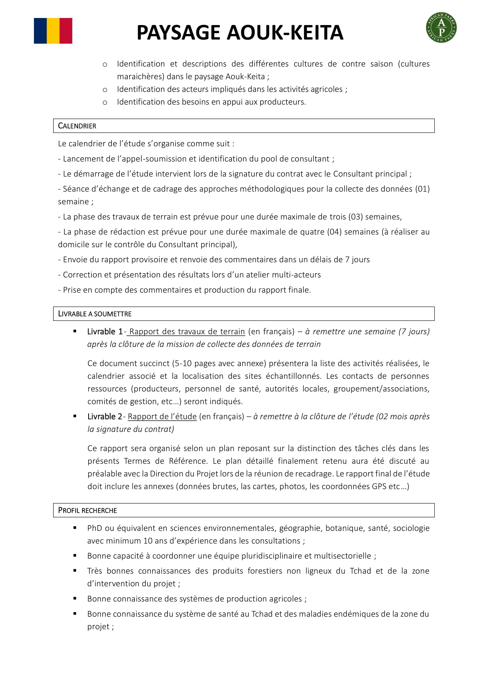 African Parks lance un avis d’appel d’offres pour la sélection d’un Consultant pour une Etude diagnostic socio-économique et moyens de subsistance des communautés dans le paysage Aouk-Keita, Tchad