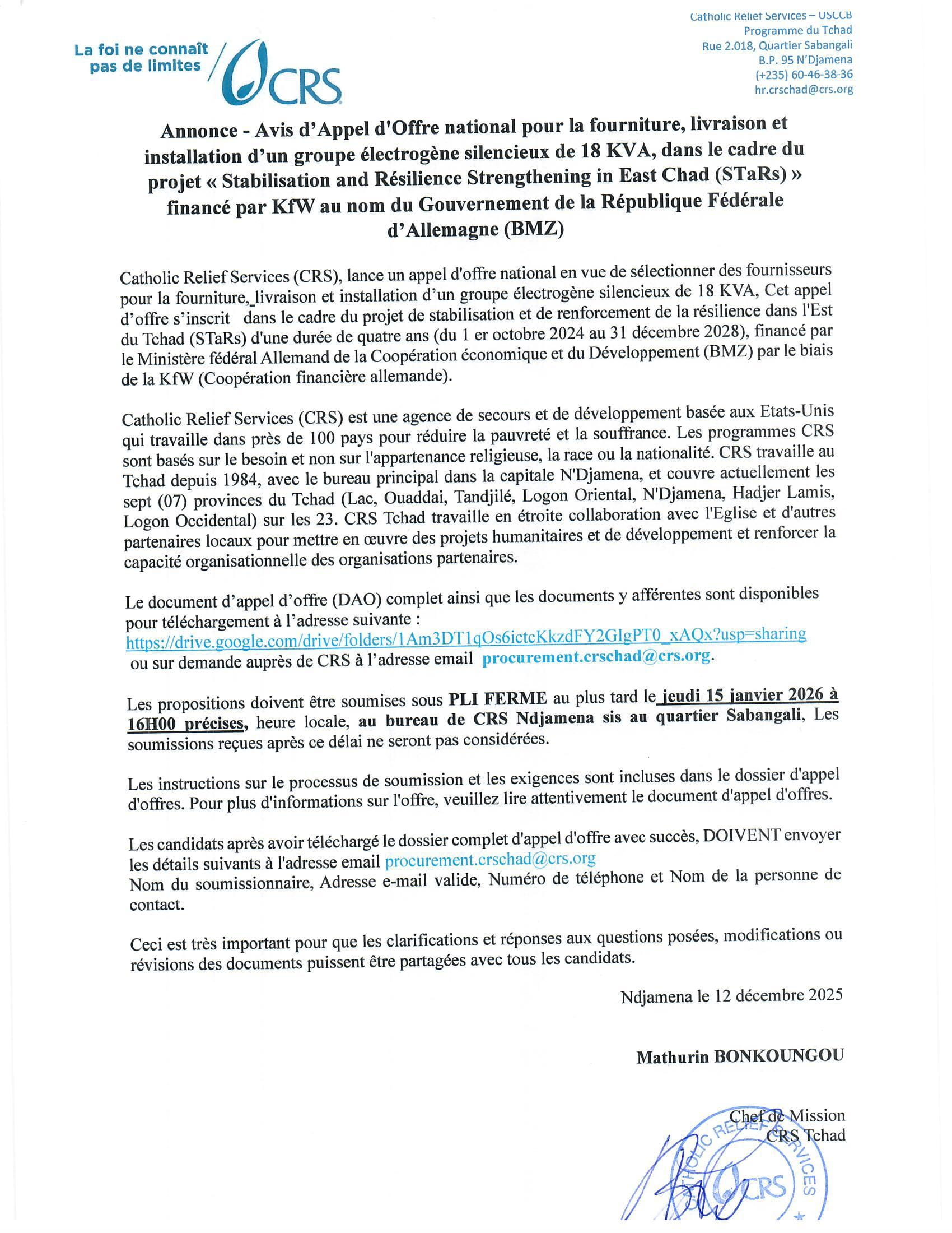 Catholic Relief Services (CRS) lance un avis d’appel d’offre national pour la fourniture, la livraison et l’installation d’un Groupe Electrogène silencieux de 18 KVA, Tchad