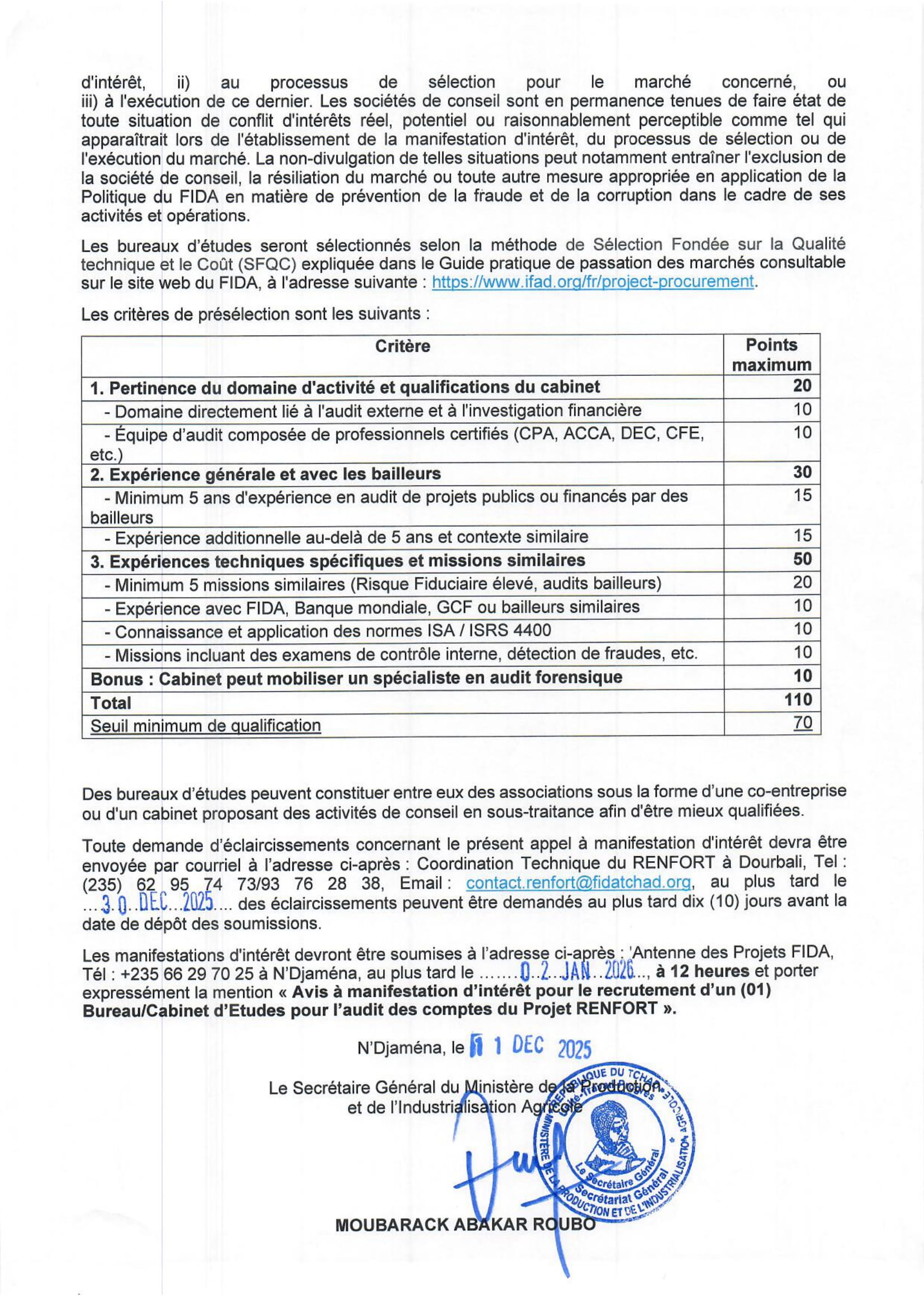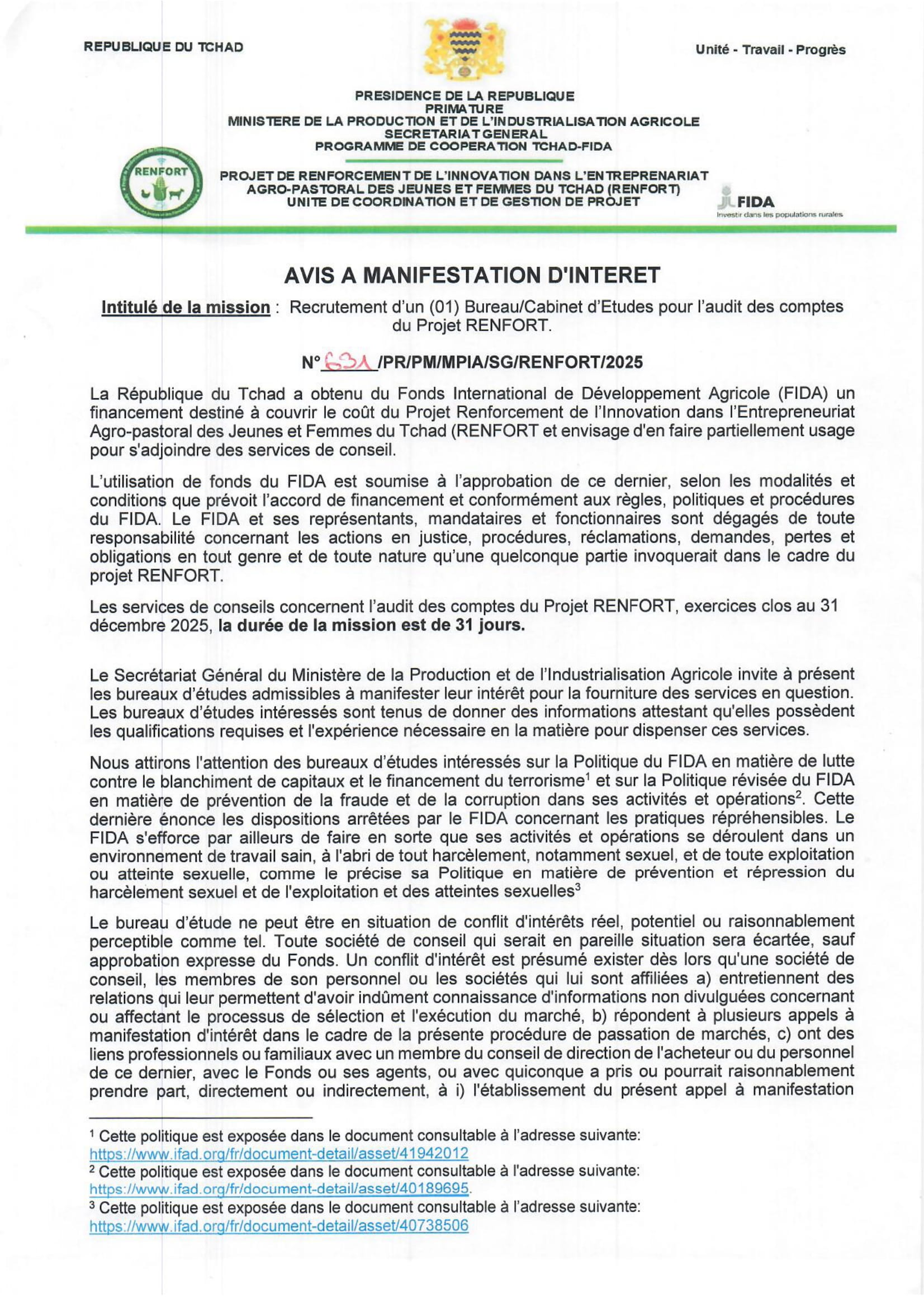 Accueil » Opportunités » Afrique » Tchad » Avis d’appel d’offres pour le recrutement d’un Bureau/Cabinet d’Etudes pour l’audit des comptes du projet RENFORT, Tchad
