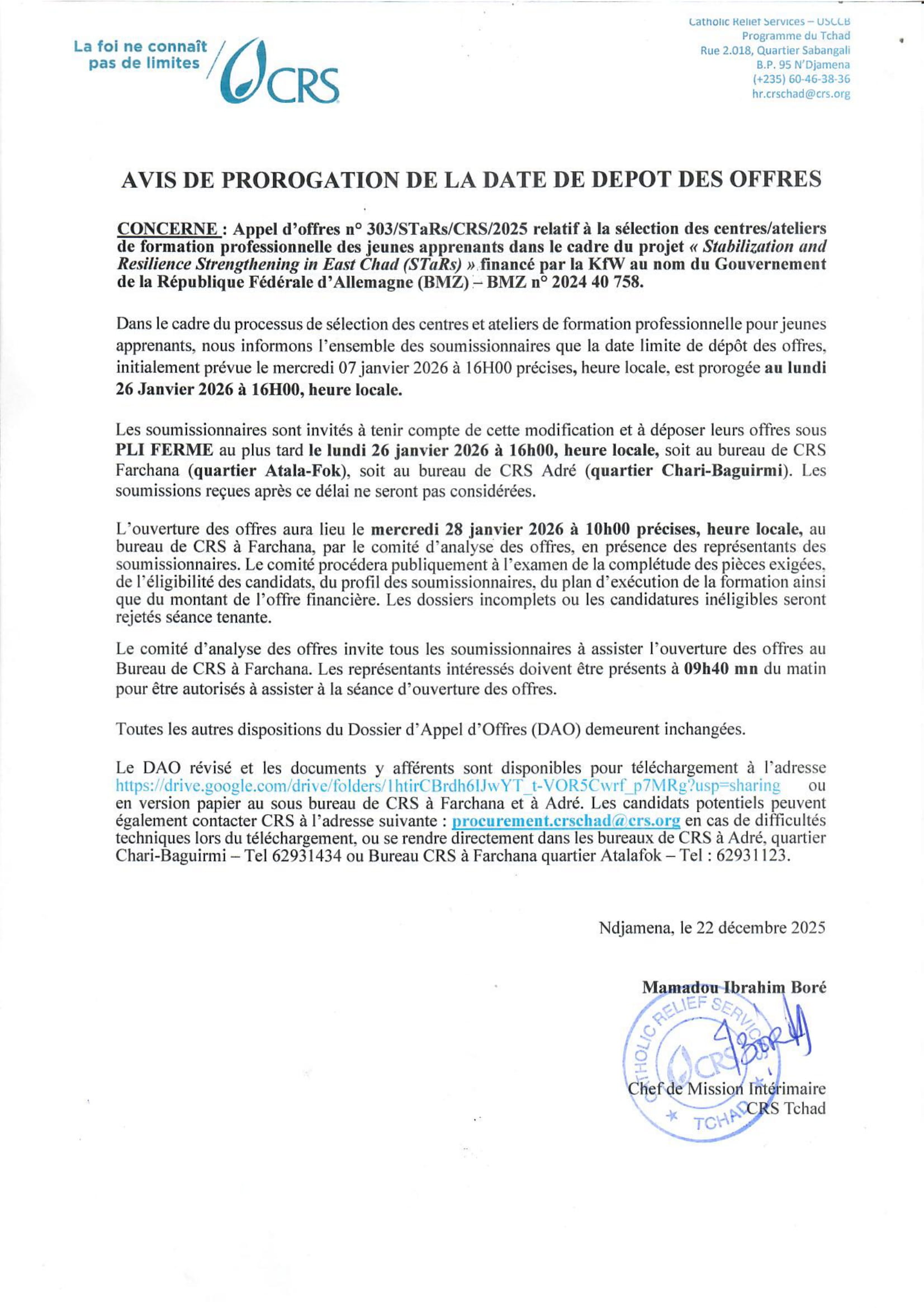 Accueil » Opportunités » Afrique » Tchad » Catholic Relief Services (CRS) lance un avis d’appel d’offres pour la sélection des centres/ateliers de formation professionnelle des jeunes apprenants dans le cadre du projet STaRs, Tchad